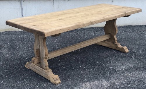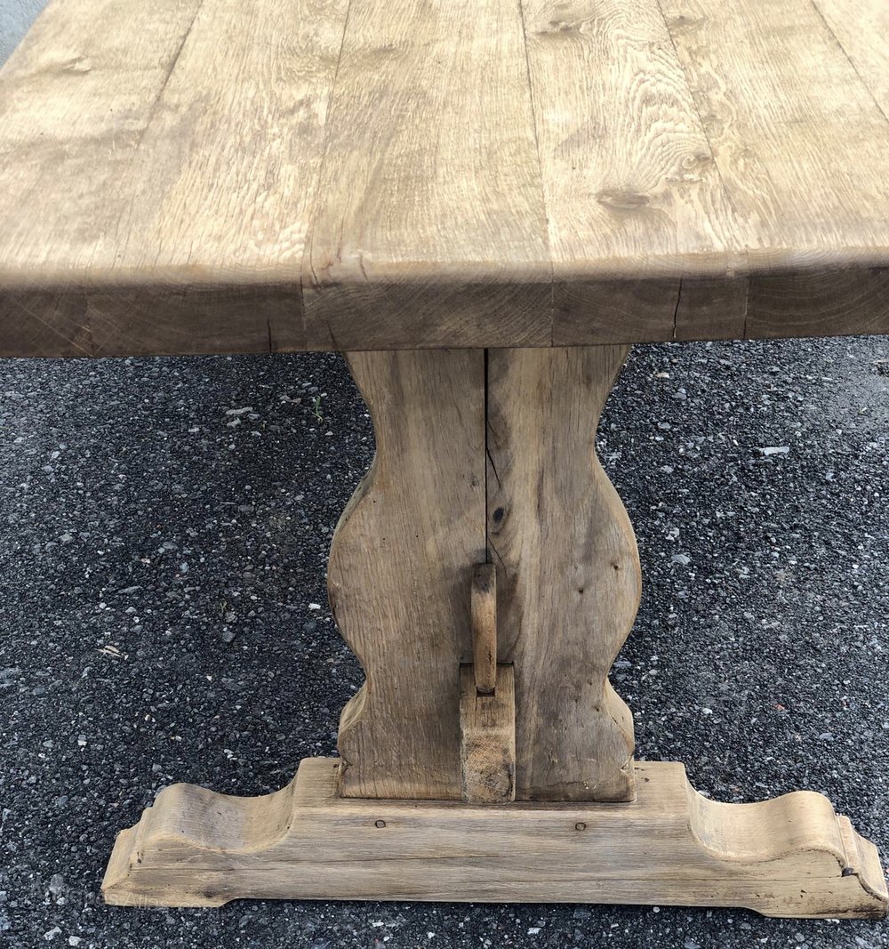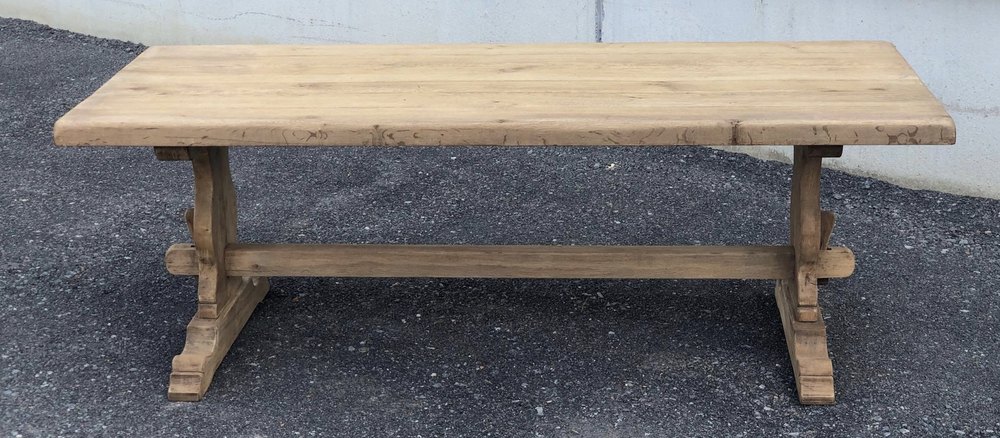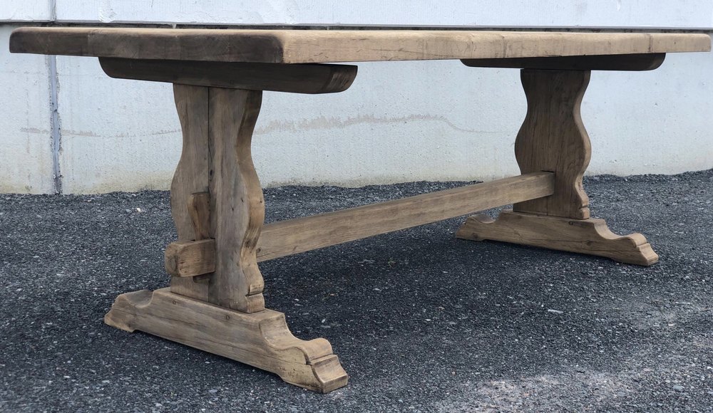 A solid Oak Refectory Farmhouse Kitchen Dining Table. Dating to the mid 19th Century and French in origin. Lovely pegged joints and very rustic in nature. We have bleached the table for that modern look but it can be waxed to any shade if so desired.