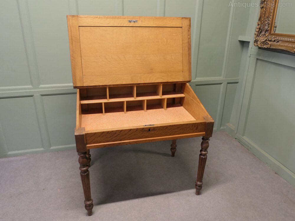 The top of the desk is a large writing slope with storage inside the lift up top, the storage includes a large flat area for menus etc. and 9 pigeon holes, at the very top there is a serving shelf