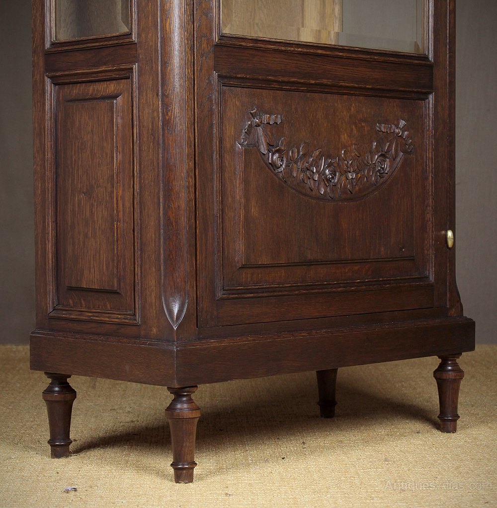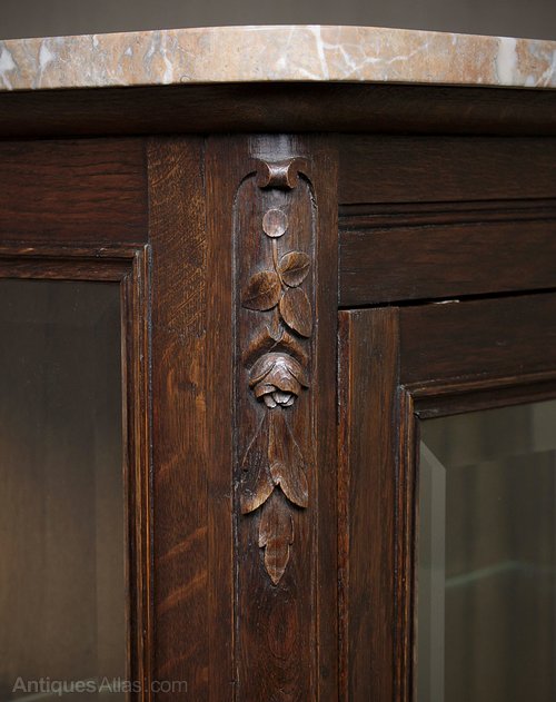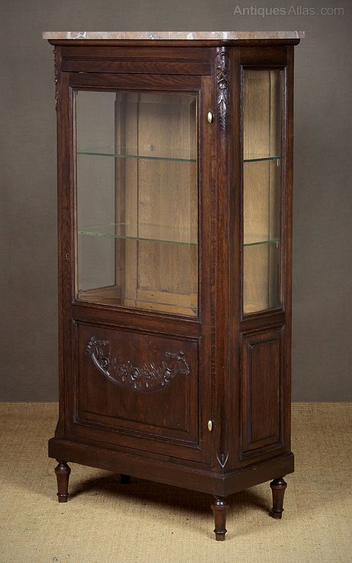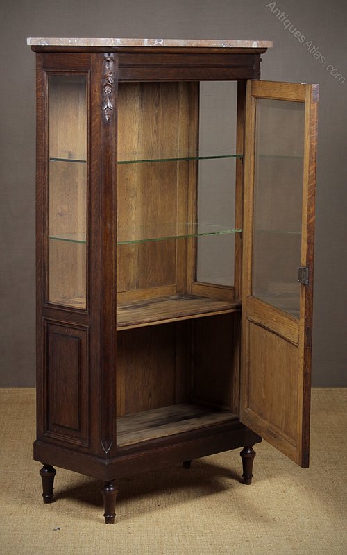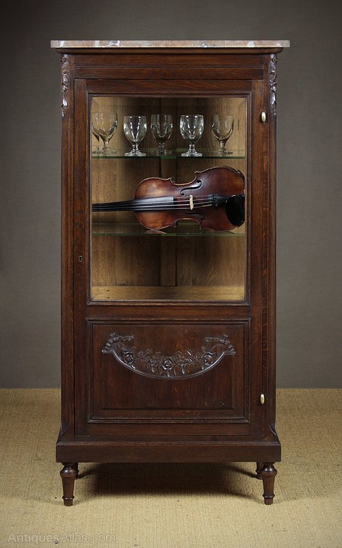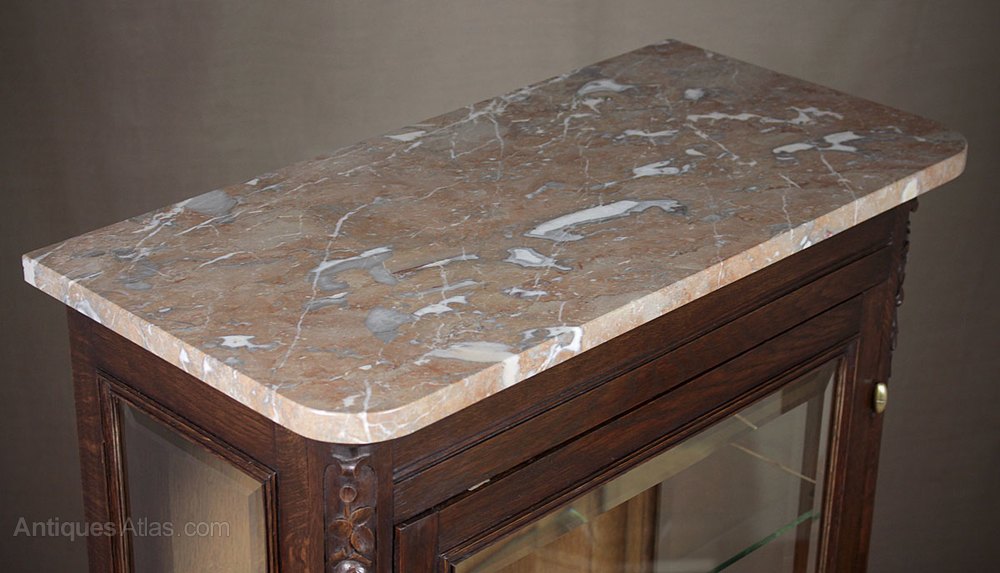 Small French marble top oak vitrine or display cabinet c.1930. Attractively figured pink marble top over a single door cabinet with glazed top and two glass shelves over a useful blind cupboard in the base. Crisply carved floral detail, raised and fielded panels and bevelled glazing. On short turned legs to the front and rear. Excellent condition, cleaned and waxed in our workshops.