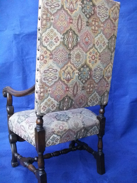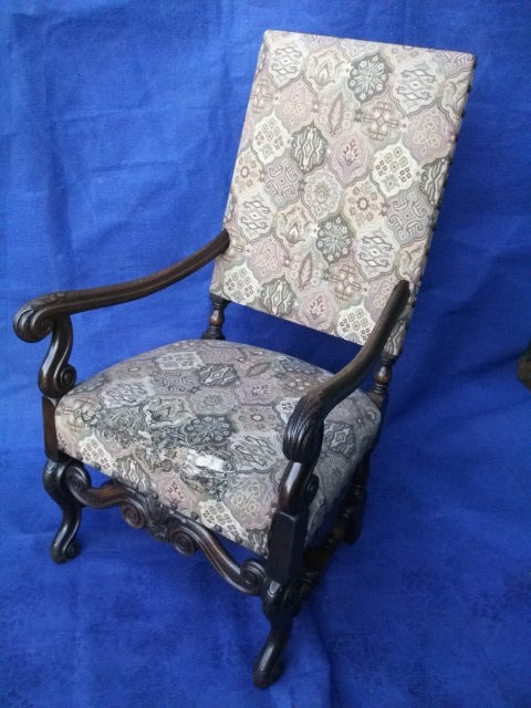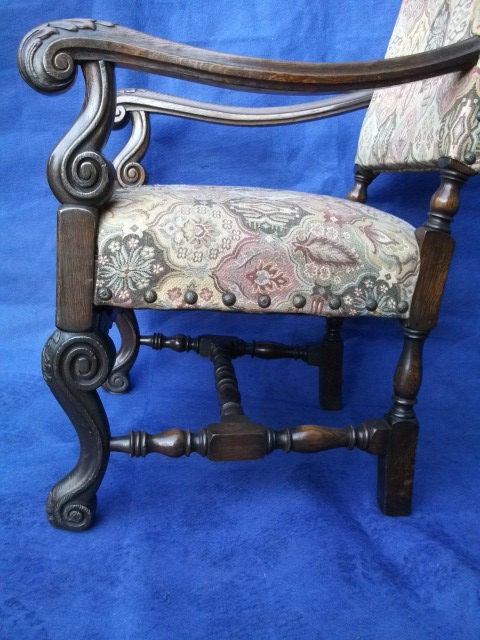 A good french oak carolean open armchair in excellent condition, fabric worn.