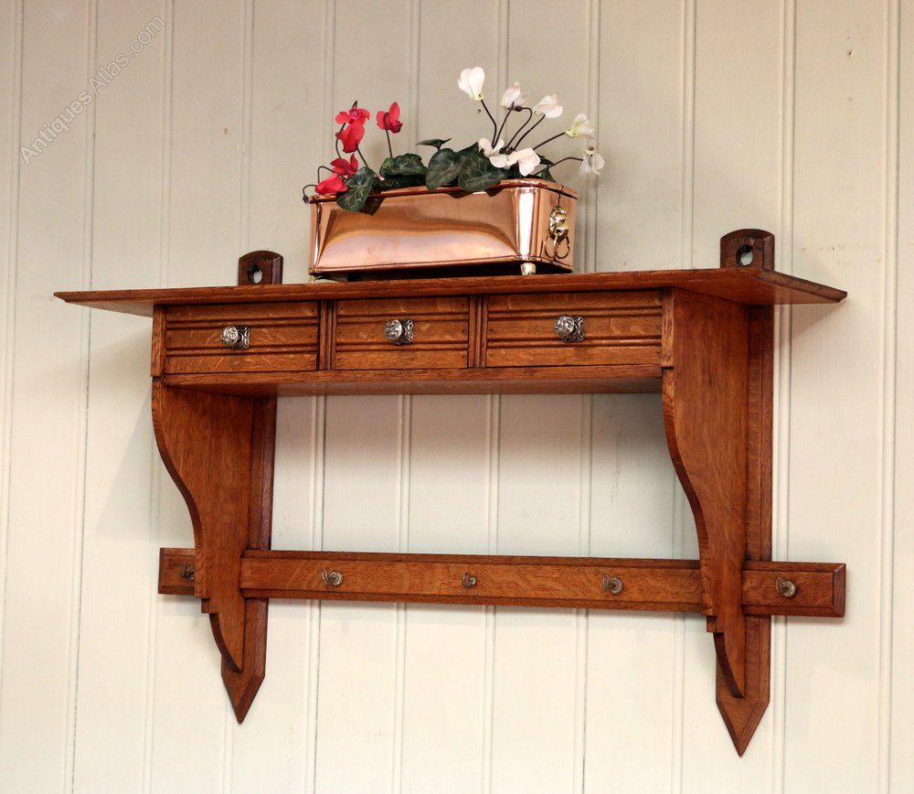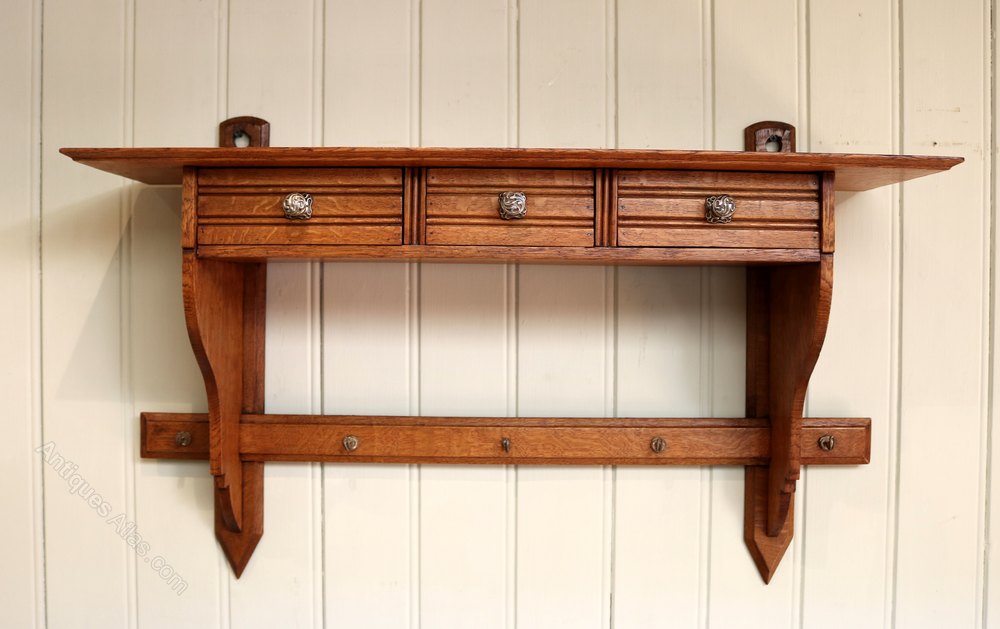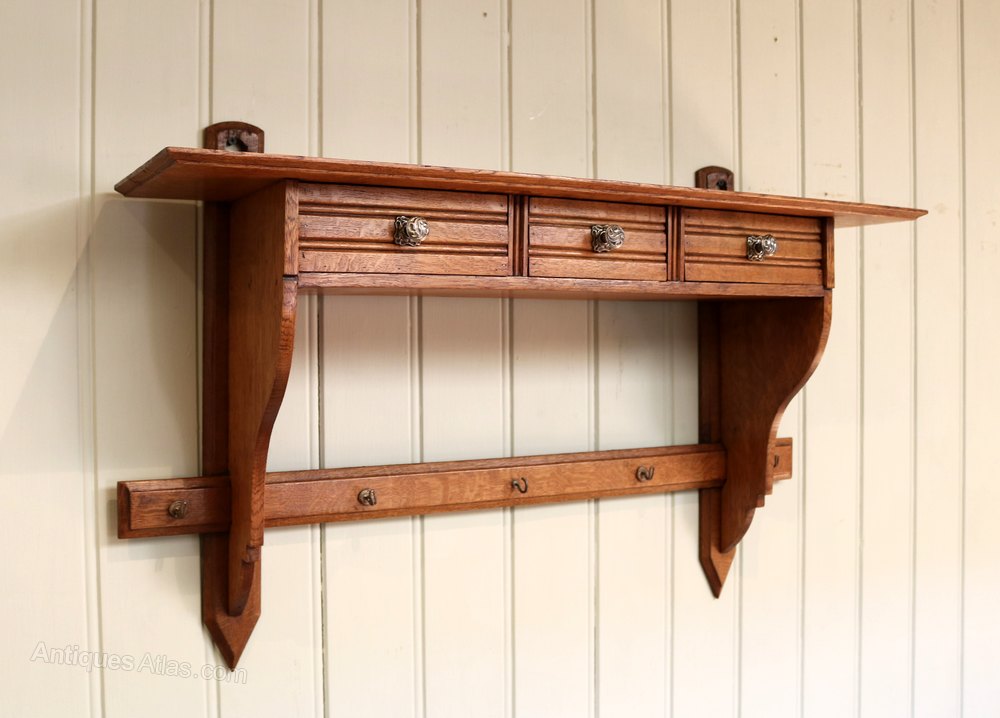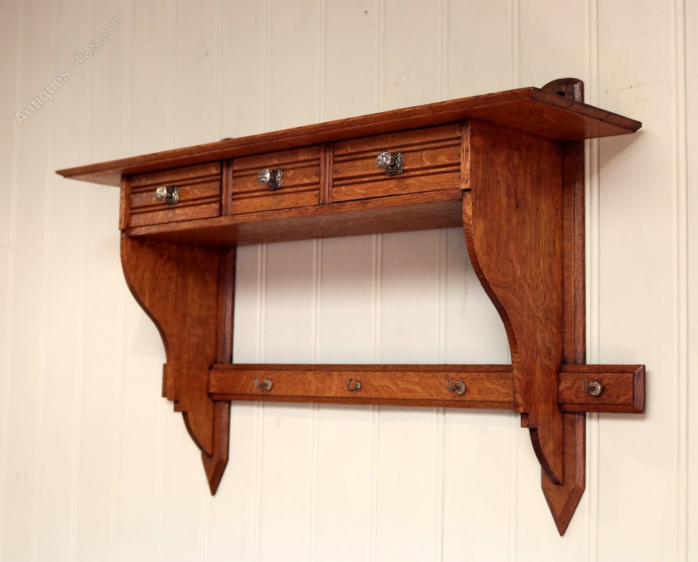 Well proportioned French oak wall shelf having three drawers with a row of five coat hooks below