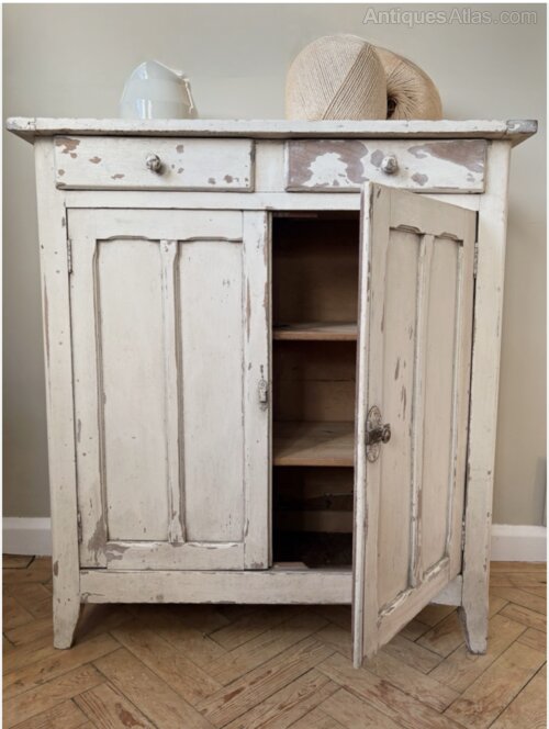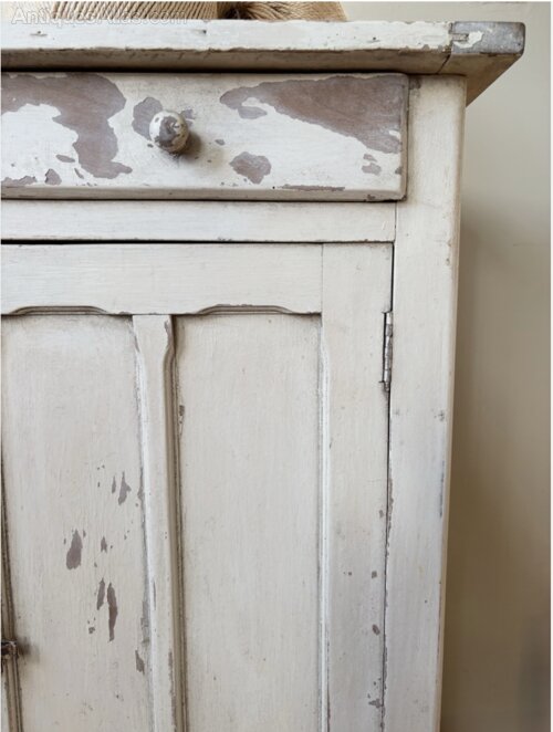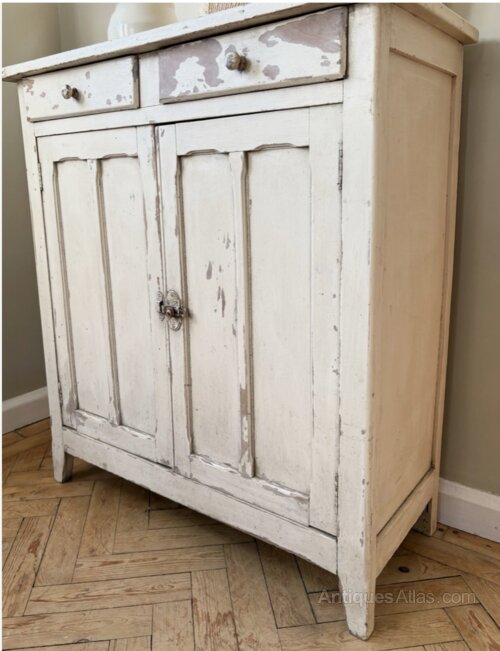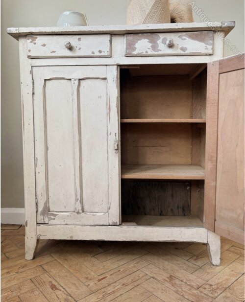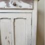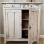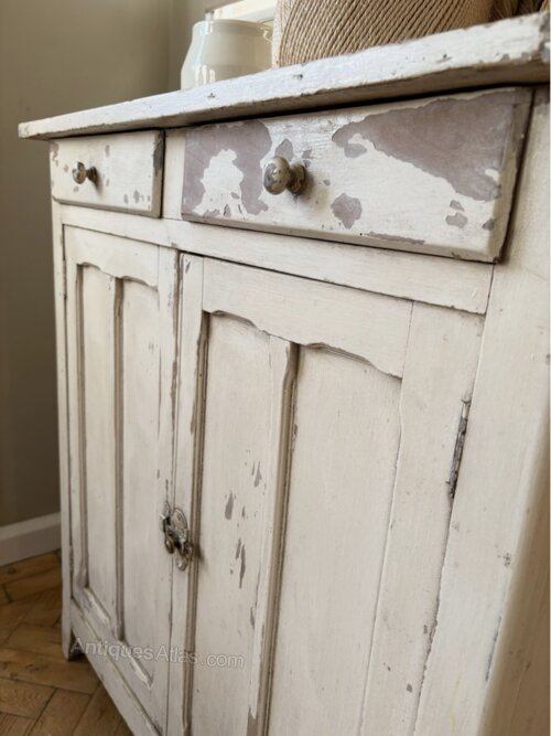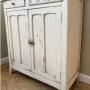 A fabulous authentic French buffet cupboard in distressed off white chippy paintwork. Good solid condition with a small section replaced at the back not affecting its use. Two Internal shelves and double drawers on this useful storage addition. Original lock retained for its character although its doors are not aligned meaning it does not clasp together easily.