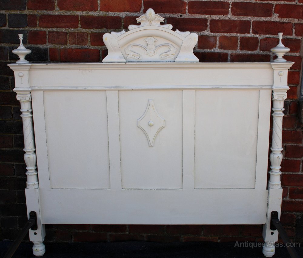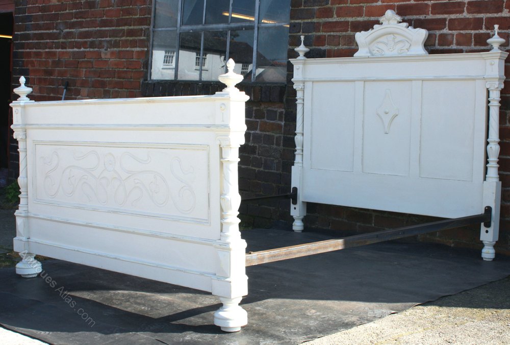 The French bed is very decorative and heavy. It was made around 1900 and is wonderfully carved with turned pillars, a carved crest to the headboard and carved floral decoration to the footboard. The crest is monogrammed J B. The bed has turned finials and feet. It is painted white and this may be the original paint.