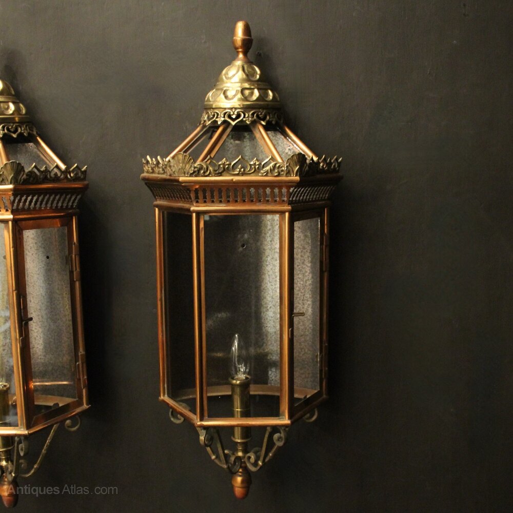 A French pair of gilded brass & copper single arm half wall lanterns, the elongated single light fitting, issuing from a curved steel backplate, surrounded by a three glass panels with one access door to right and held within a lovely brass and copper framework with decorative pierced canopy and acorn finial and terminal, great size and patination. These have a slight curve to the backplate. Fully rewired and PAT tested. All our wall lights come with aged brass screws for fixing and spare bulbs. We have 4 pairs available.