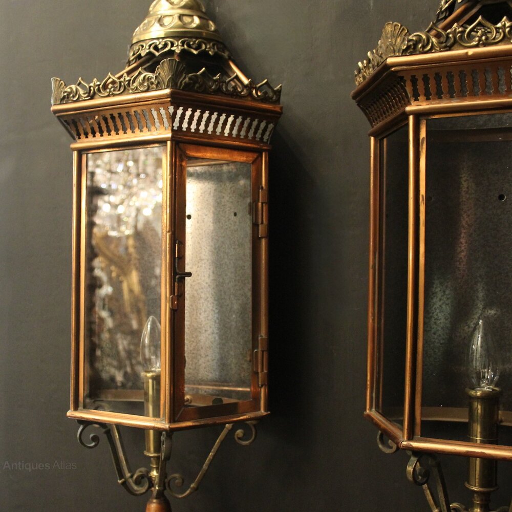 A French pair of gilded brass & copper single arm half wall lanterns, the elongated single light fitting, issuing from a curved steel backplate, surrounded by a three glass panels with one access door to right and held within a lovely brass and copper framework with decorative pierced canopy and acorn finial and terminal, great size and patination. These have a slight curve to the backplate. Fully rewired and PAT tested. All our wall lights come with aged brass screws for fixing and spare bulbs. We have 4 pairs available. Dimensions: