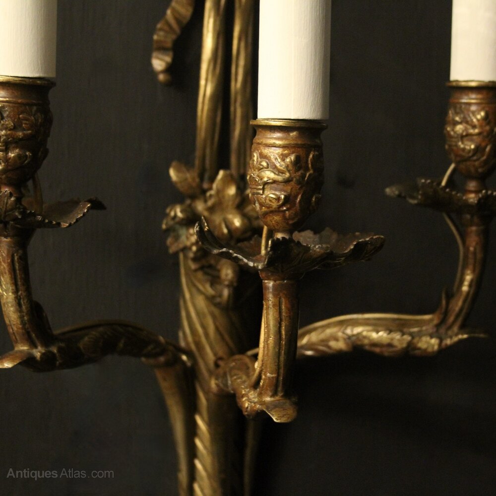 A French pair of gilded bronze triple arm antique wall sconces, the tapering scrolling arms with sectional leaf bobeche drip pans and bulbous candle sconces, issuing from a tapering twisted backplate with ornate ribbon pierced finial, great original gilded faded patination. Fully rewired and PAT tested. All our wall lights come with aged brass screws for fixing and spare bulbs.