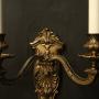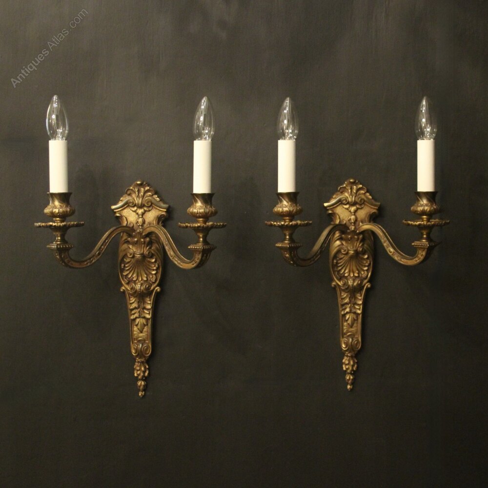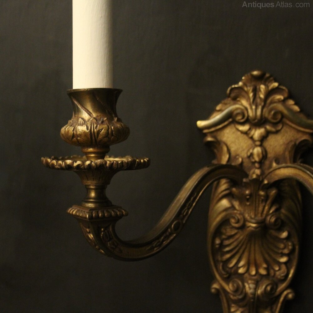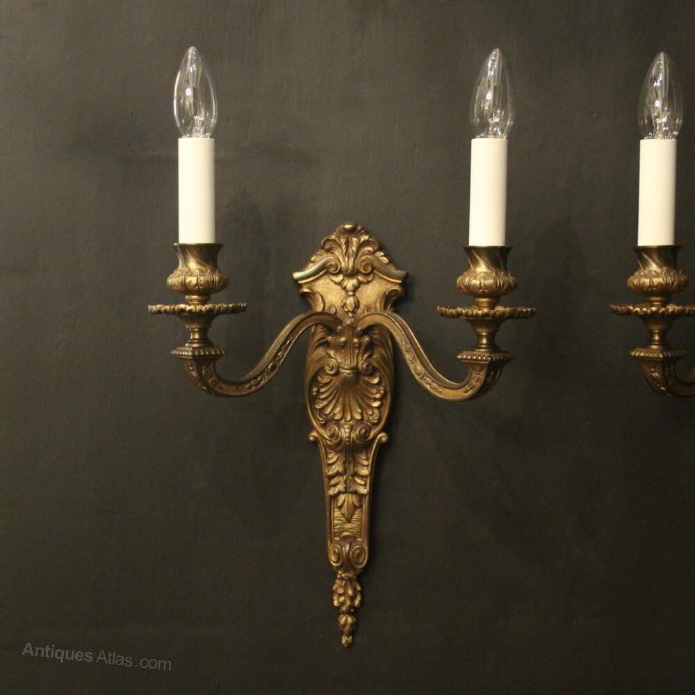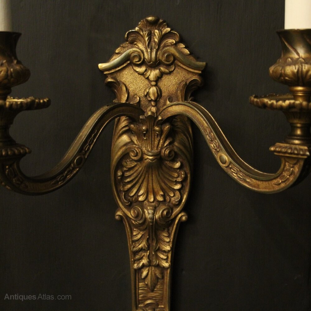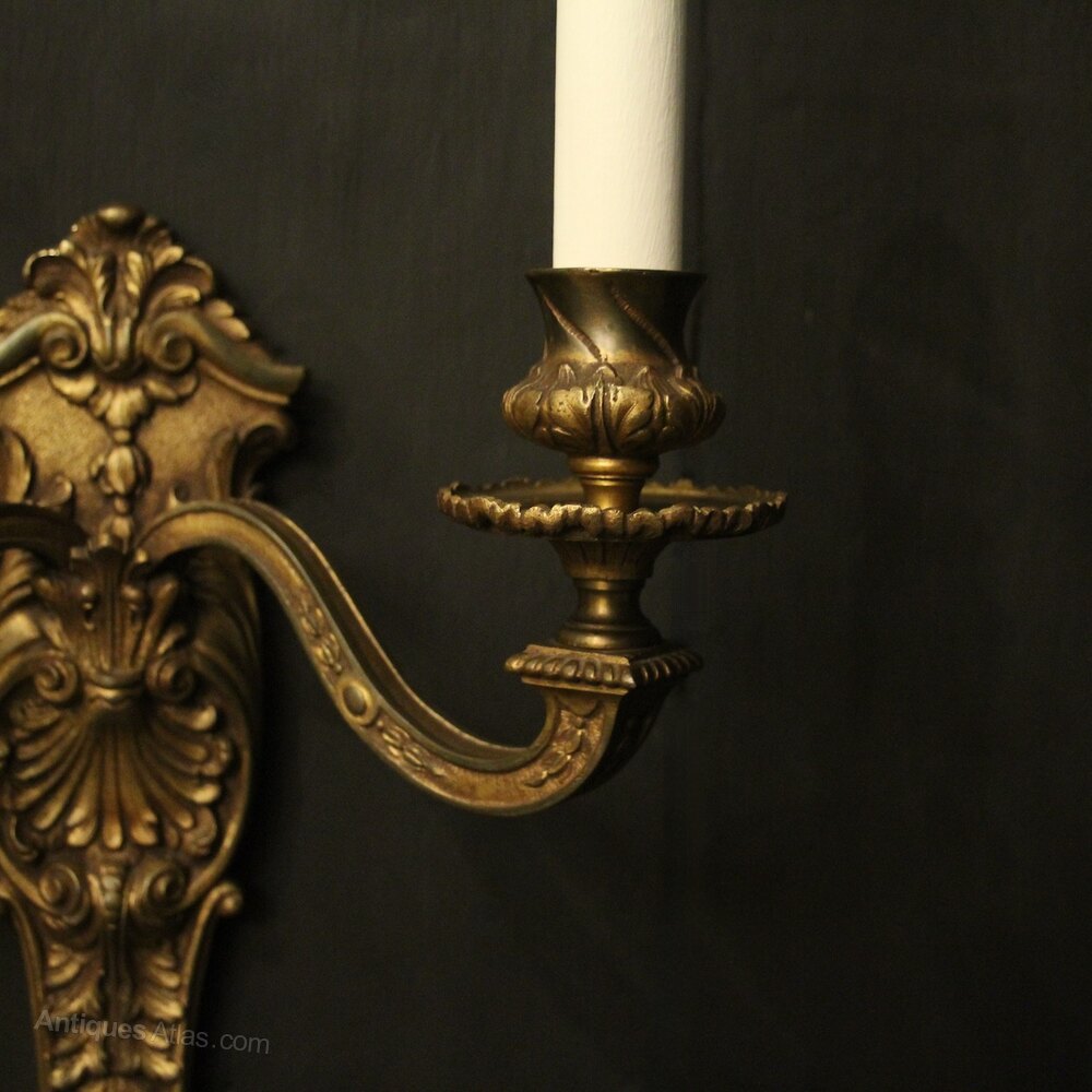 A quality French pair of gilded bronze twin arm antique wall sconces, the leaf clad scrolling arms with circular leaf bobeche drip pans and bulbous candle sconces, issuing from an ornate leaf tapering backplate with Acanthus leaf finial, lovely original patination and super crisp casting. Fully rewired and PAT tested. All our wall lights come with aged brass screws for fixing and spare bulbs.