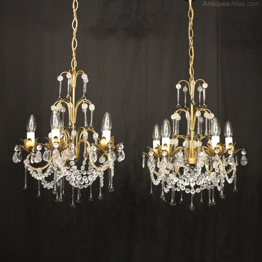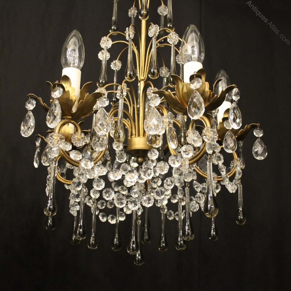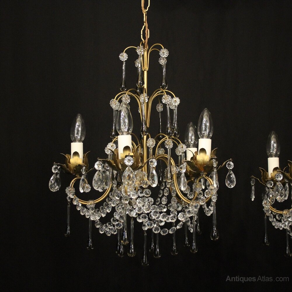 A pretty pair of French toleware and crystal 5 light chandeliers, the scrolling arms with foliated leaf bobeche drip pans, issuing from wirework central column and decorated overall with clear and smoked faceted crystal pendants and having the original chain and ceiling rose. Fully rewired and PAT tested. All our chandeliers come with ceiling fixings and spare bulbs.