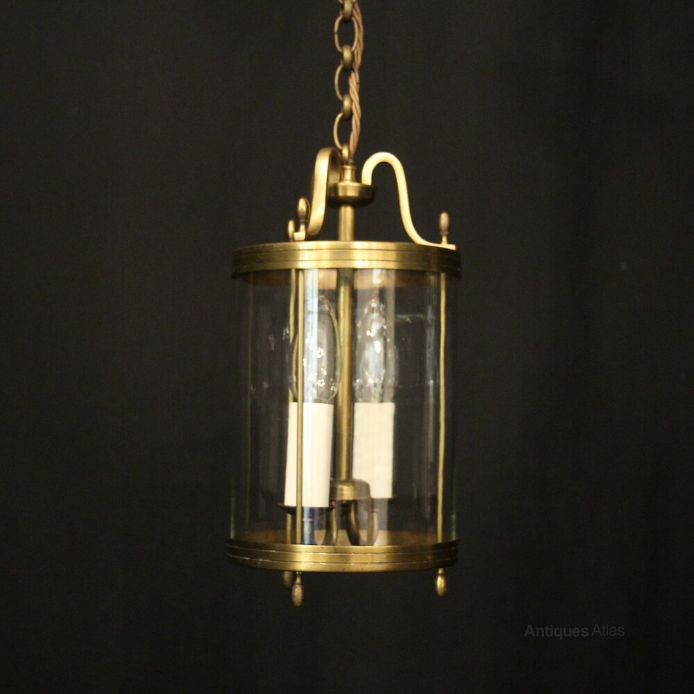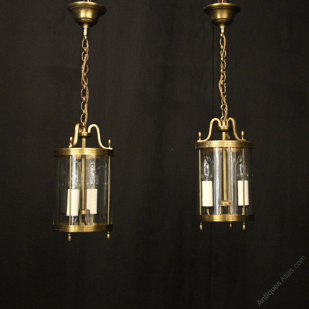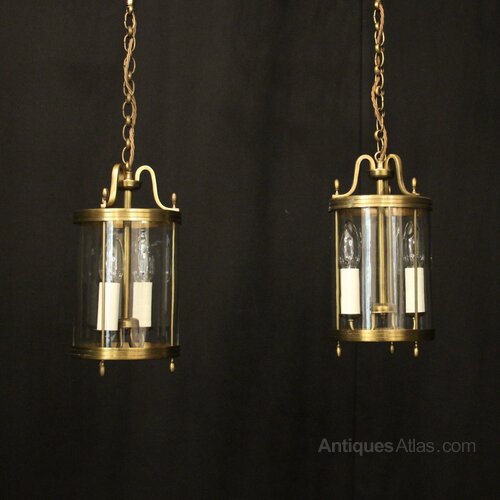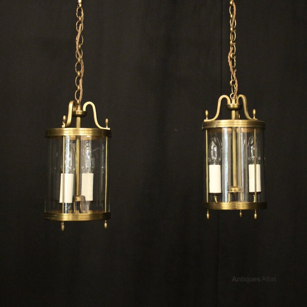 A small French pair of gilded brass twin light hall lanterns, the two light fittings with circular bobeche drip pans, surrounded by a single circular convex glass panel and held within an etched banded scrolling framework with turned finials with an open scrolling canopy, having the original chain and ceiling rose. Fully rewired and PAT tested. All our lanterns come with bulbs and ceiling fixings.