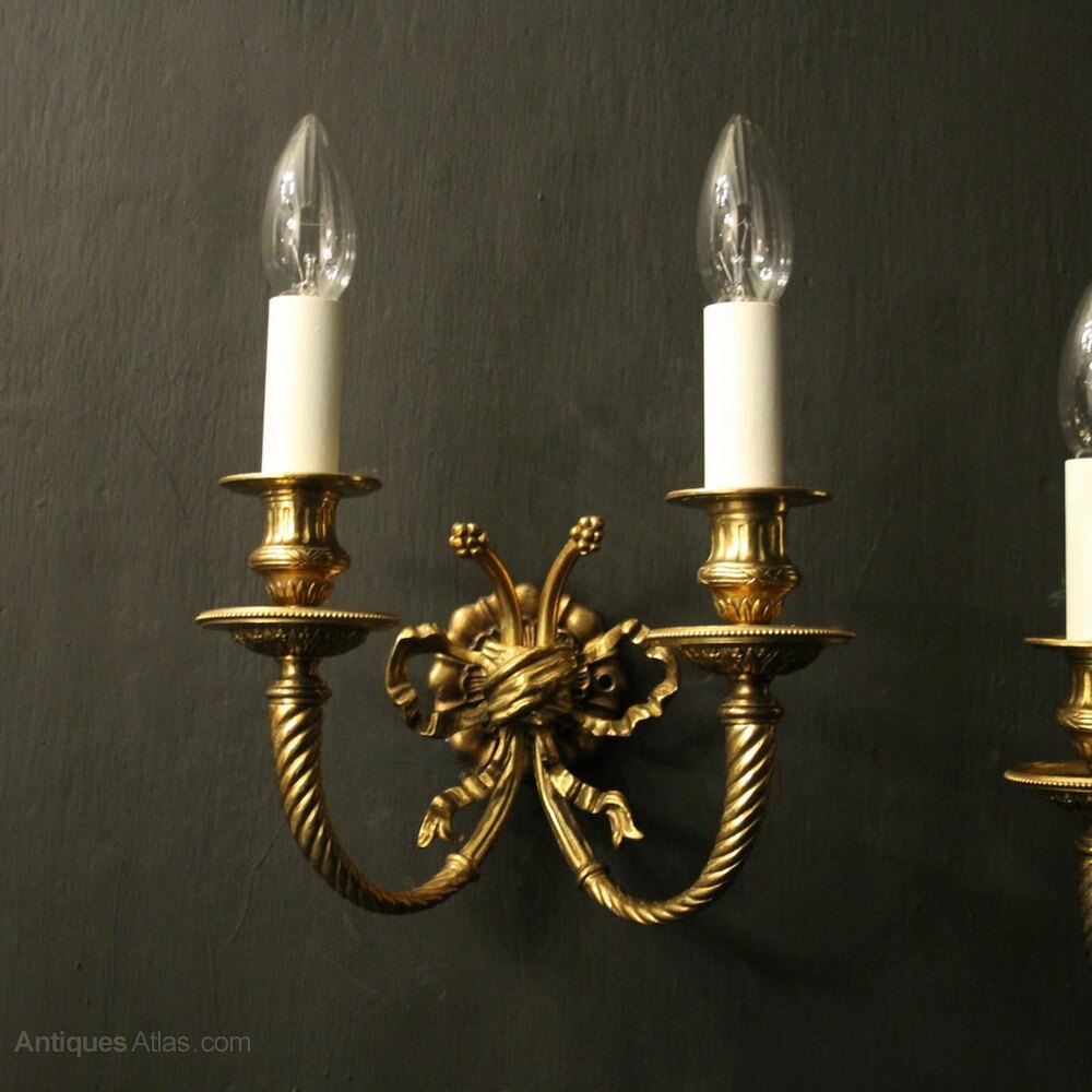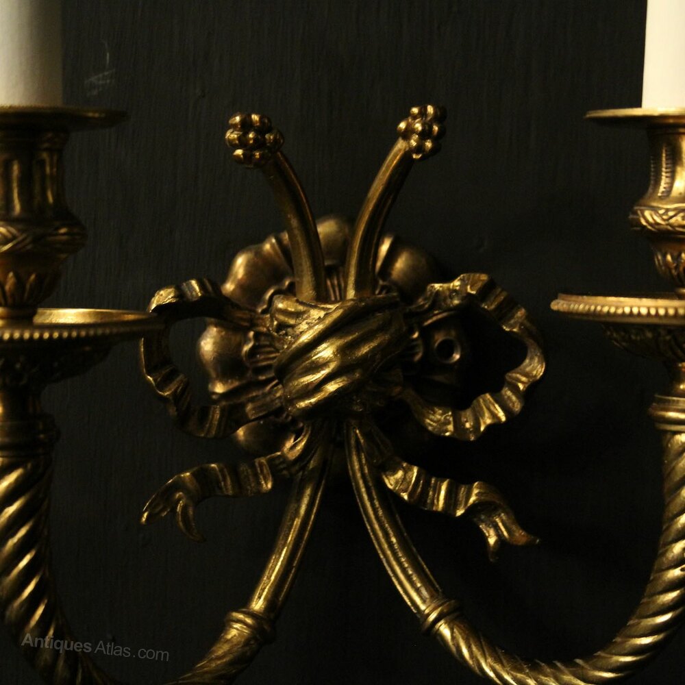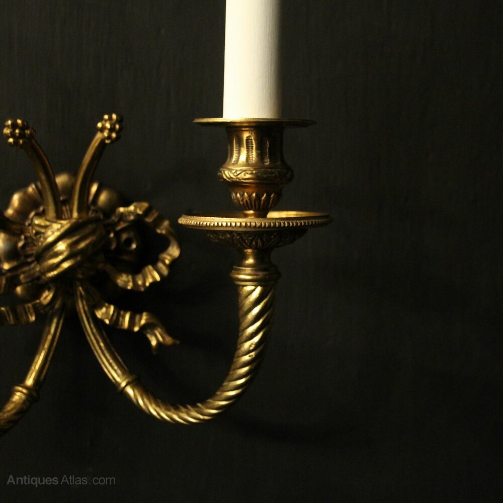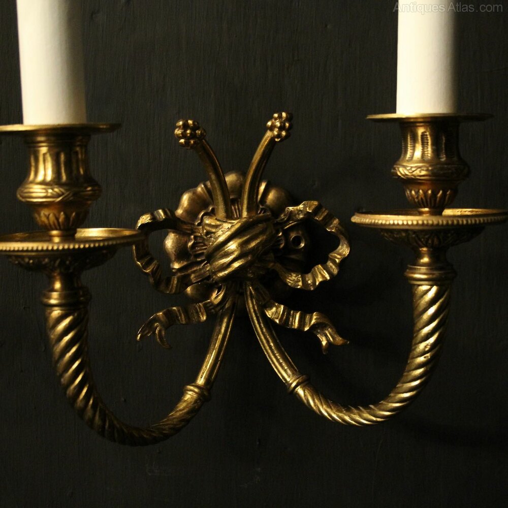 A French pair of gilded brass twin arm antique wall lights, the barley twisted tapering scrolling arms with millgrain circular bobeche drip pans and bulbous candle sconces, issuing from an circular leaf backplate and pierced ribbon centre, lovely original gilded patination. Fully rewired and PAT tested. All our wall lights come with aged brass screws for fixing and spare bulbs.