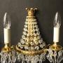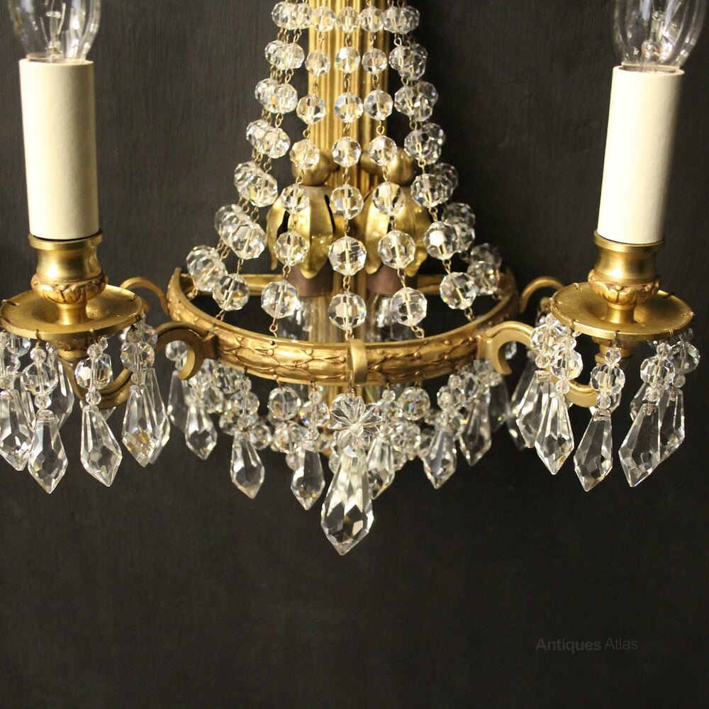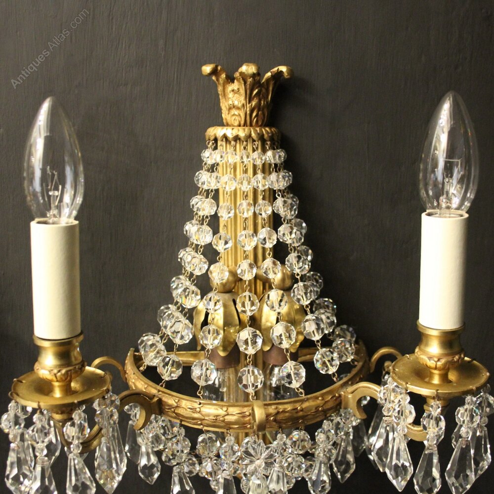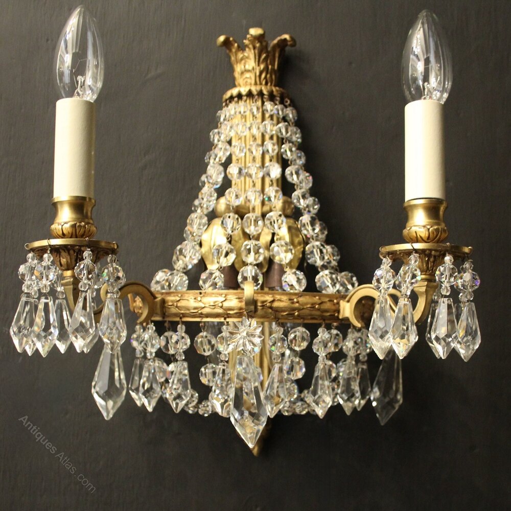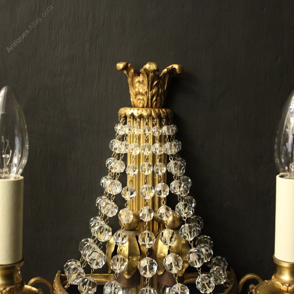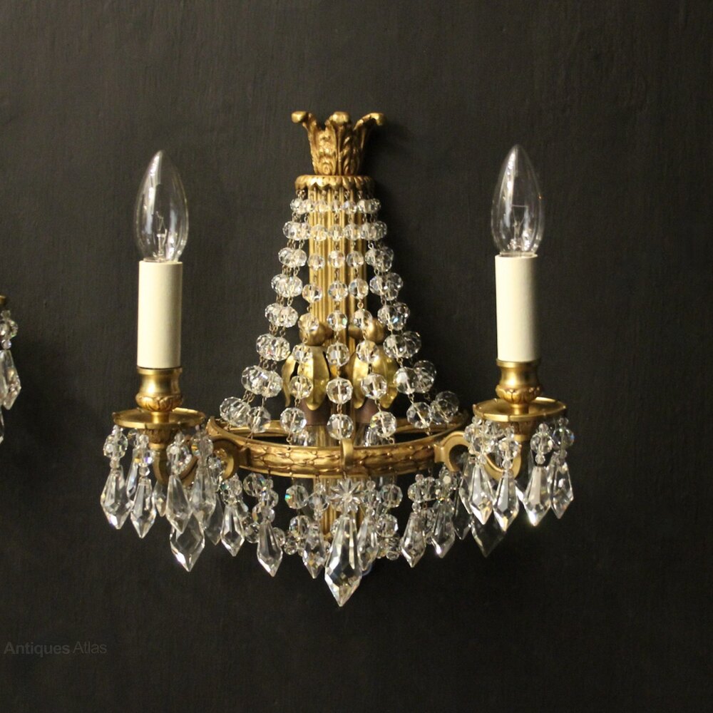 A French pair of gilded bronze and crystal 4 light wall lights, the square gauge scrolling arms with circular bobeche drip pans and bulbous leaf candle sconces, issuing from a leaf central band and scrolling leaf canopy with 2 internal light fittings, decorated overall with graduated swaged crystal faceted pendants, lovely quality gilding. Fully rewired and PAT tested. All our wall lights come with aged brass screws for fixing and spare bulbs. Matching Chandelier available.