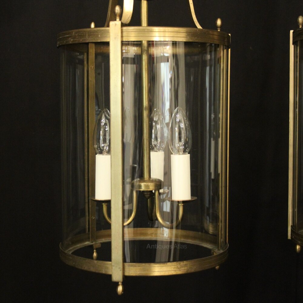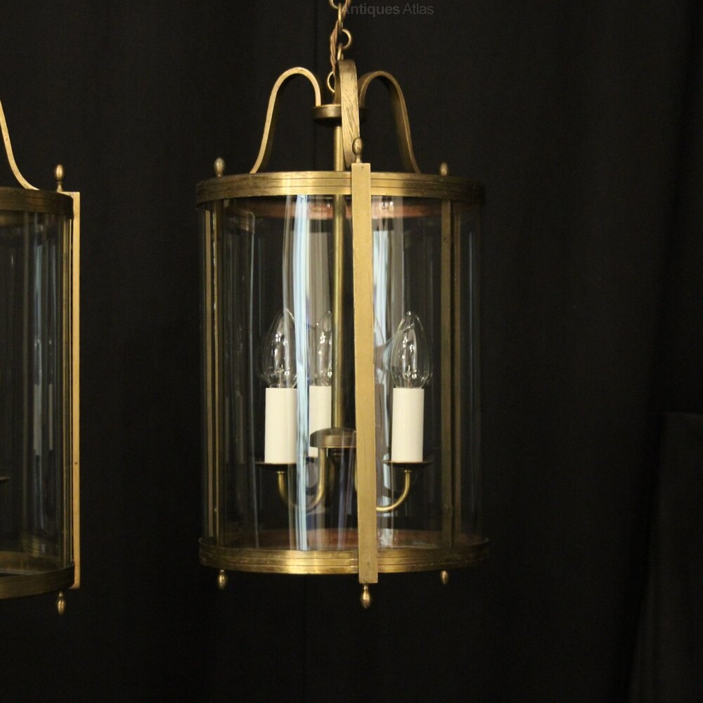 A French pair of gilded brass triple light antique hall lanterns, the three light fittings with circular bobeche drip pans, surrounded by three sectional convex glass panels and held within a decorative scrolling framework with reeded banding and scrolling canopy. Having the original chain and ceiling rose. Fully rewired and PAT tested. All our lanterns come with bulbs and ceiling fixings.