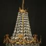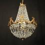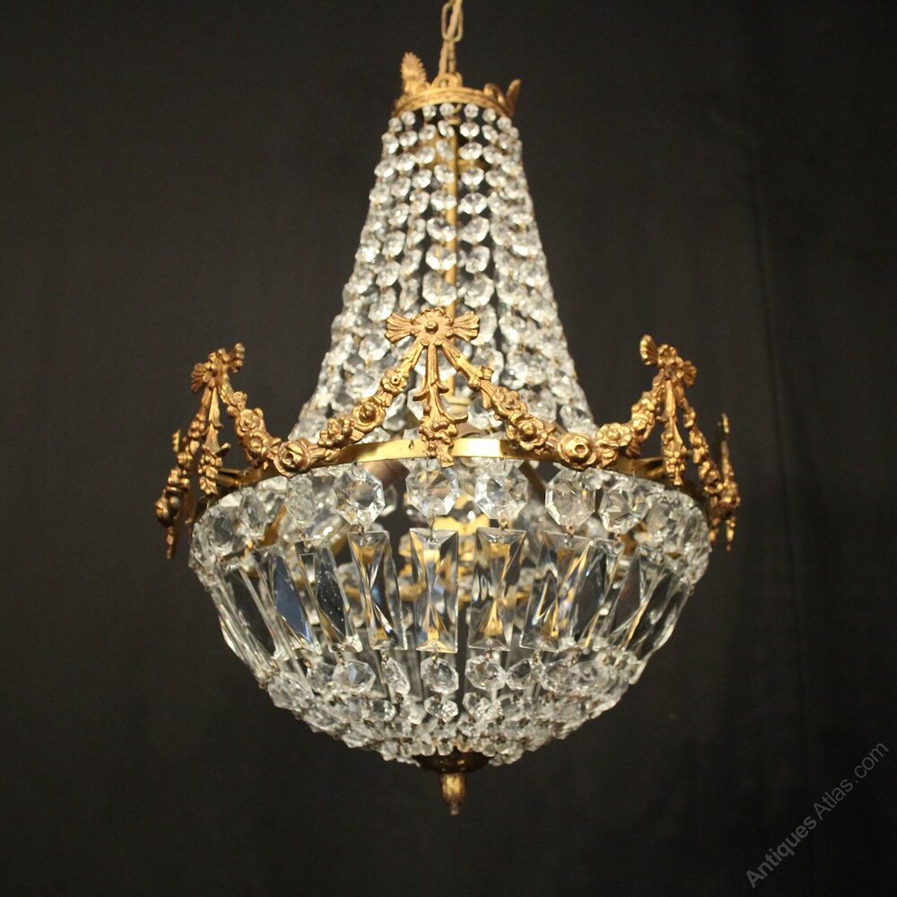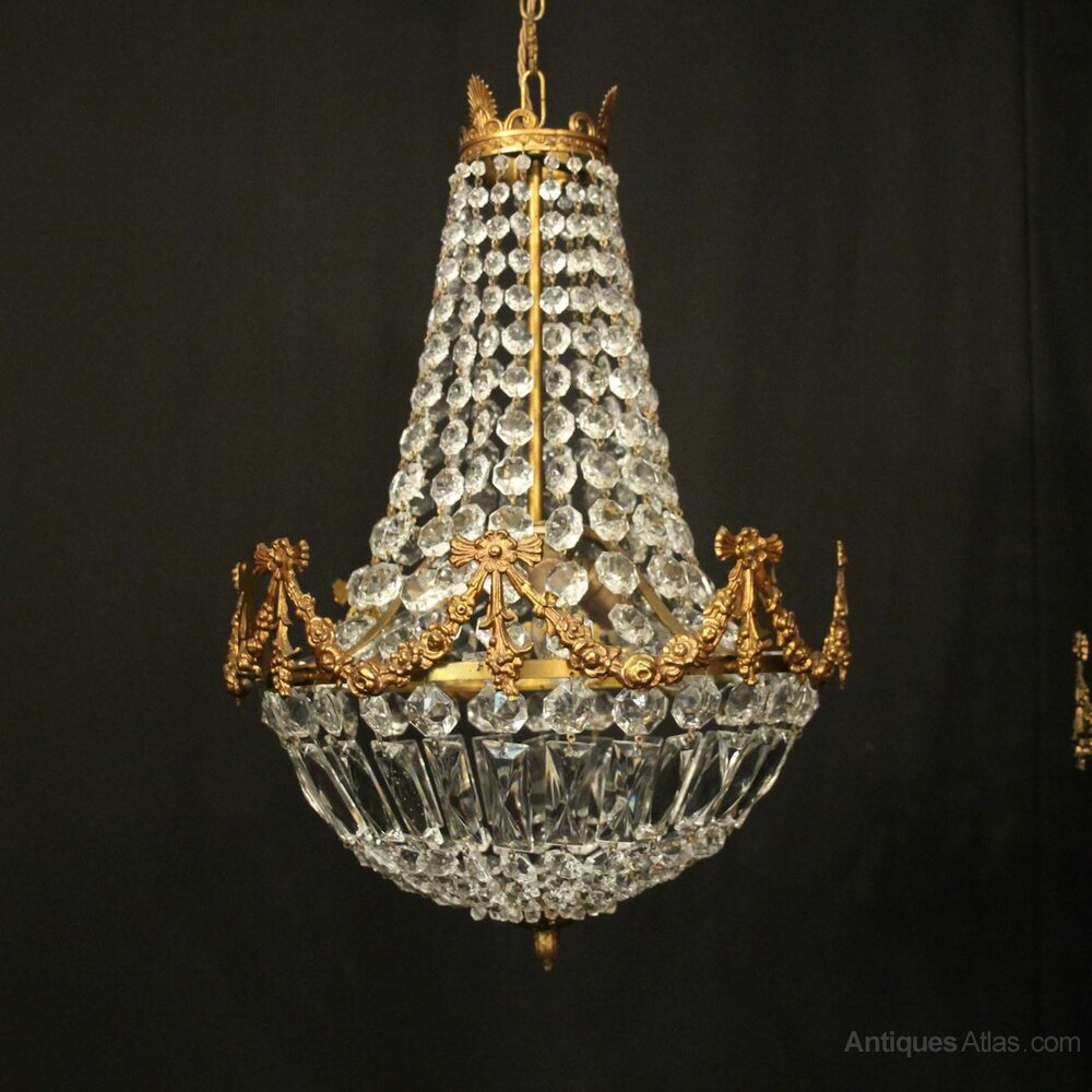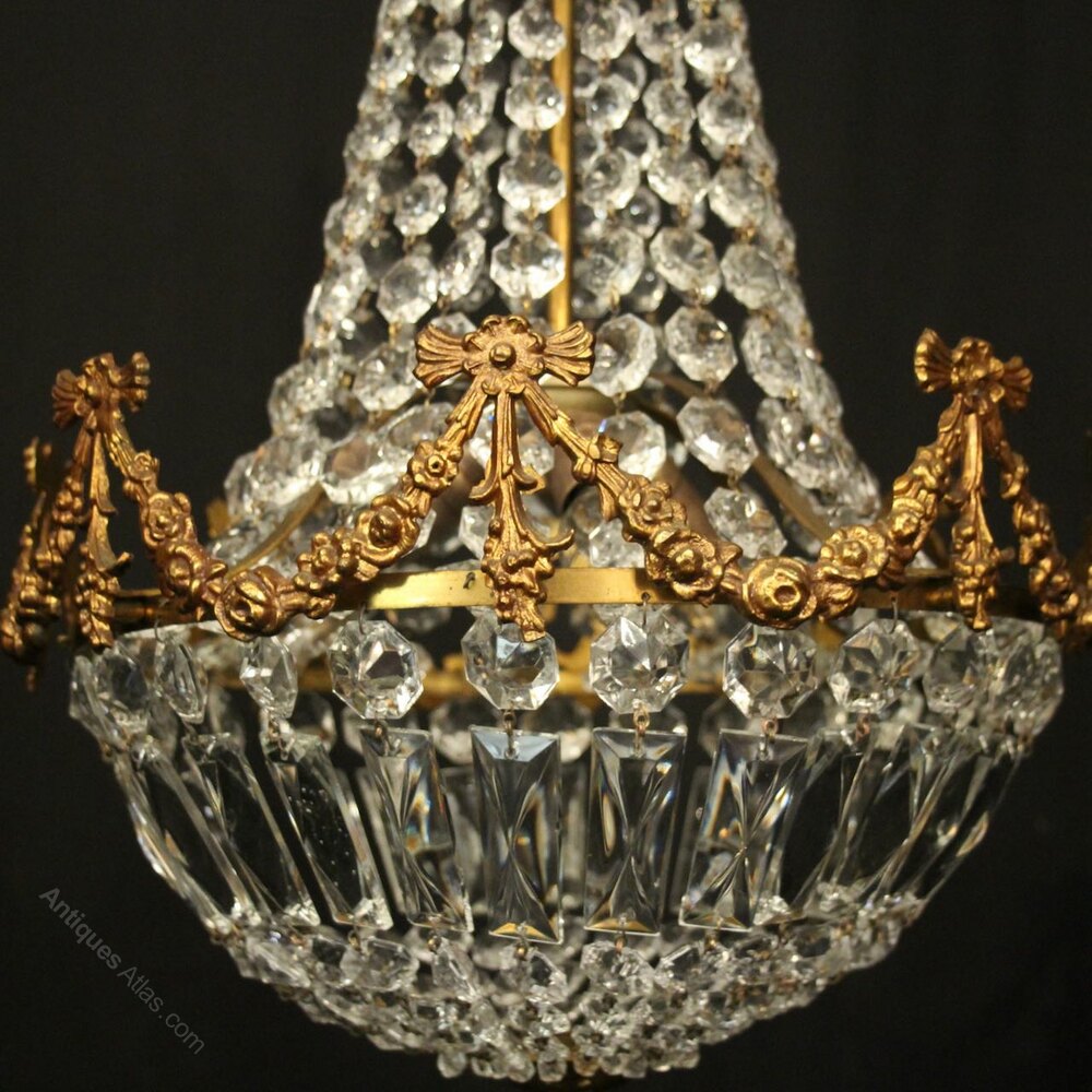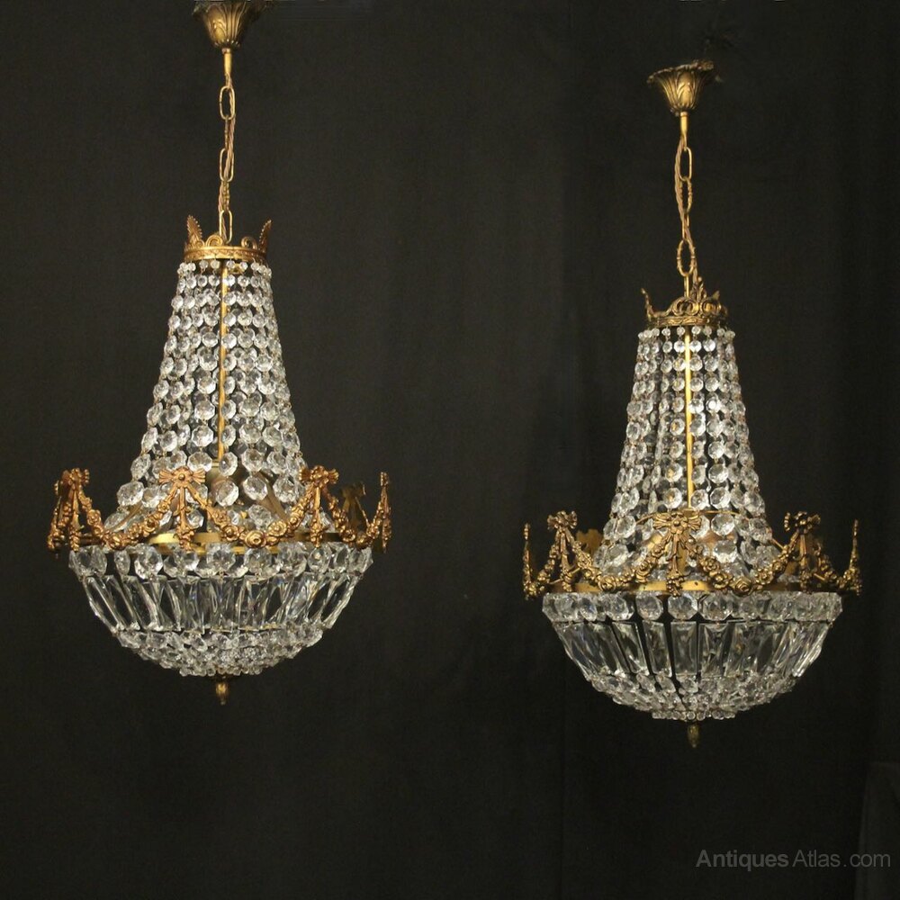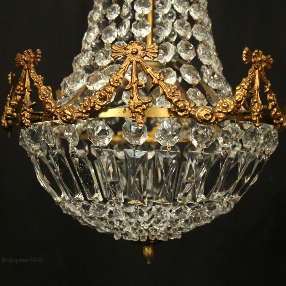 A lovely French pair of gilded brass and crystal triple light tent & waterfall antique chandeliers, the three internal light fittings, issuing from a floral swaged central band and ornate Anthemion canopy, decorated overall with graduated swaged crystal faceted pendants and having the original chain and ceiling rose. Fully rewired and PAT tested. All our chandeliers come with bulbs and ceiling fixings.