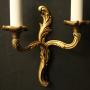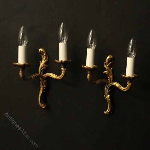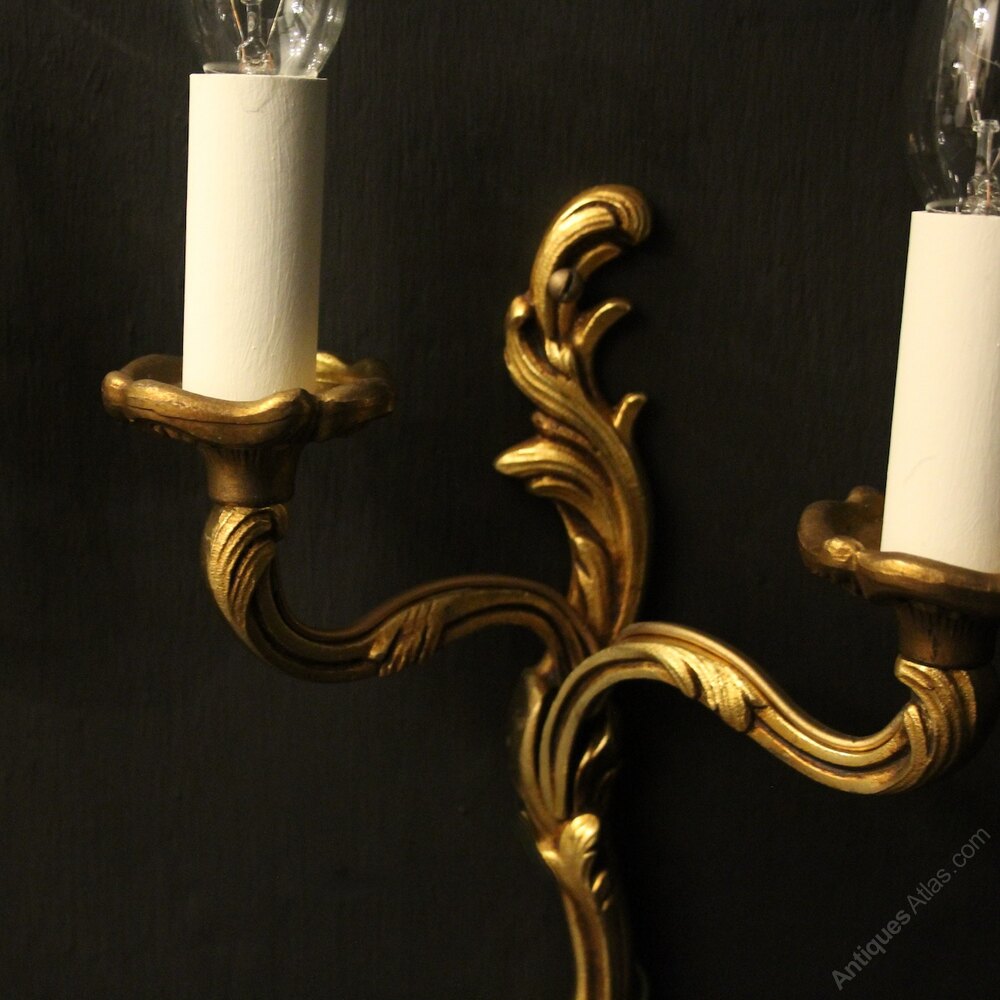 A French small pair of gilded brass twin arm opposing antique wall lights by Lucian Gau, the leaf clad scrolling arms with leaf bobeche drip pans, issuing from an opposing leaf backplate. Fully rewired and PAT tested. All our wall lights come with aged brass screws or brackets for fixing and spare bulbs. Matching a set of 4 we have OKA05111