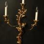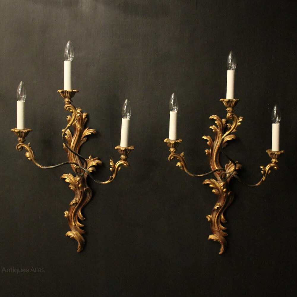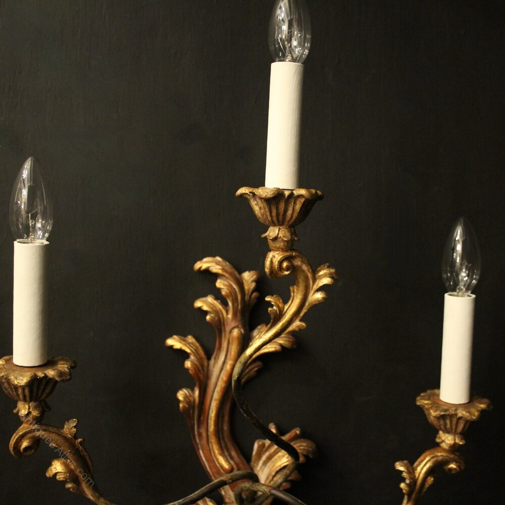 A lovely French pair of gilded carved wood triple arm antique wall lights, the toleware metal leaf scrolling arms with leaf bobeche drip pans, issuing from a ornate carved elongated opposing wooden leaf backplates, super original patination and great large scale. Fully rewired and PAT tested. All our wall lights come with aged brass screws for fixing and spare bulbs.