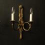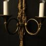 A French pair of 'Maison Baguès' bronze twin arm antique wall lights, the two scrolling French horns with trumpet bobeche drip pans issuing from a ribbon and tassel backplate with a floral circular boss finial, lovely original patination from a well know French lighting designer. Fully rewired and PAT tested. All our wall lights come with aged brass screws for fixing and spare bulbs.