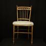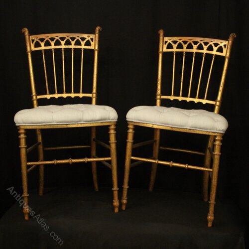 A French pair of giltwood simulated faux bamboo chairs. The spindle backs with pierced top rail and scrolling leaf finals. They would work in a bedroom or as side chairs. Newly recovered in French grey/blue linen.
