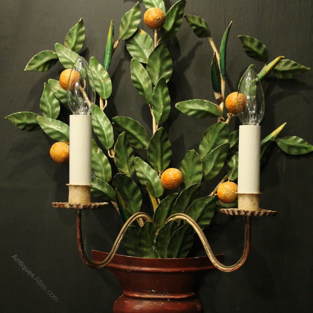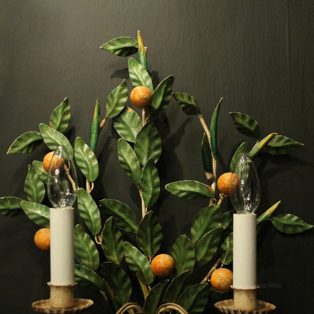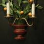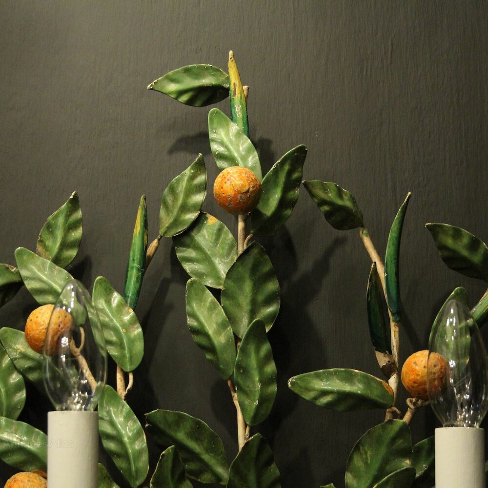 A decorative French pair of twin arm Toleware and polychrome wall lights, the scrolling arms with leaf bobeche drip pans and candle sconces, issuing from an elaborate leaf polychrome coloured backplate with decorative small clementines and urn base, great size and lovely original patination. Fully rewired and PAT tested. All our wall lights come with aged brass screws for fixing and spare bulbs.