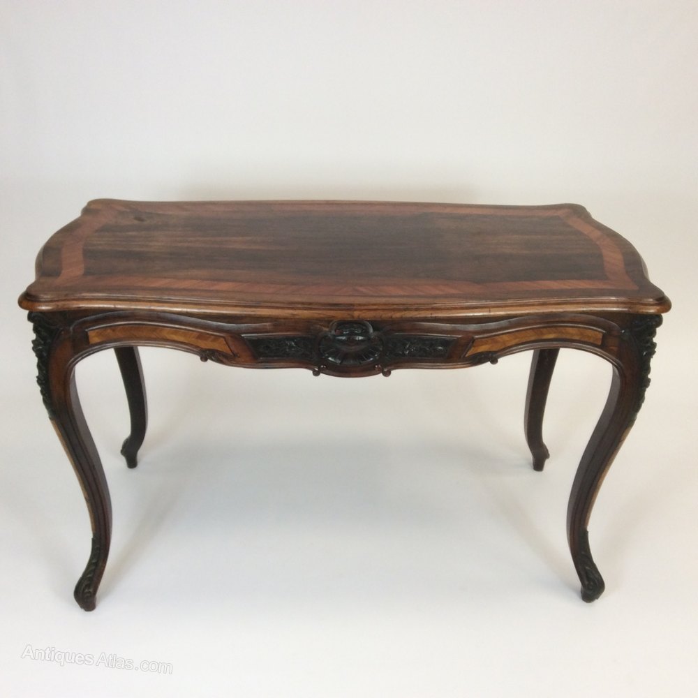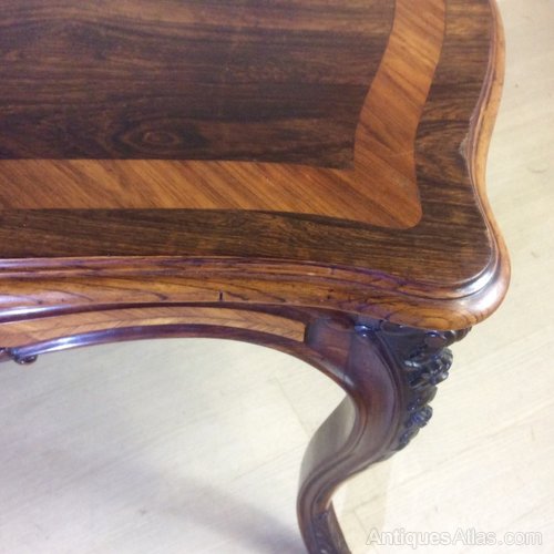 The table stands on very elegant shaped legs terminating in snail shaped / escargot feet. The serpentine sides, each with a cartouche and with a concealed drawer to one end.