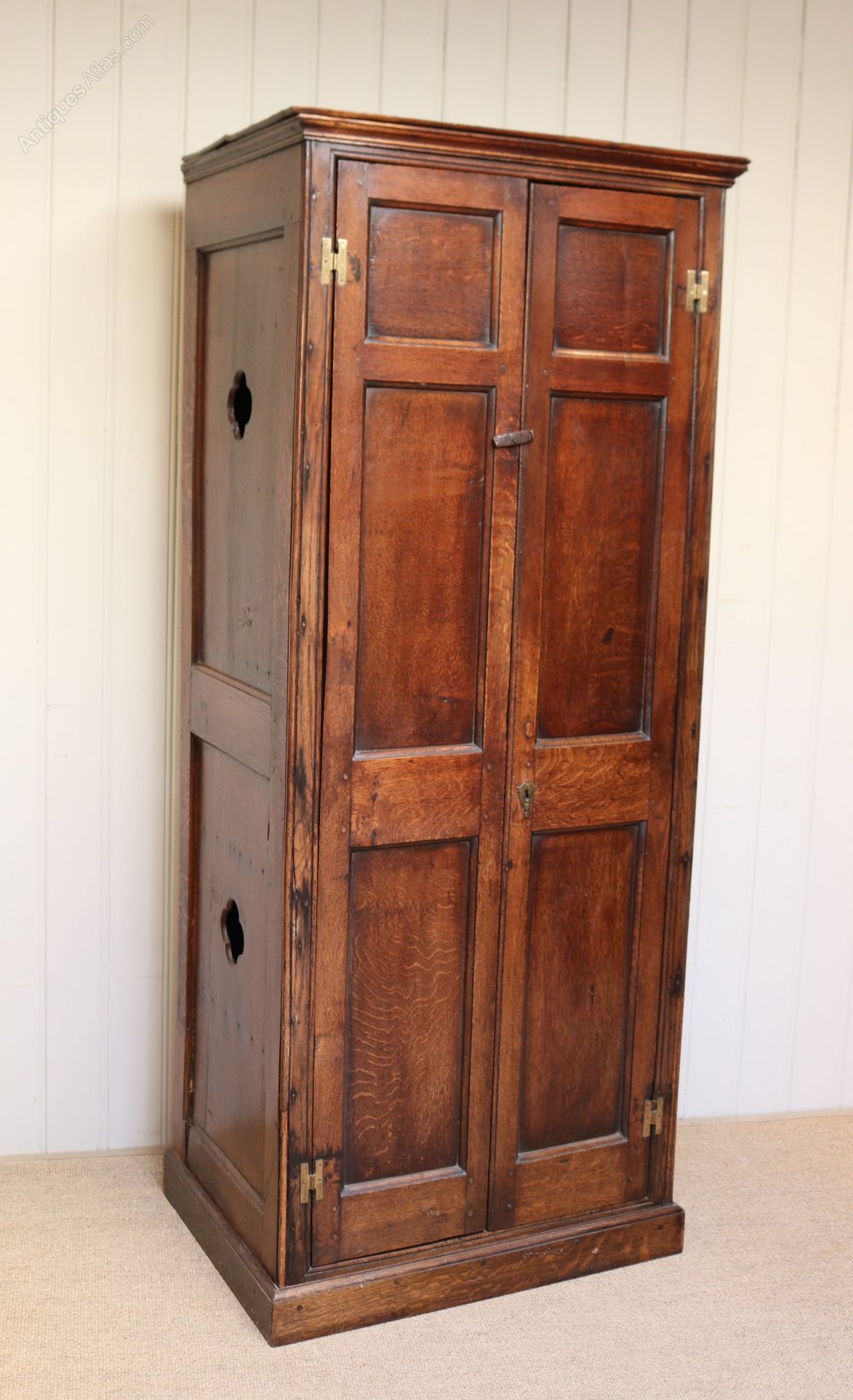 French solid oak rustic hall cupboard having panelled sides with quatrefoil cut outs to each side, the panelled doors opening to reveal a hanging rail with a top shelf,raised on a plinth base