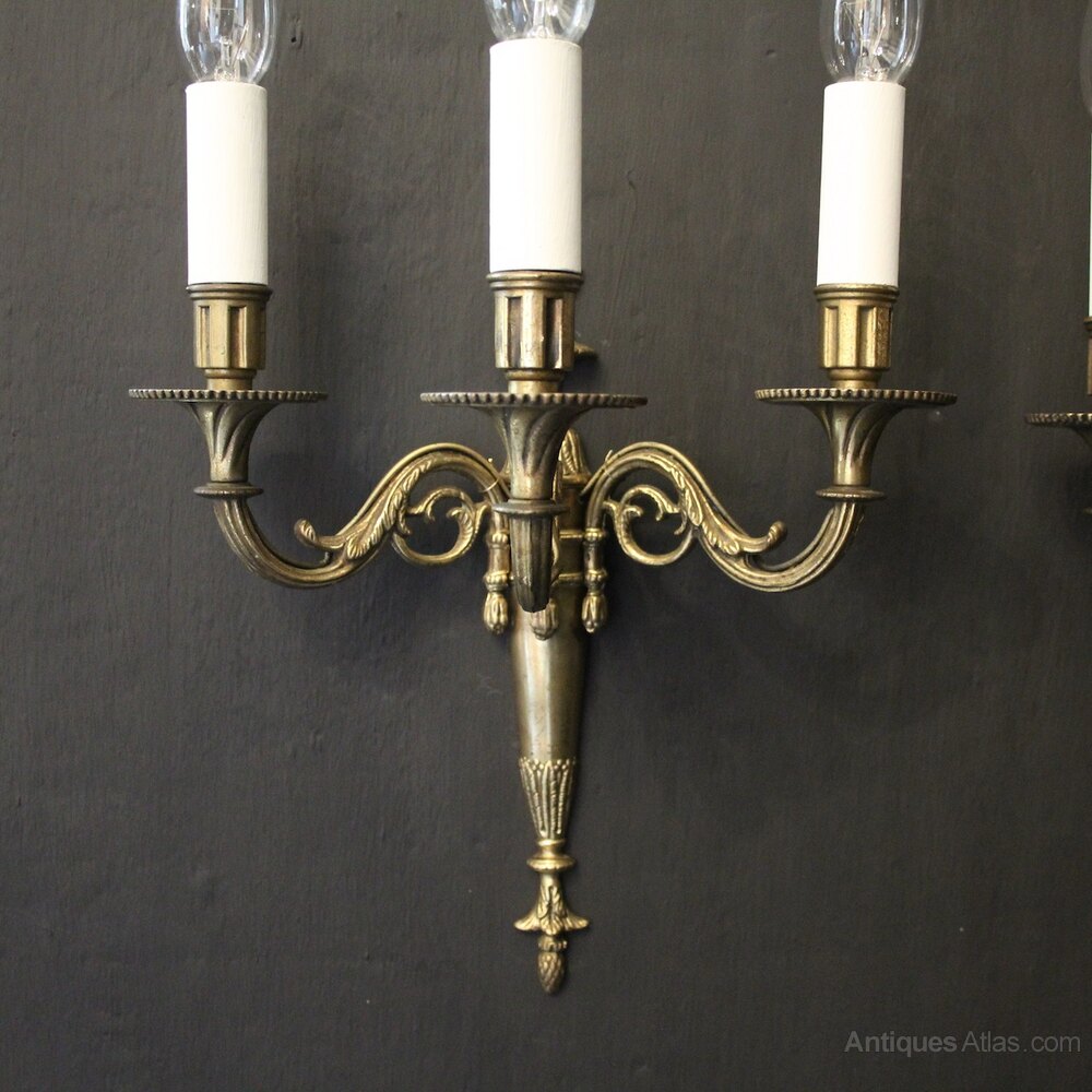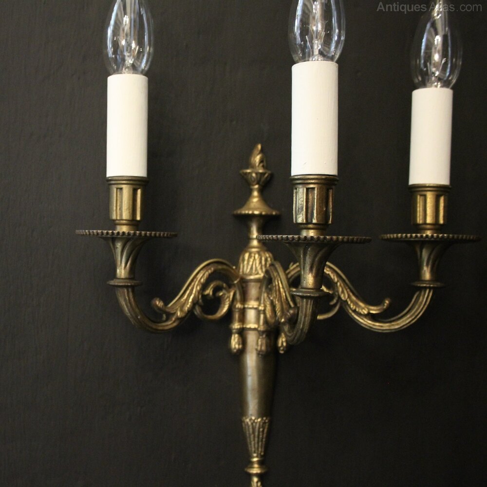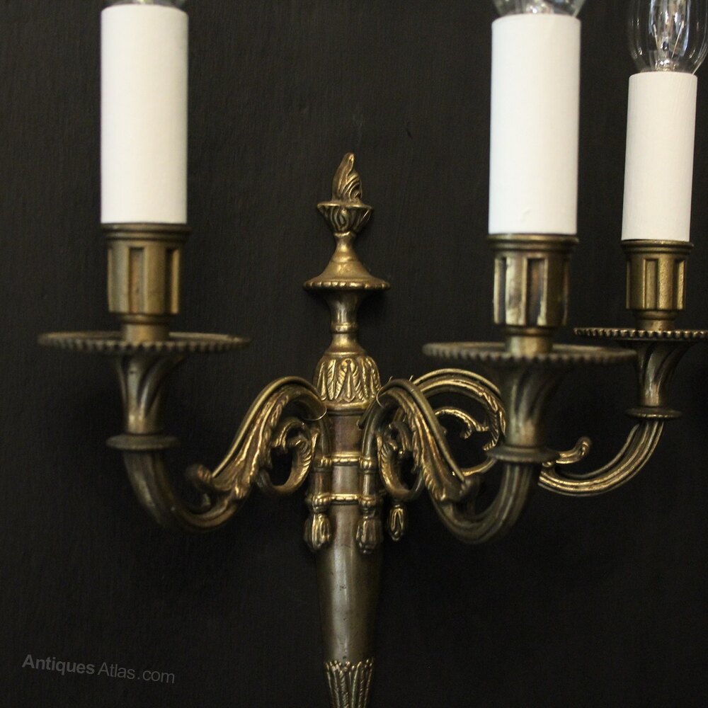A French set of 4 gilded brass triple arm antique wall lights, the leaf clad scrolling arms with circular trumpet millgrain bobeche drip pans and reeded candle sconces, issuing from an elongated backplate with flame finial. Fully rewired and PAT tested. All our wall lights come with aged brass screws for fixing and spare bulbs.