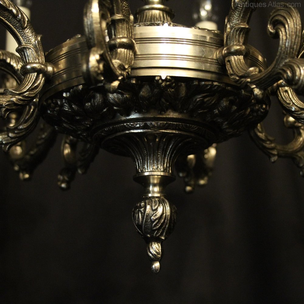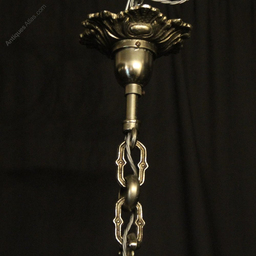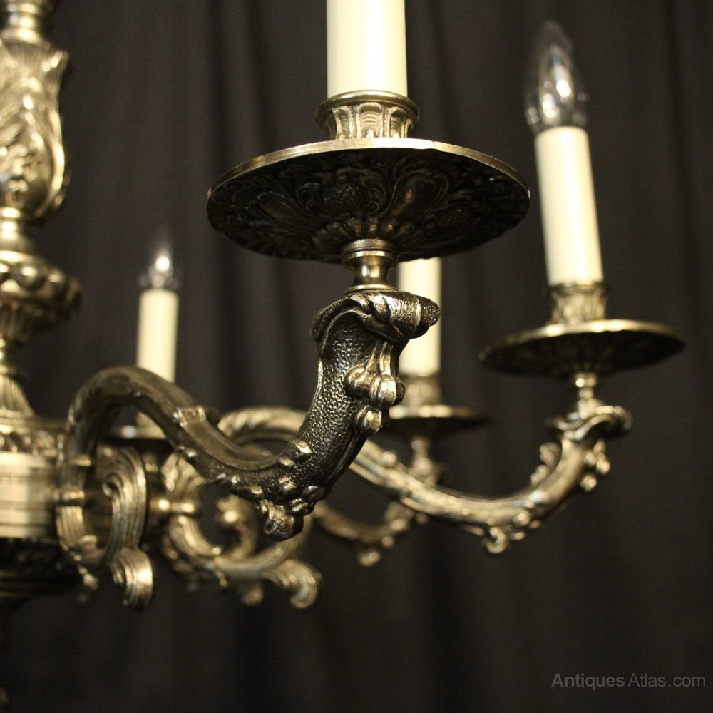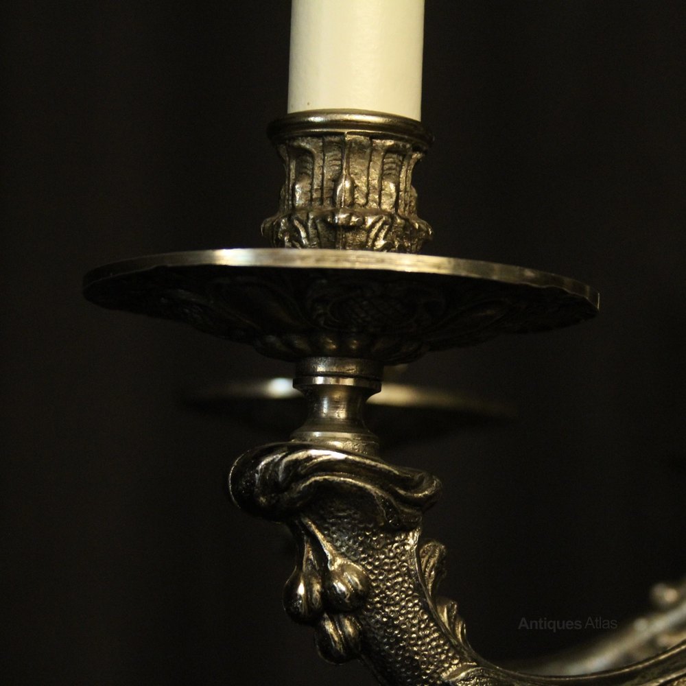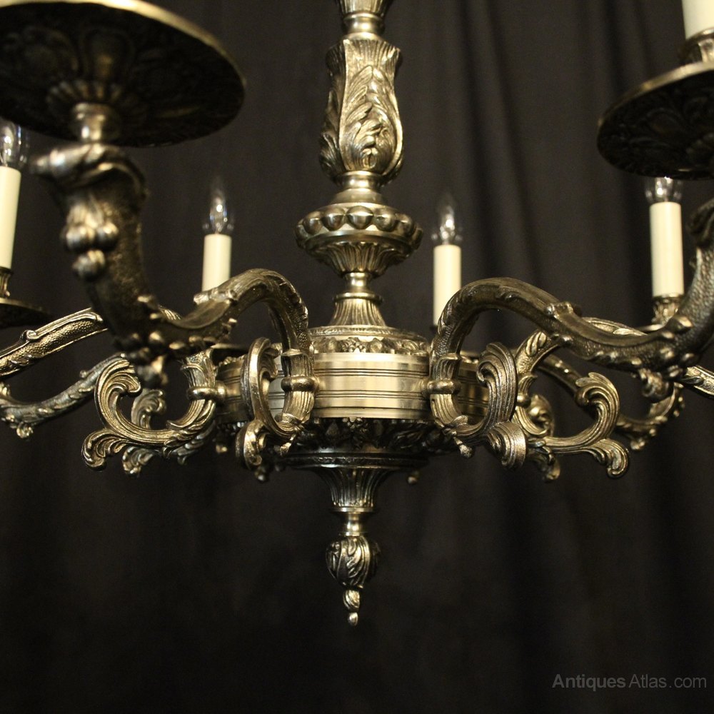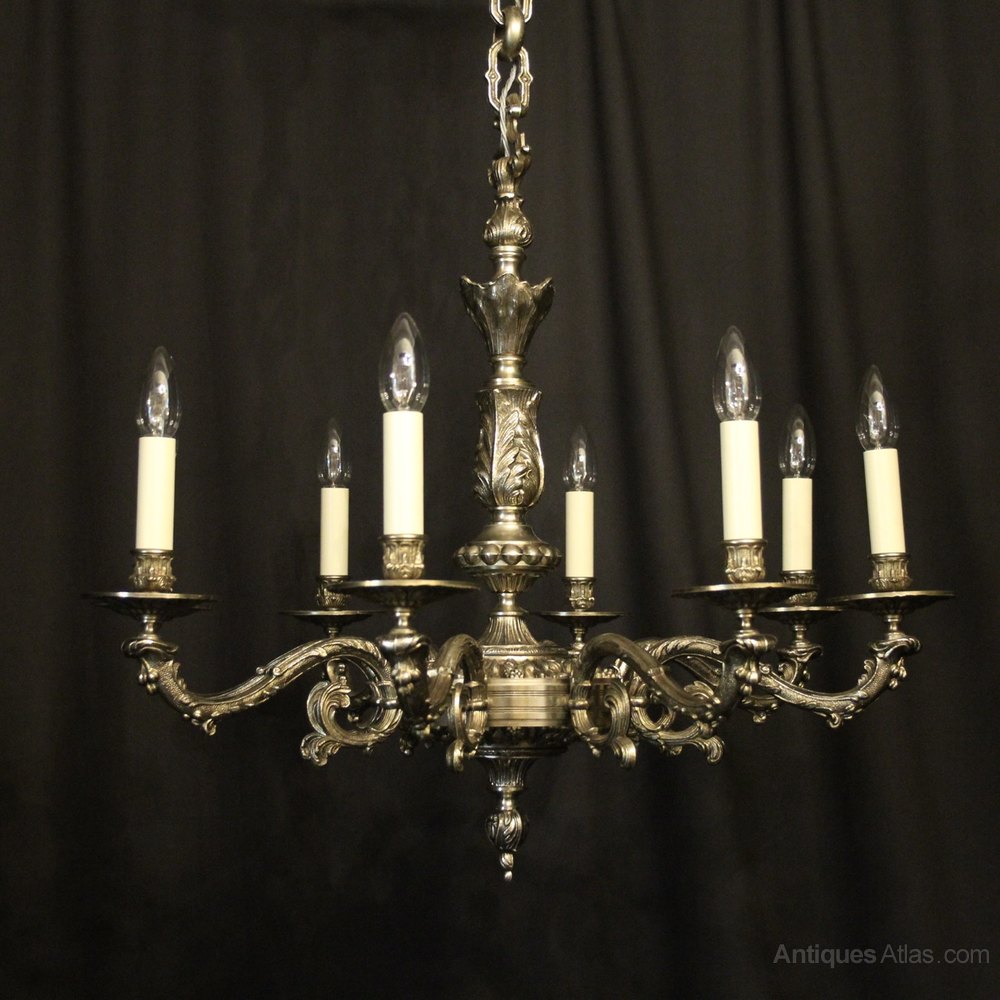A French silver gilded cast brass 8 light chandelier, the ornate scrolling arms with leaf circular bobeche drip pans and bulbous candle sconces, issuing from a leaf baluster central column with decorative leaf base, having the original chain and ceiling rose, lovely original silver patination and good scale. Fully rewired and PAT tested. All our chandeliers come with bulbs and ceiling fixings.