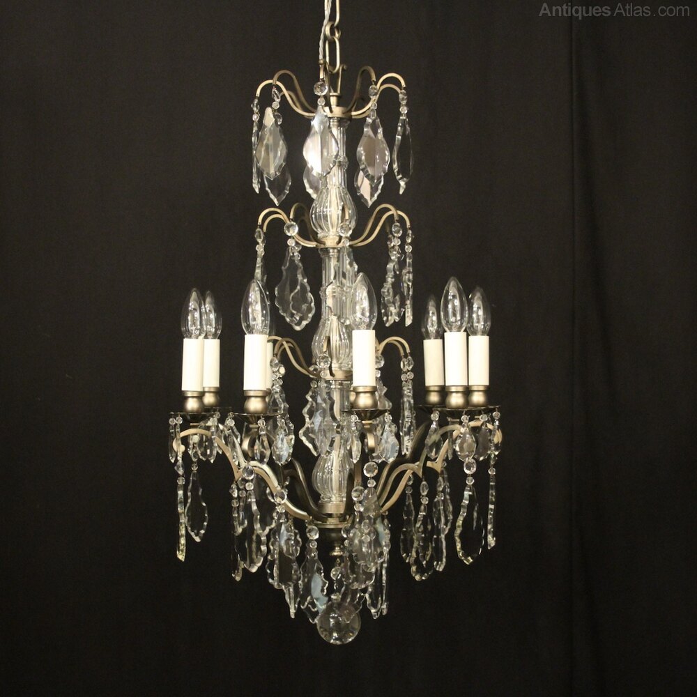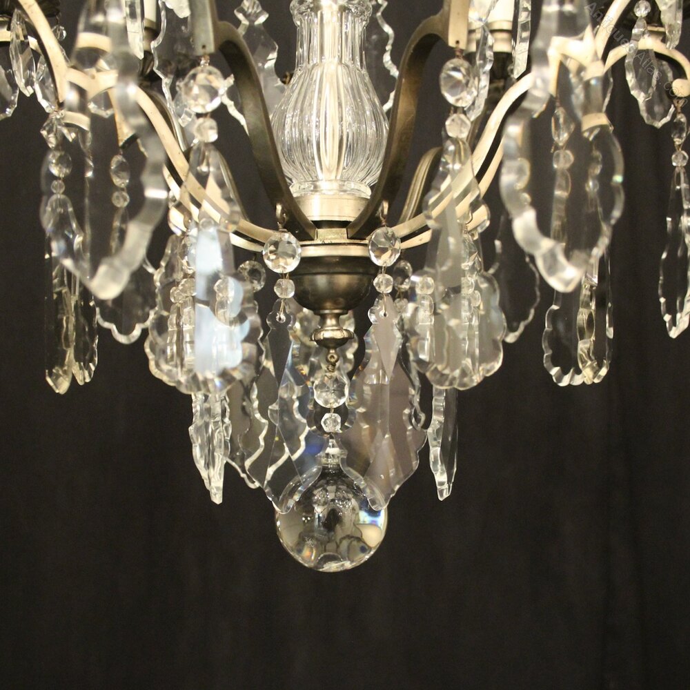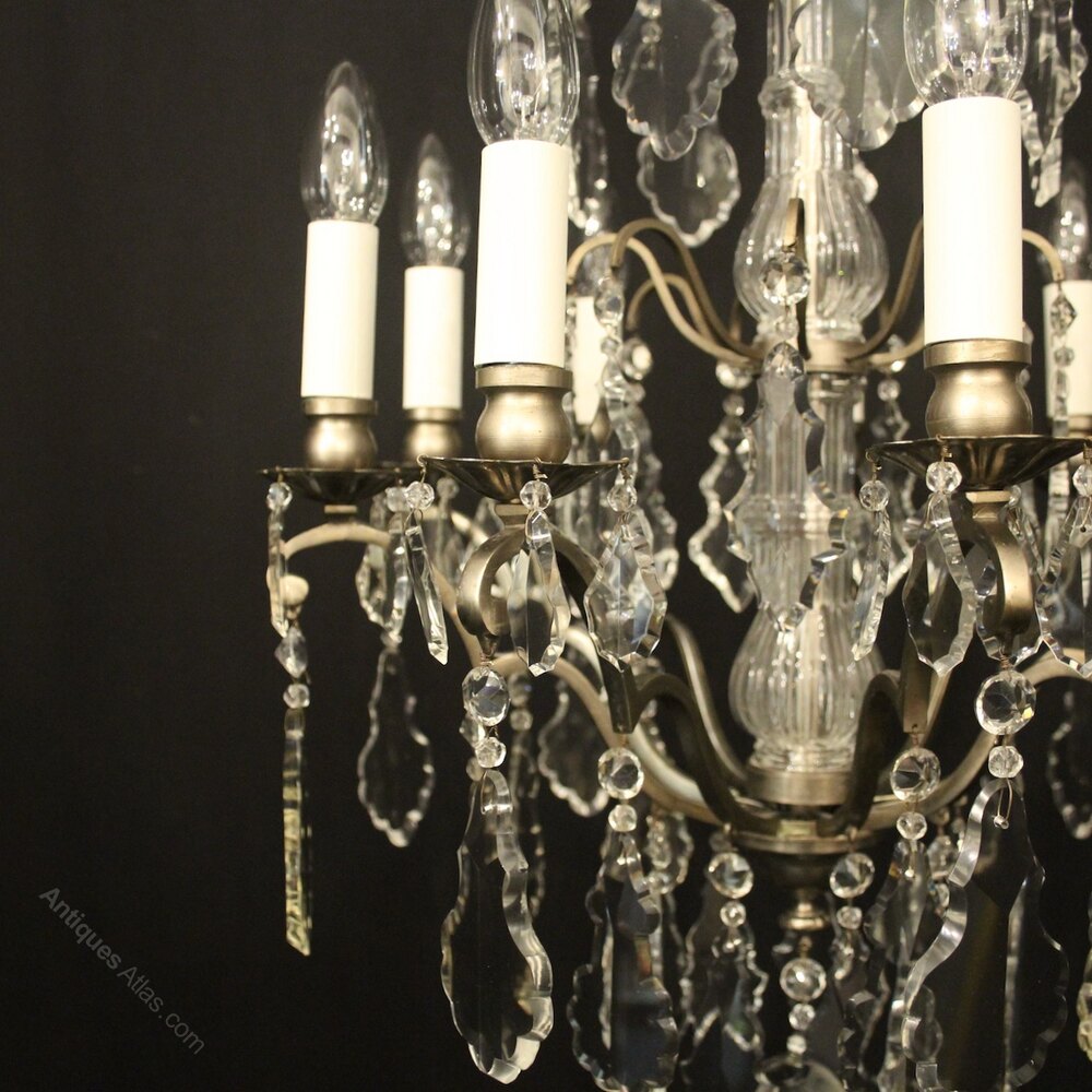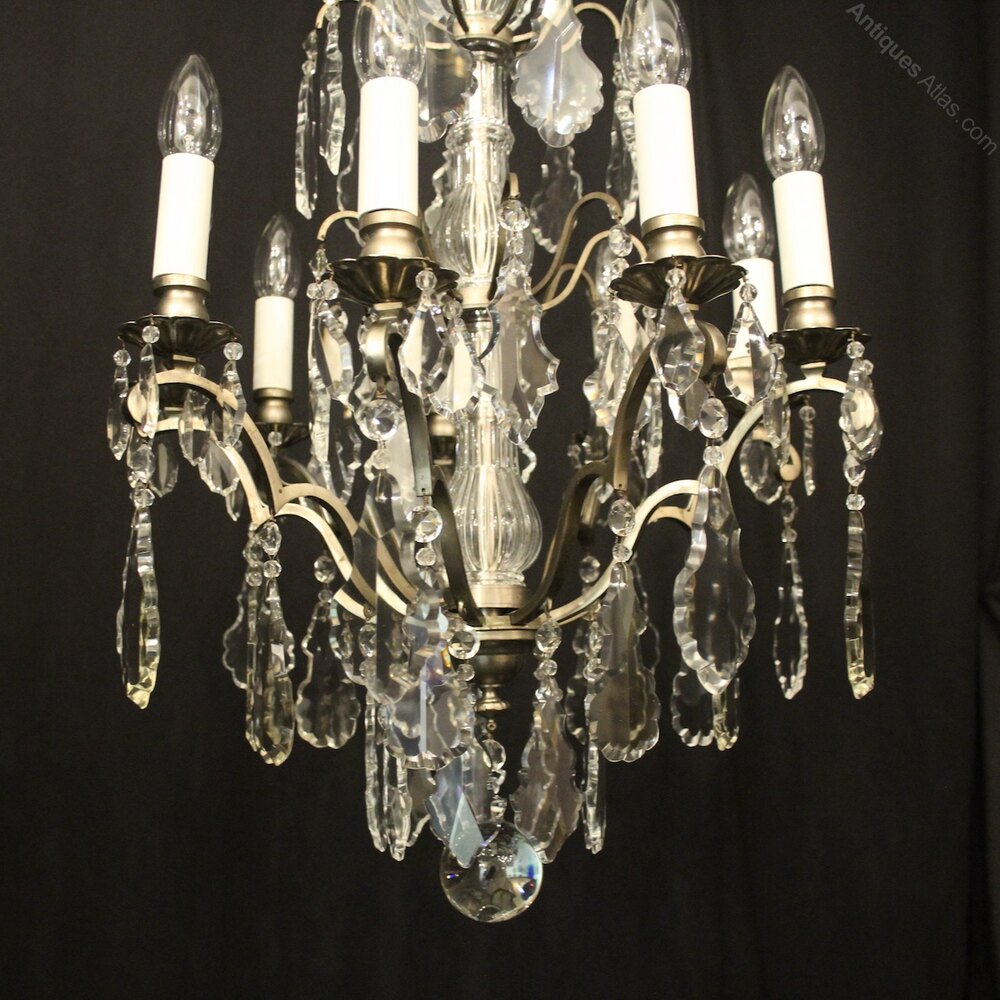 A French silver gilded brass and crystal 9 light antique chandelier, the nine square gauge scrolling arms with leaf bobeche drip pans and bulbous candle sconces, issuing from glass baluster column with scrolling canopy, decorated overall with French Slab crystal faceted pendants, having the original chain and ceiling rose, nice original silver gilded patination. Fully rewired and PAT tested. All our chandeliers come with bulbs and ceiling fixings.