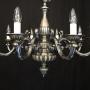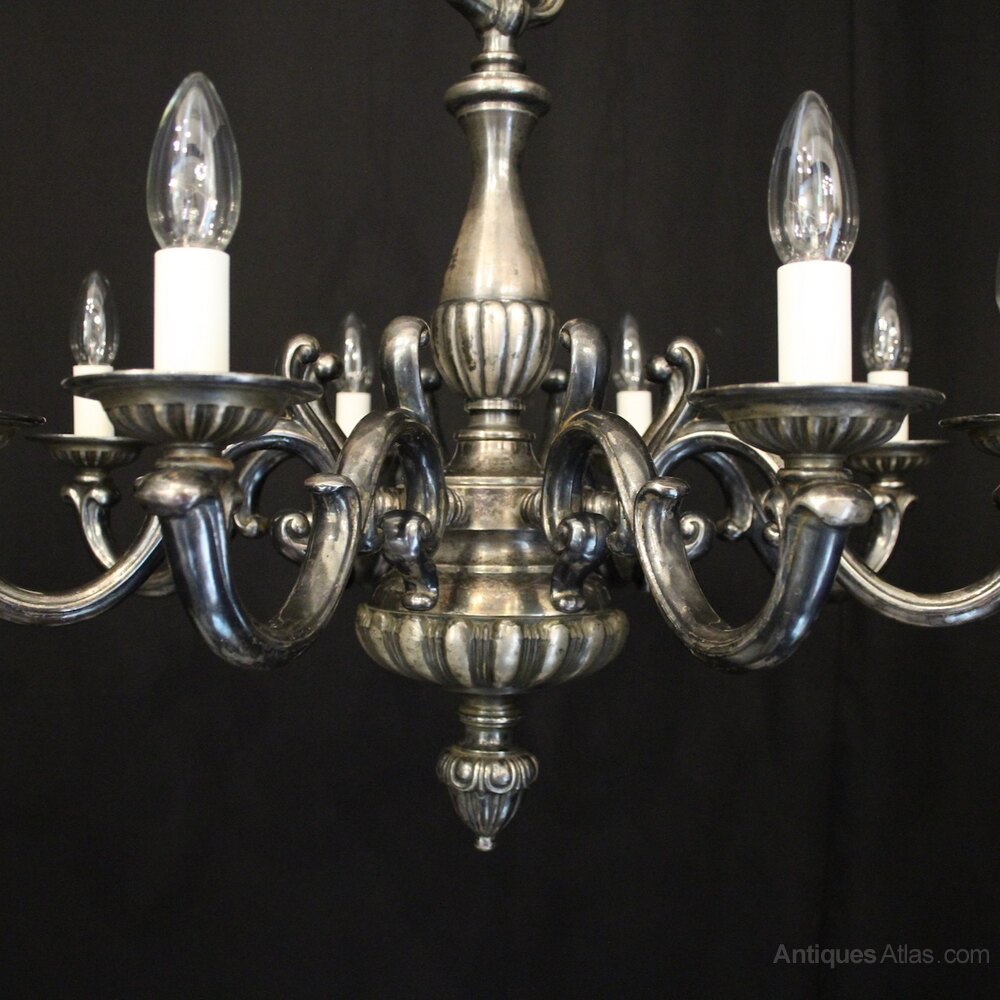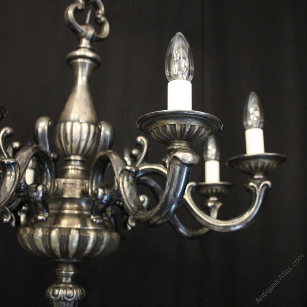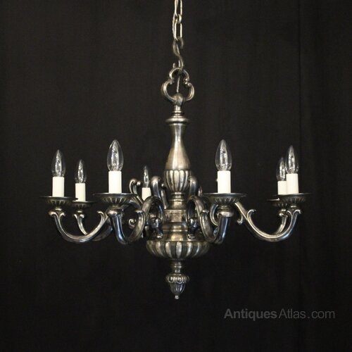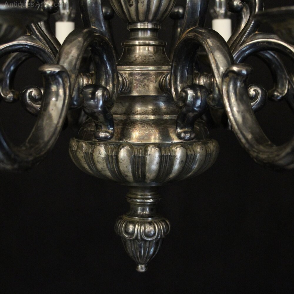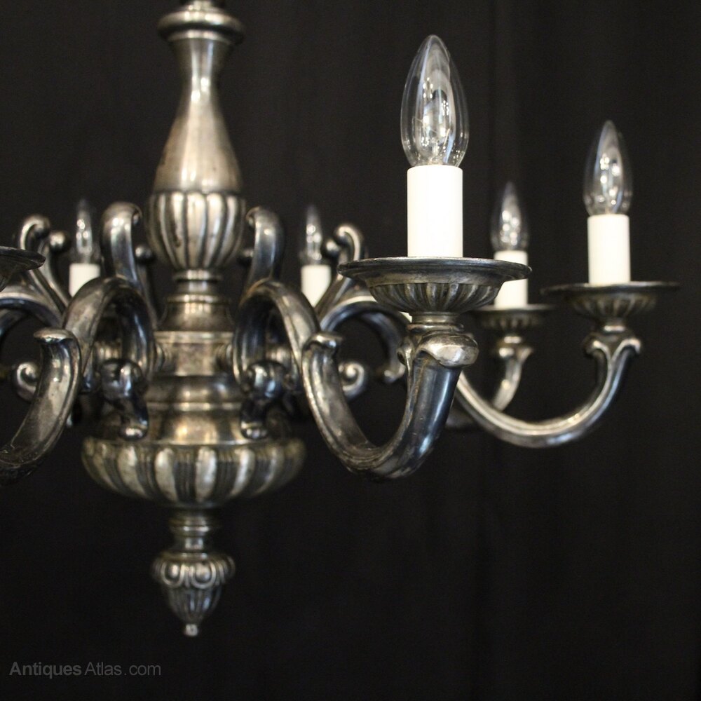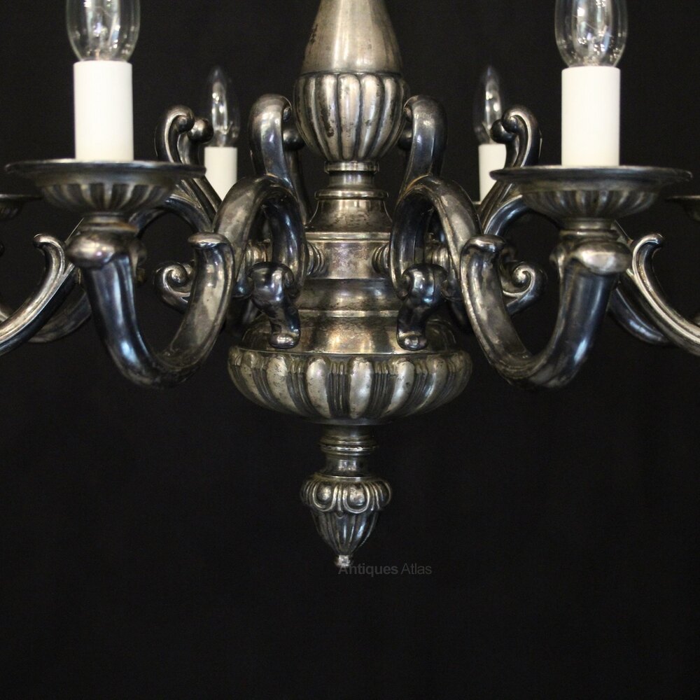 A French faded silver gilded brass 8 light antique chandelier, the scrolling arms with circular scalloped bobeche drip pans, issuing from a reeded tapering central column with pierced trefoil ring finial, having the original chain and ceiling rose, lovely original faded silver gilded patination. Fully rewired and PAT tested. All our chandeliers come with bulbs and ceiling fixings.