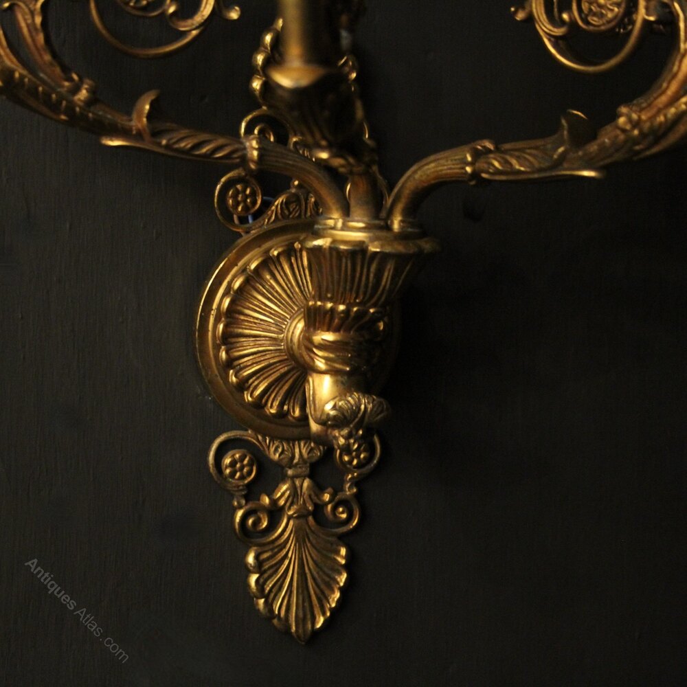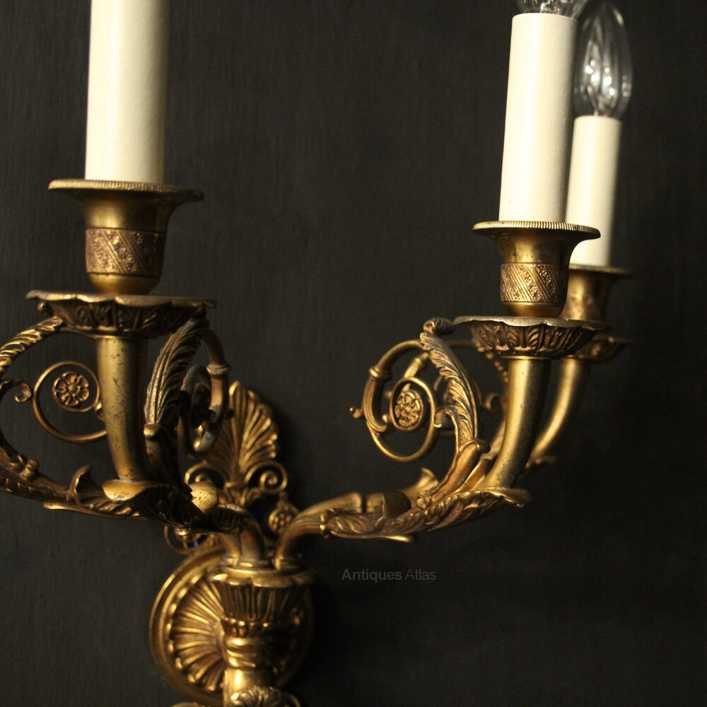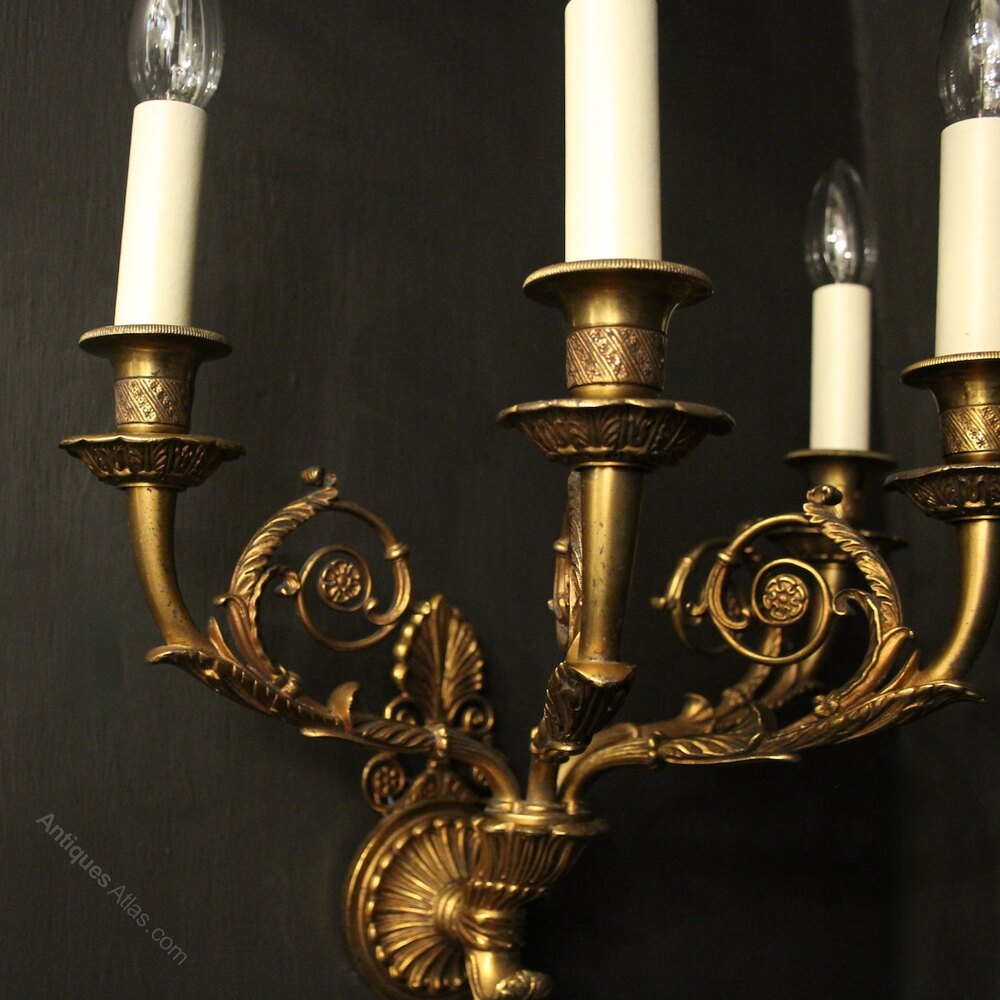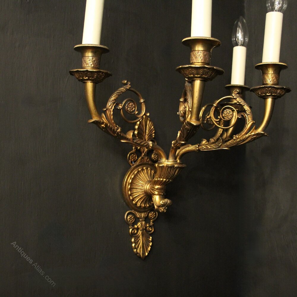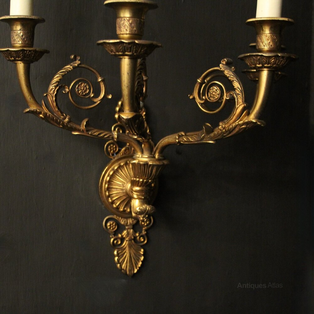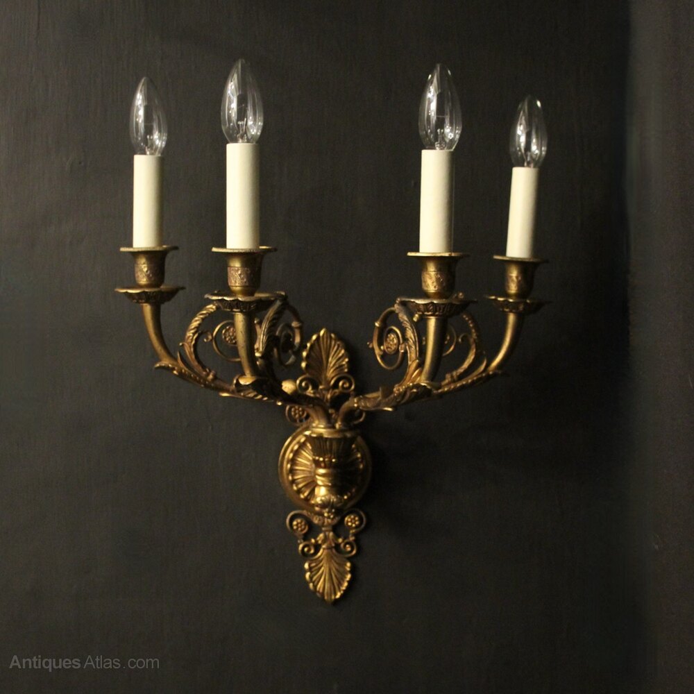 A French single gilded bronze four arm antique wall sconce, the tapering leaf clad scrolling arms with sectional bobeche drip pans and decorative candle sconces, issuing from an ornate reeded circular backplate with Anthemion finial and terminal, great original patination and well cast. Fully rewired and PAT tested. All our wall lights come with aged brass screws for fixing and spare bulbs.