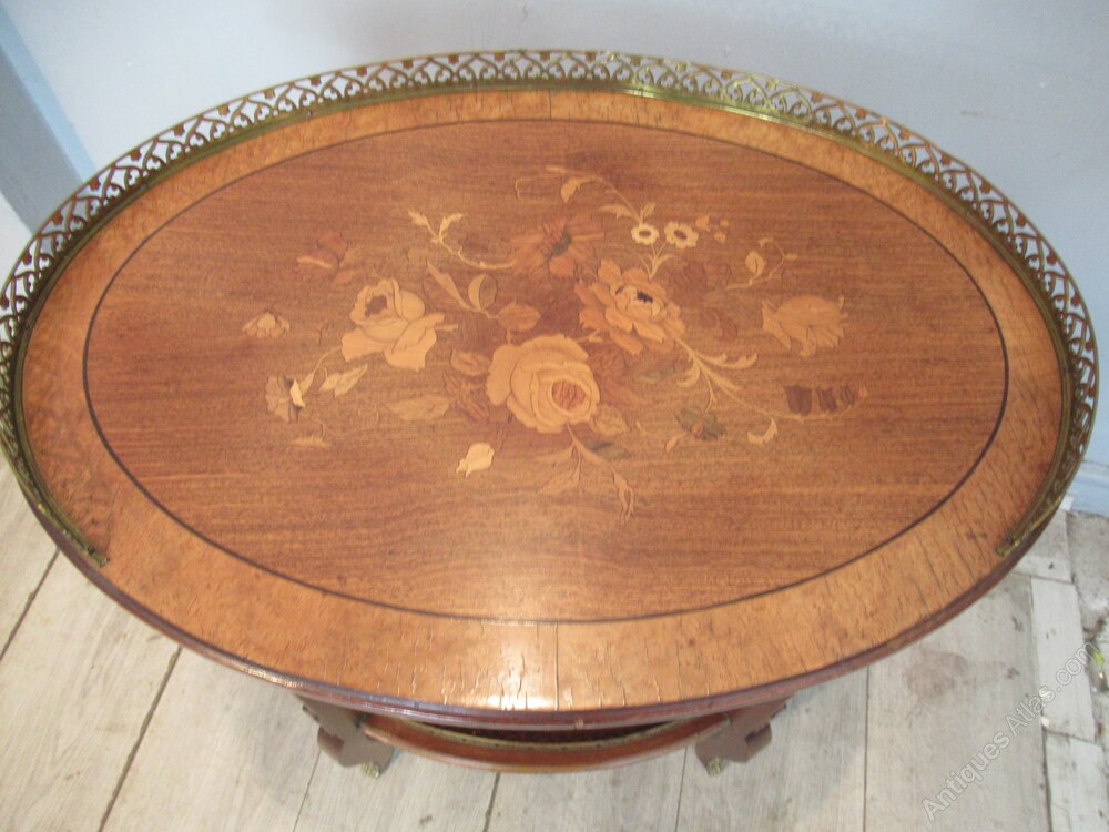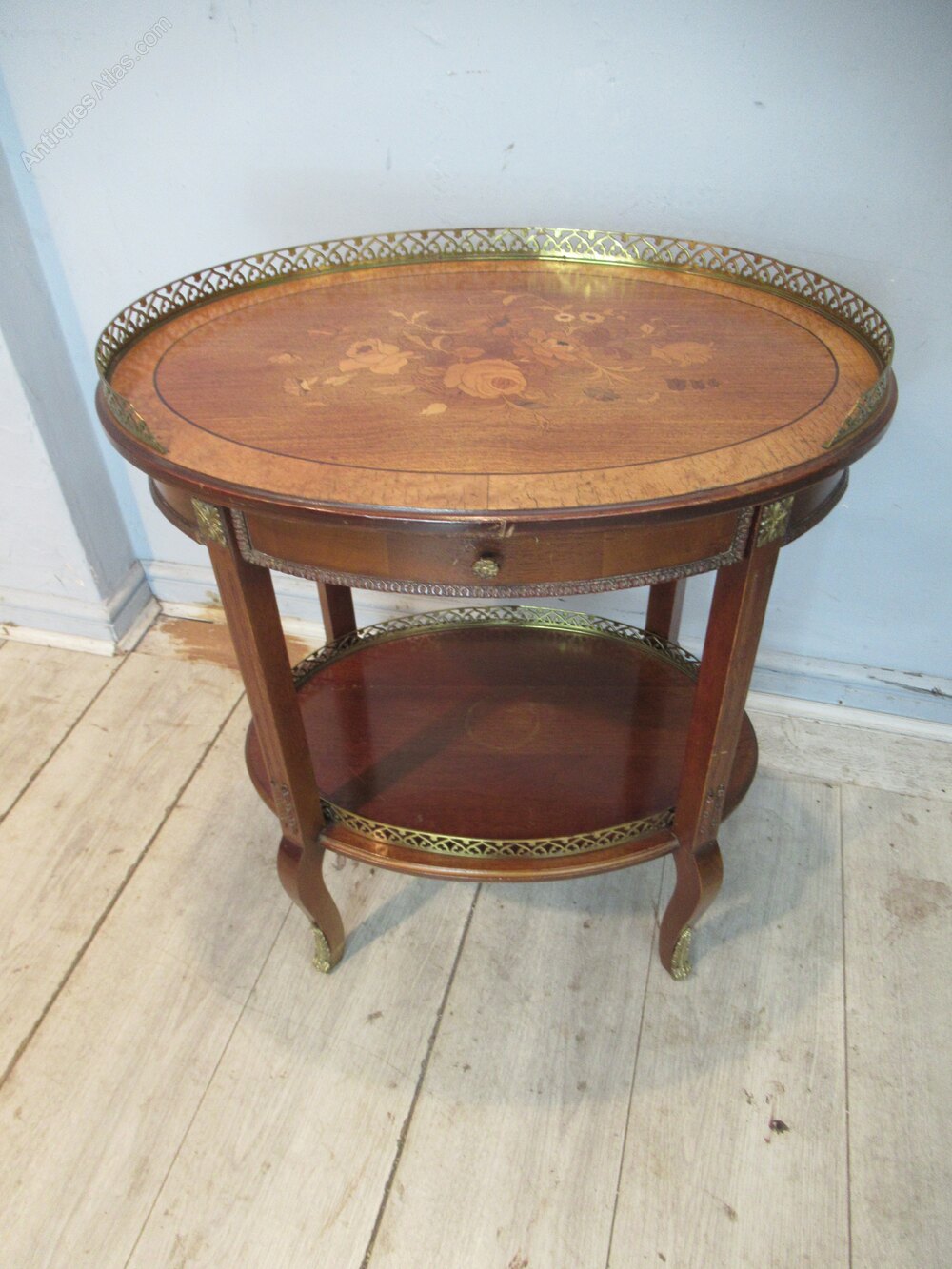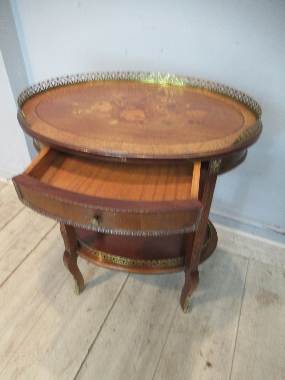 French style oval side table in walnut and with marquetry inlaid floral design. The table has a front drawer with a brass gallery around the top and ornate side / leg mounts.