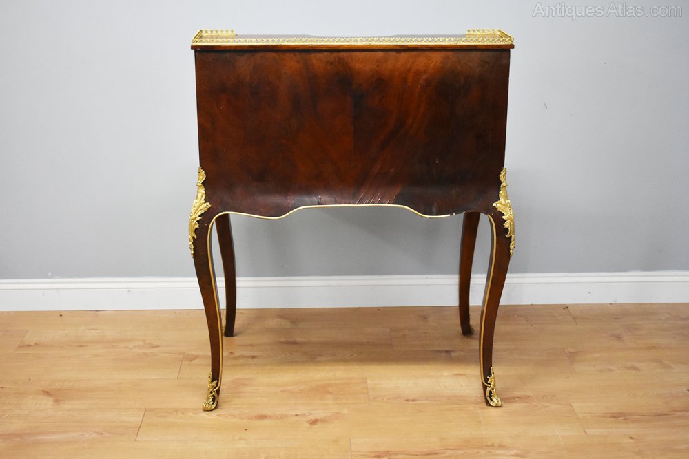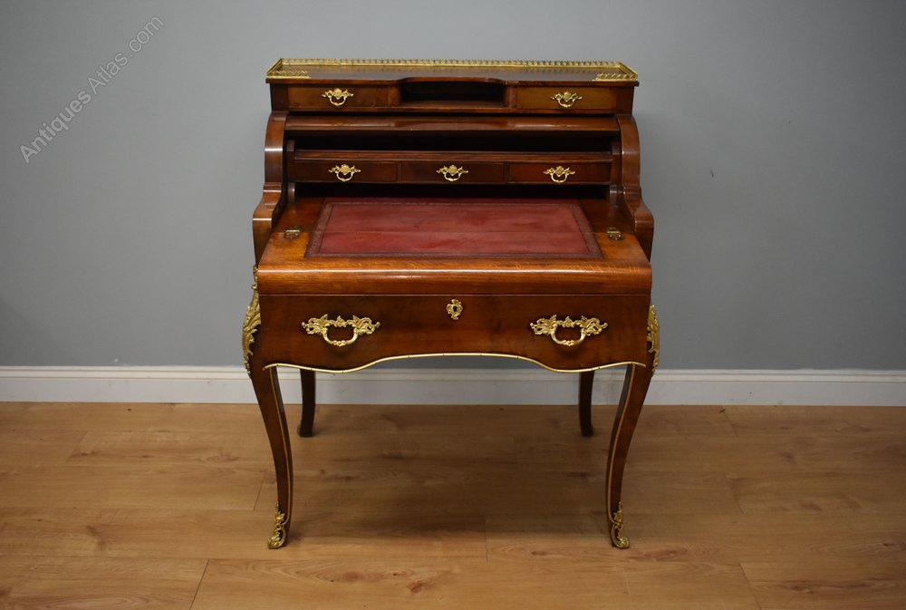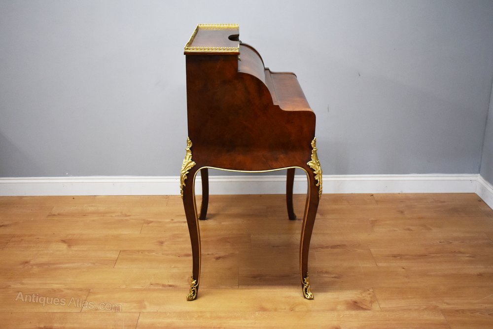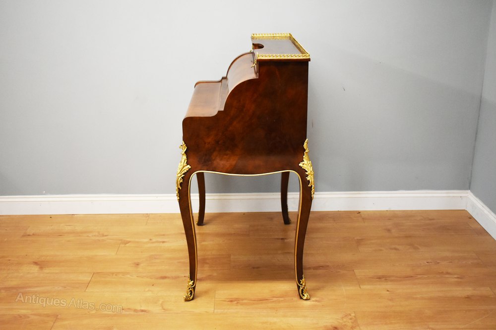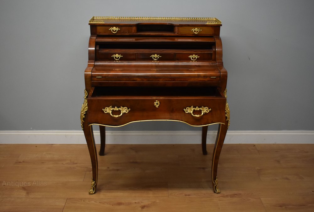 For sale is a good quality Louis XV Style Bonheur Du Jour, with two short drawers at the top, below a cylindrical fall, which opens when the bottom drawer is pulled out. This opens to reveal a further three drawers. Below this is the hinged writing surface. The bonheur du jour stands on elegantly shaped legs, and is decorated with ormolu mounts throughout. There is some slight lifting to the veneer at the back of the desk, and a small piece of brass missing at the back, but overall this piece is generally in good condition, having wear commensurate with age and use.