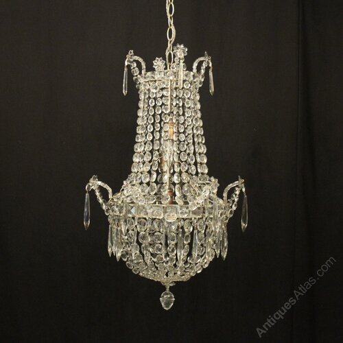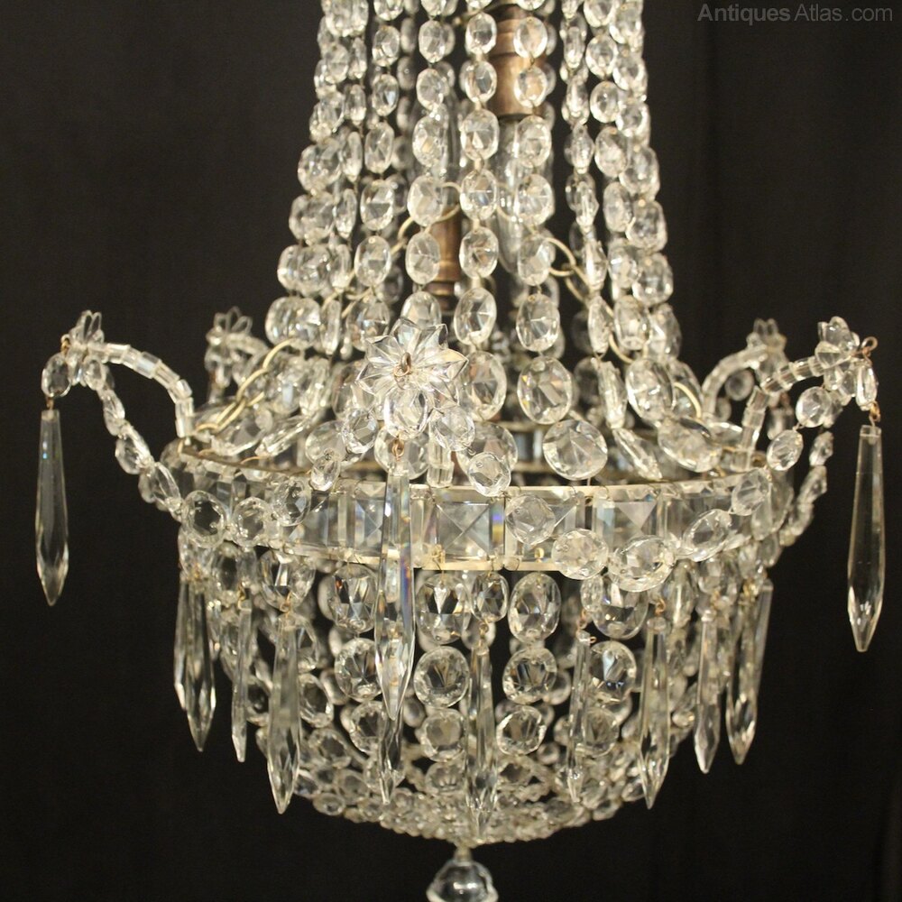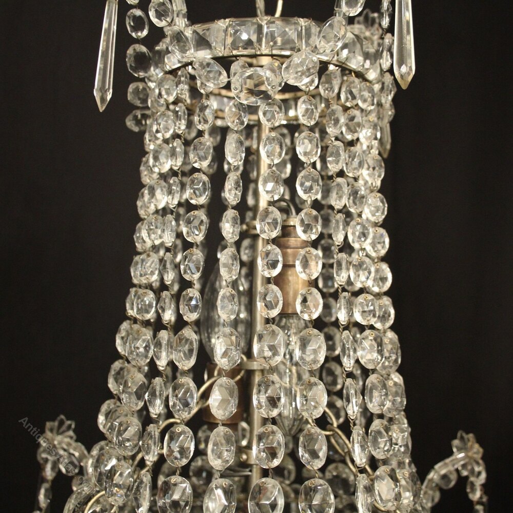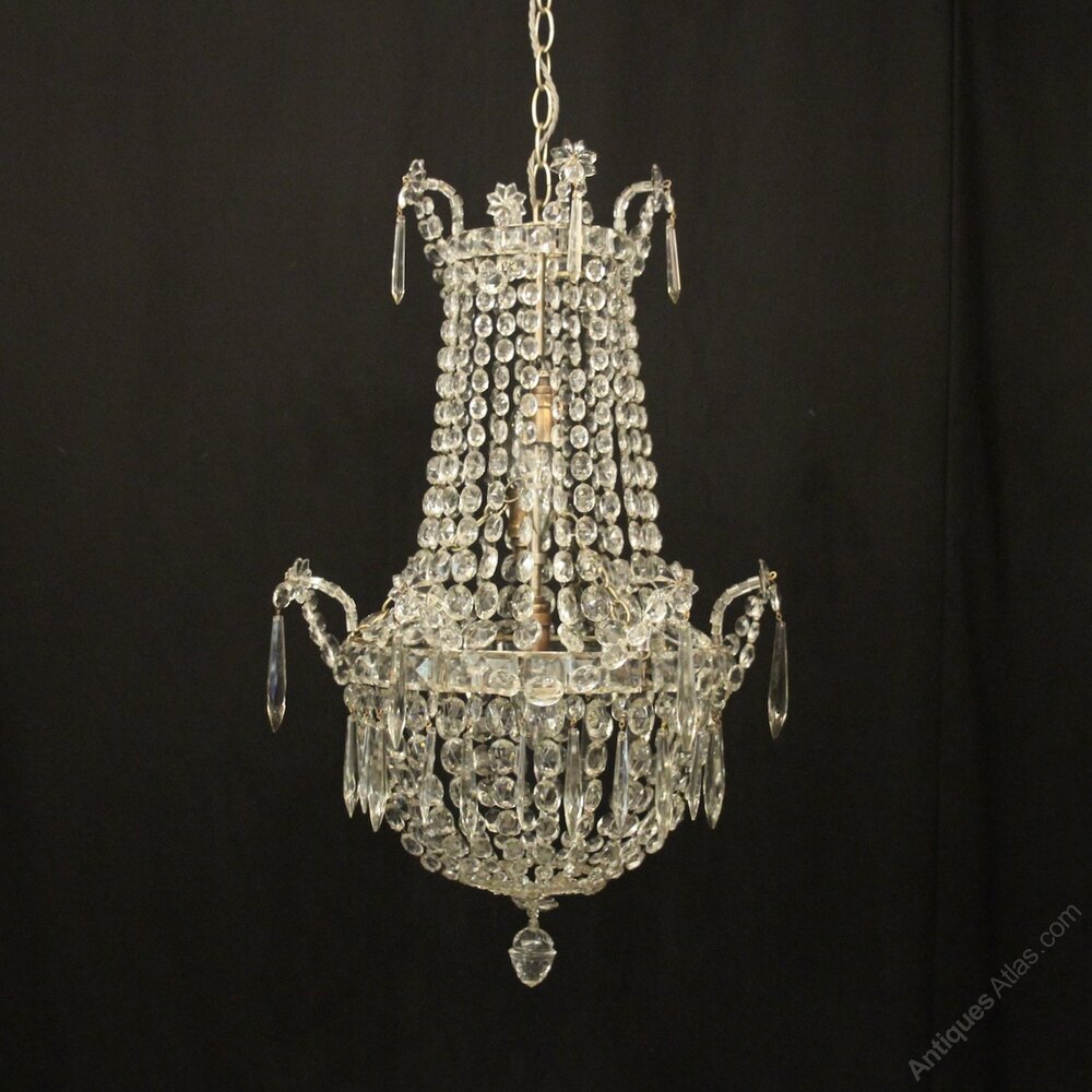 A very pretty French silver gilded crystal triple light tent & waterfall antique chandelier, the three graduated internal light fittings issuing from a central square faceted button band with icicle drops and decorated overall with graduated swaged crystal faceted pendants and floral swags. Having the original chain and ceiling rose. Fully rewired and PAT tested. All our chandeliers come with bulbs and ceiling fixings.