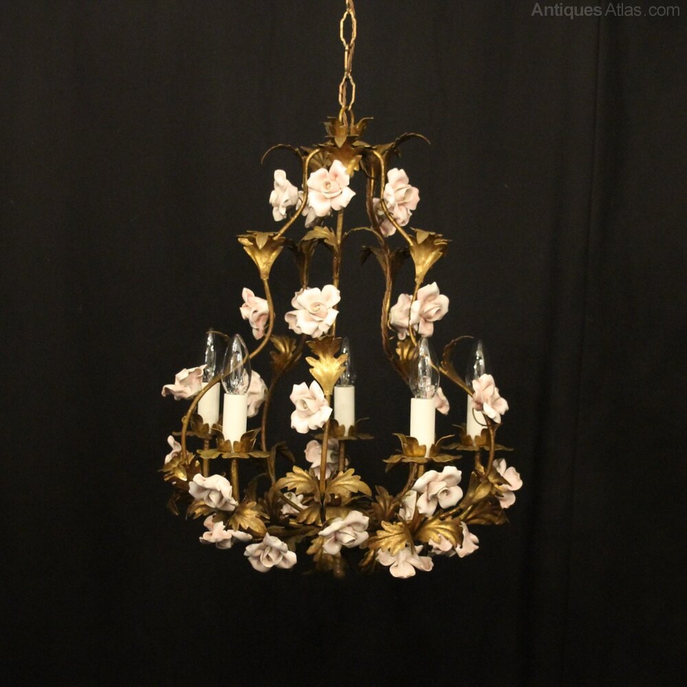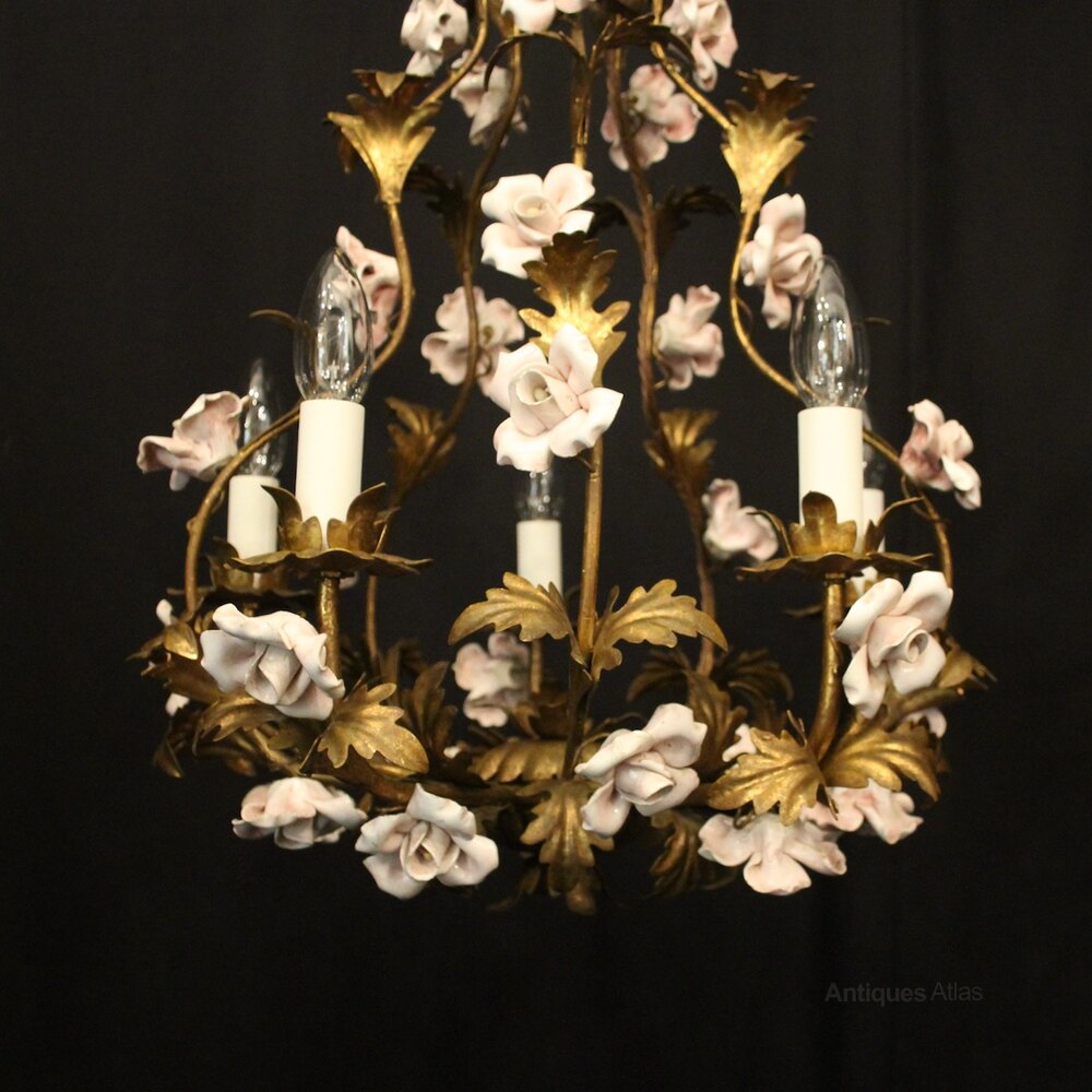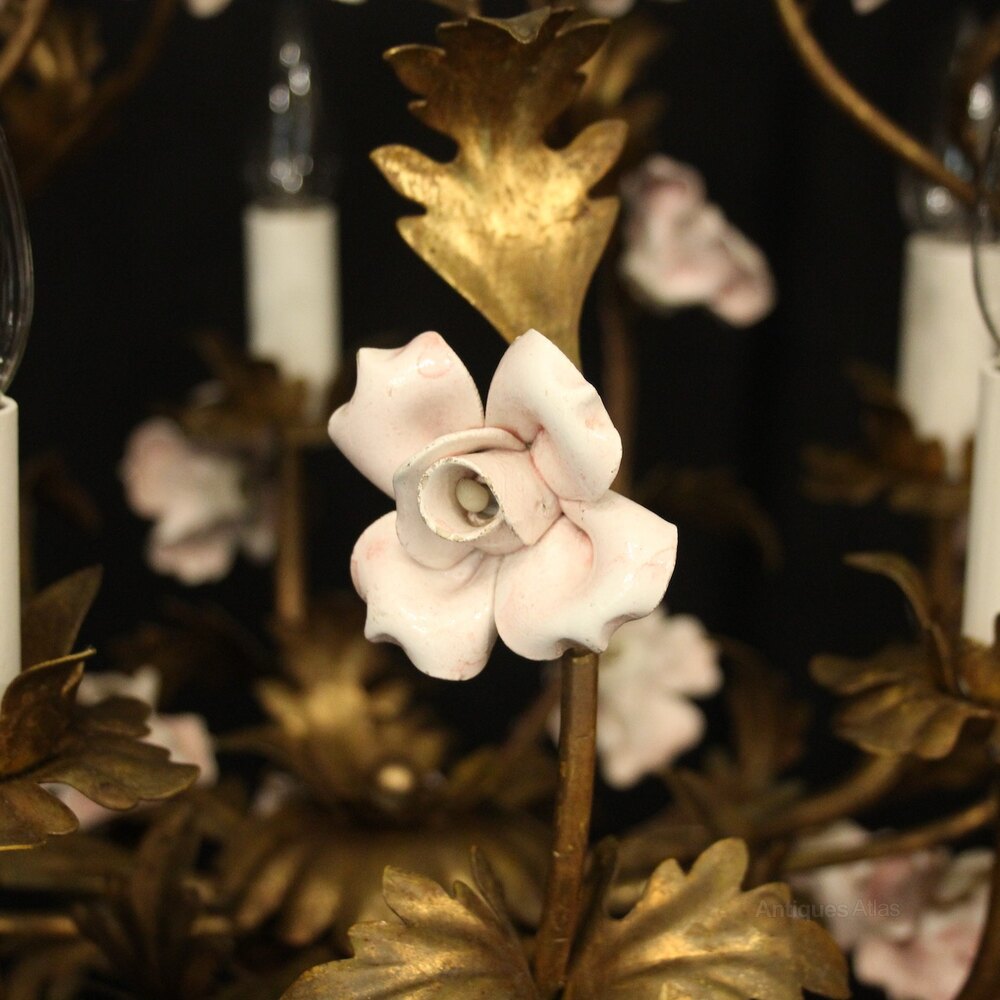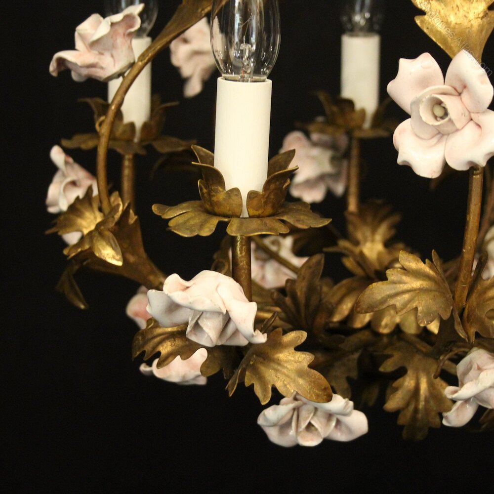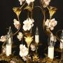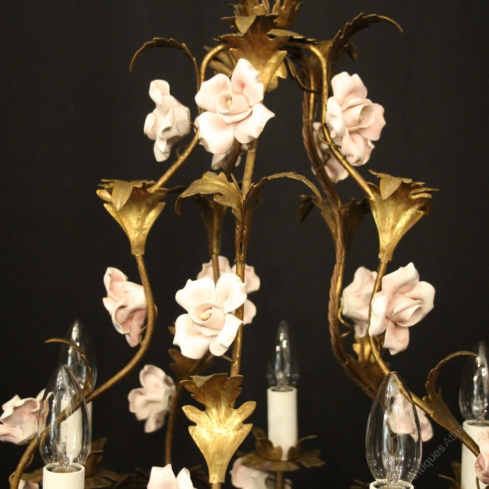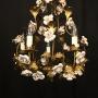 A decorative French gilded 5 Light birdcage form chandelier, the leaf scrolling arms with sectional leaf bobeche drip pans, issuing from an cage form leaf interior and scrolling leaf canopy, decorated overall with pink and cream coloured porcelain flowers and having the original chain and ceiling rose. Fully rewired and PAT tested. All our chandeliers come with ceiling fixings and spare bulbs.