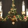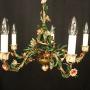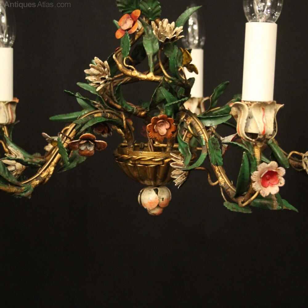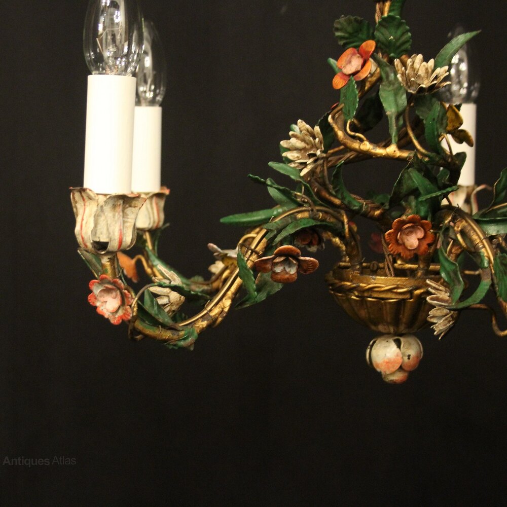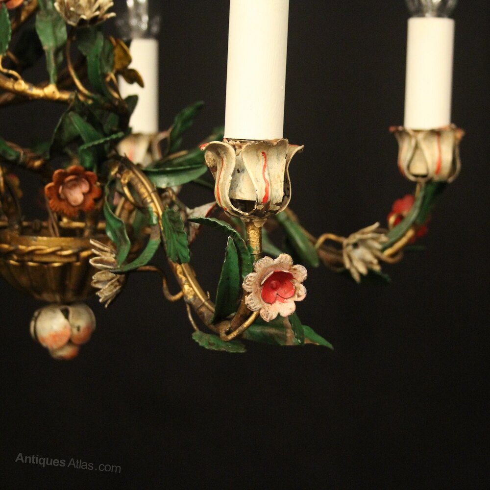 A decorative French polychrome toleware floral five light antique chandelier, the leaf scrolling arms with sectional leaf bobeche drip pans, issuing from an ornate leaf centre with polychrome flower heads and having the original chain and ceiling rose. Lovely original patination and very decorative. Fully rewired and PAT tested. All our chandeliers come with bulbs and ceiling fixings.