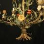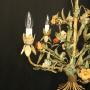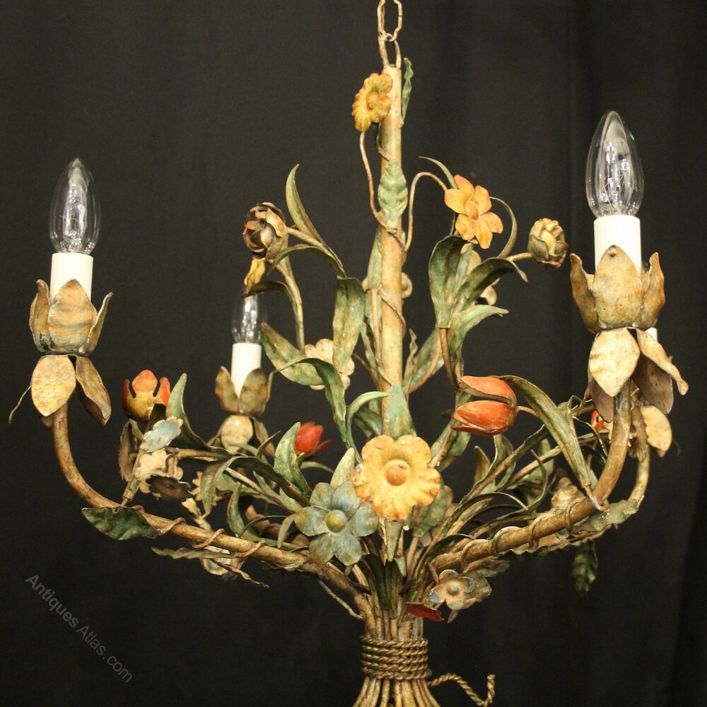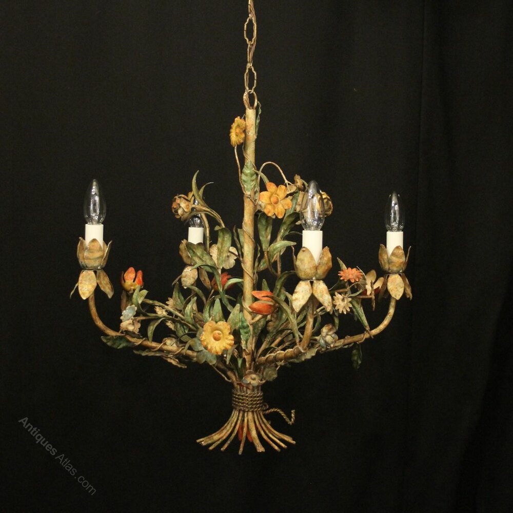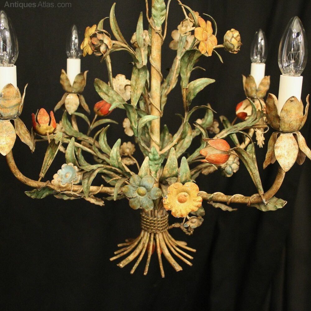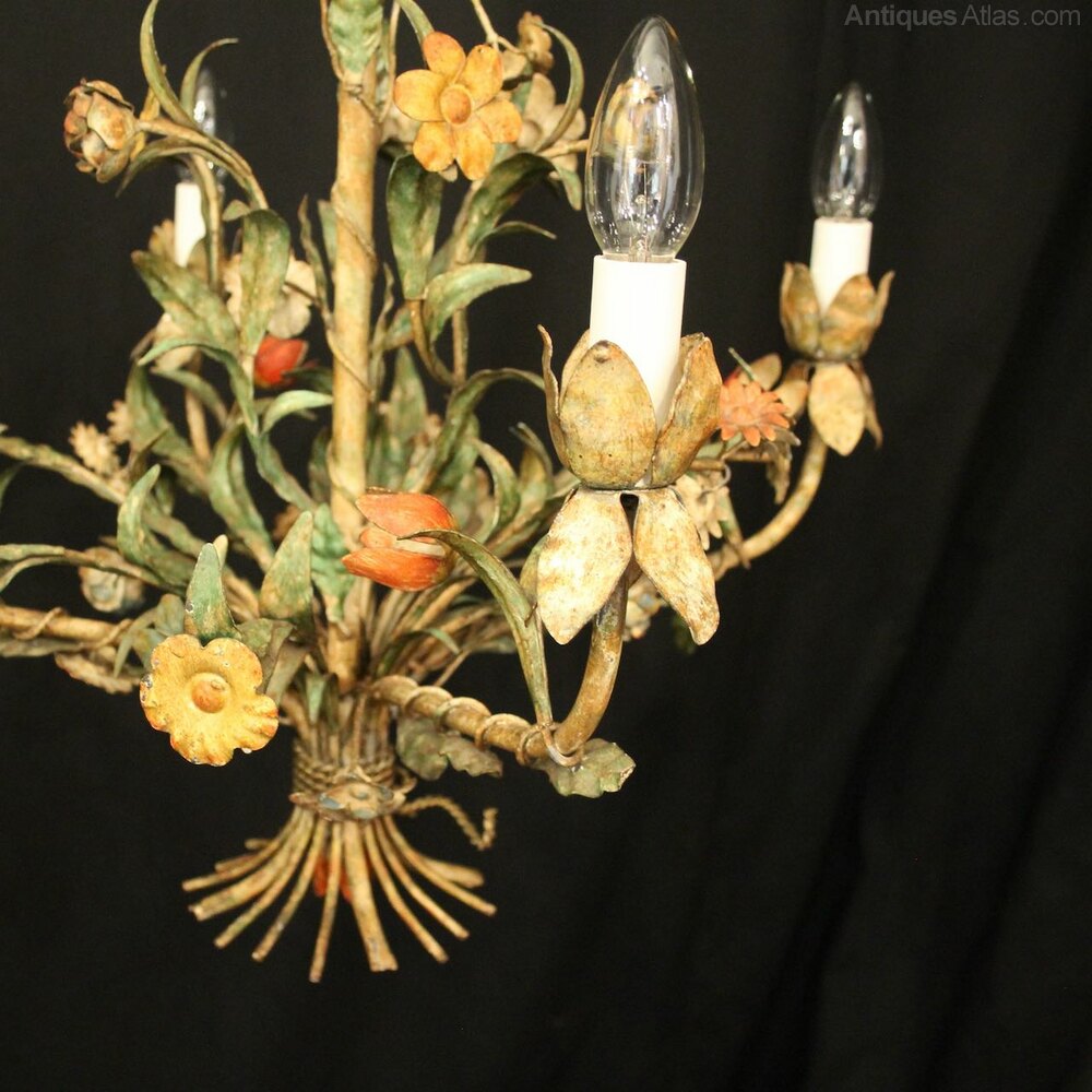A decorative French polychrome toleware floral four light antique chandelier, the leaf scrolling arms with sectional leaf bobeche drip pans, issuing from an ornate leaf centre with polychrome flower heads and having the original chain and ceiling rose. Lovely original patination and very decorative. Fully rewired and PAT tested. All our chandeliers come with bulbs and ceiling fixings.