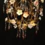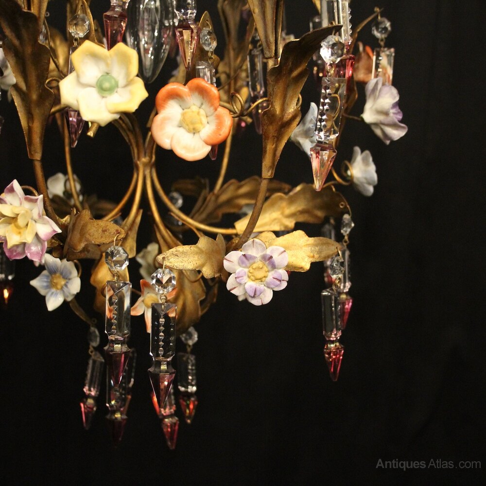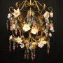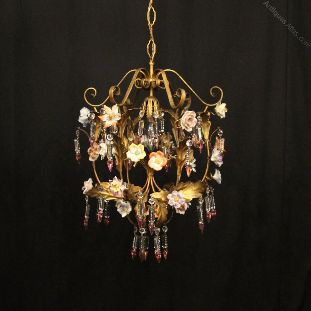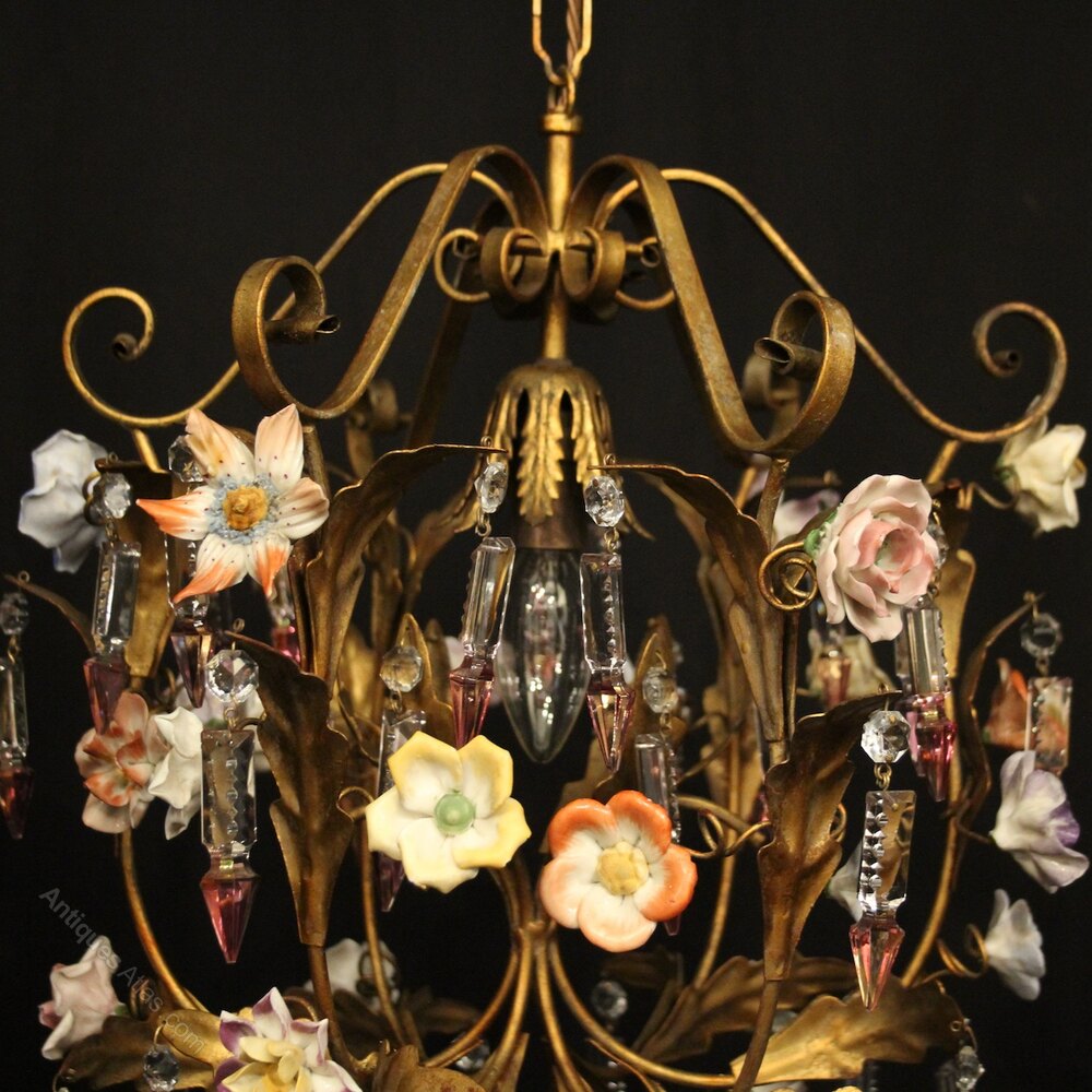 A decorative French toleware and crystal single light birdcage chandelier, the single inverted light fitting surrounded by a scrolling toleware cage form interior, decorated overall with porcelain flowers and crystal faceted crystal pendants and having the original chain and ceiling rose, very pretty and good small scale. Fully rewired and PAT tested. All our chandeliers come with ceiling fixings and spare bulbs.