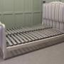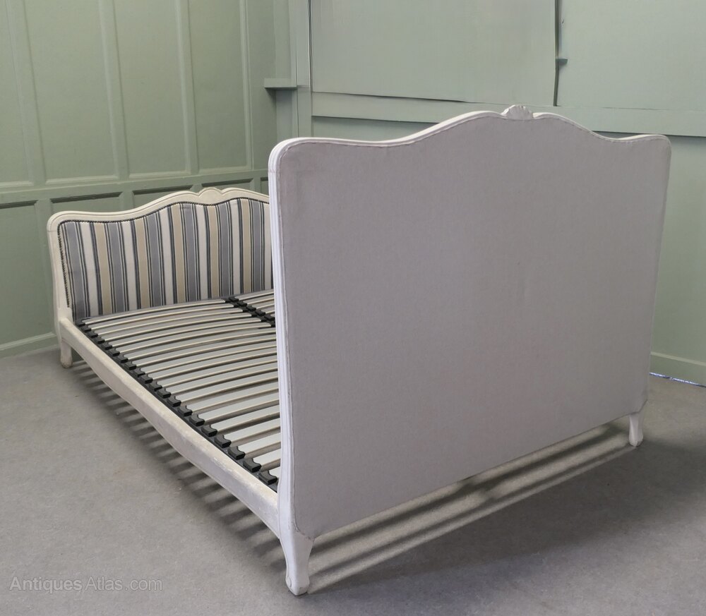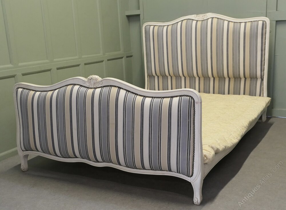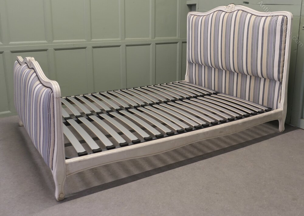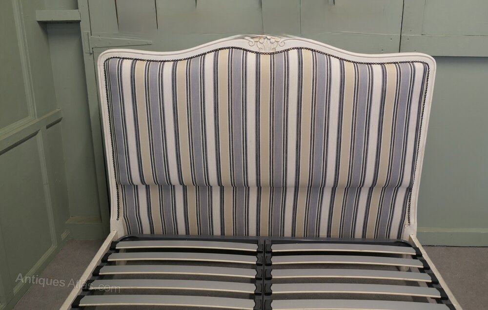 The Head and foot boards of this bed have a carved waved top rail, the bed comes newly upholstered in striped French jacquard upholstery, which is in classical blue/grey and cream, this matches the old white crackle finish paint which retains the original shabby look