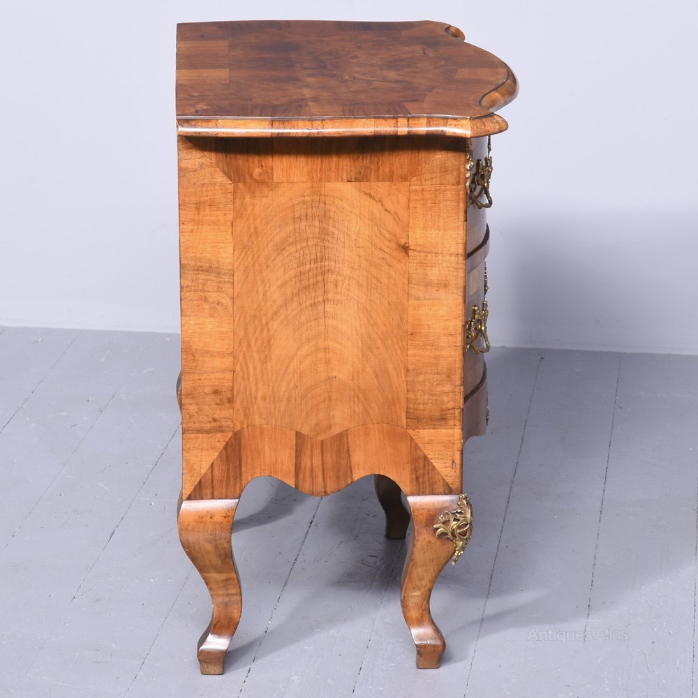 Circa 1870. A French walnut serpentine shape commode. The top in book matched walnut veneers and broad cross-banding, with a lovely moulded fore edge and a configuration of two full length bow fronted drawers, each of the drawers with a stylish pierced brass and gilded escutcheon and a fine pair of rococo handles. The drawers have similar veneering as the top, the chest has a rounded fore edge with small brass mounts on the top, polished gables with broad cross-banding, a shaped frieze and legs with brass mounts, all resting on four simple cabriole legs.