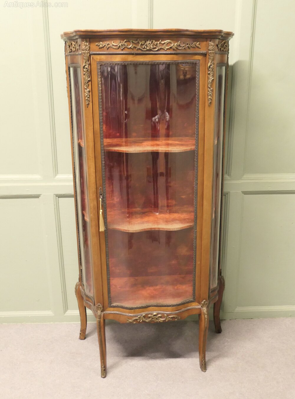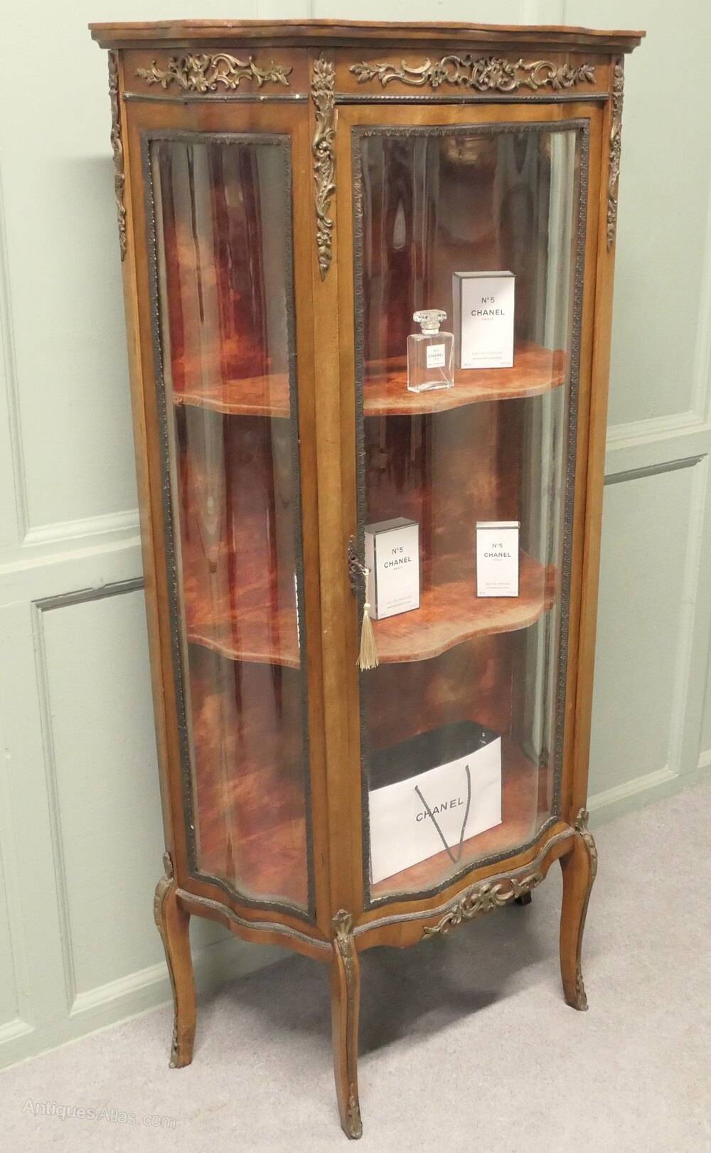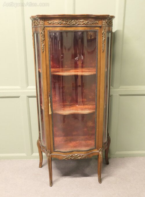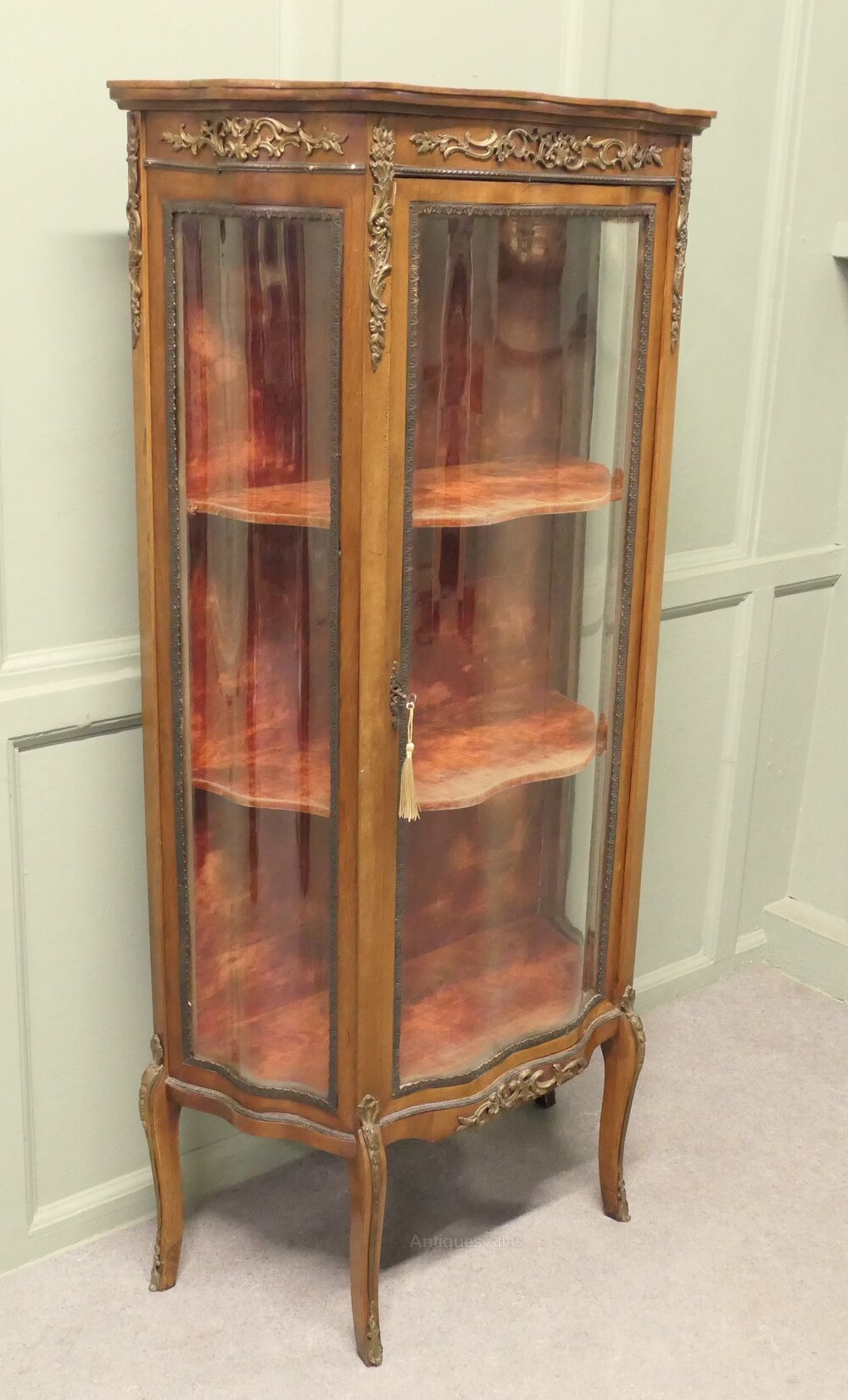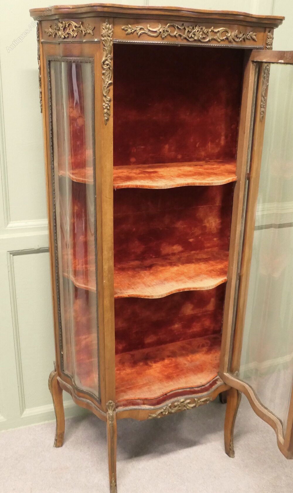 This is a superb piece of French display furniture, the cabinet has a serpentine shape to both the glass door and the sides, it has 3 shelves and the interior is lined in its original age worn velvet, and it is is set on cabriole legs