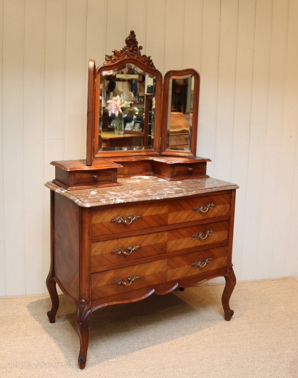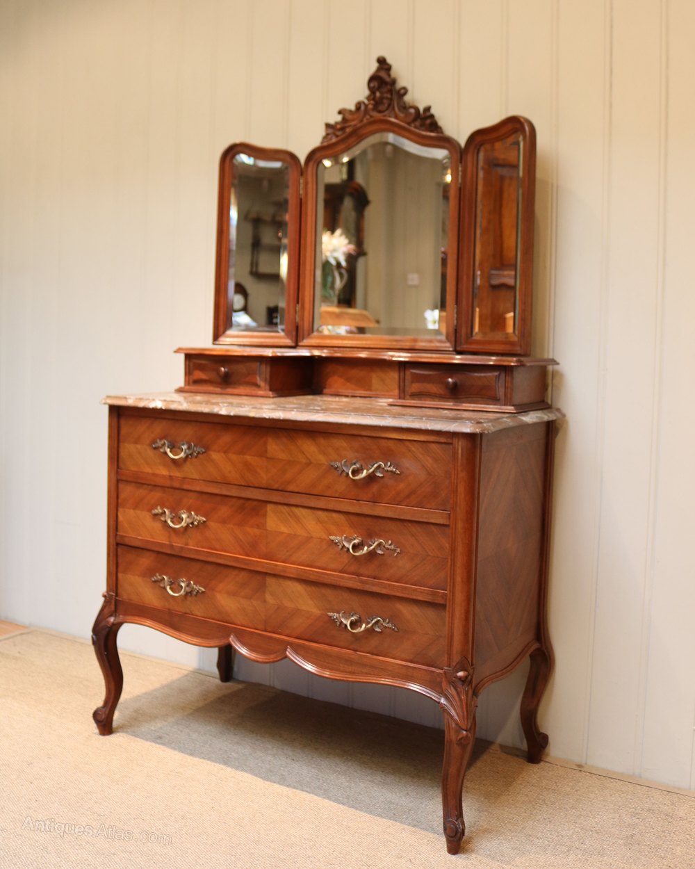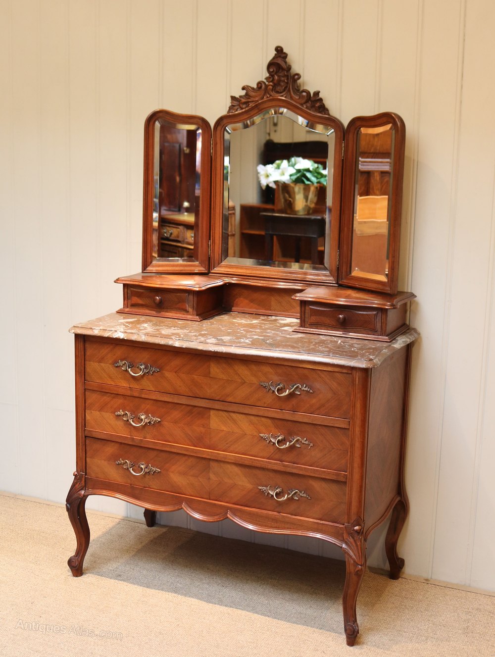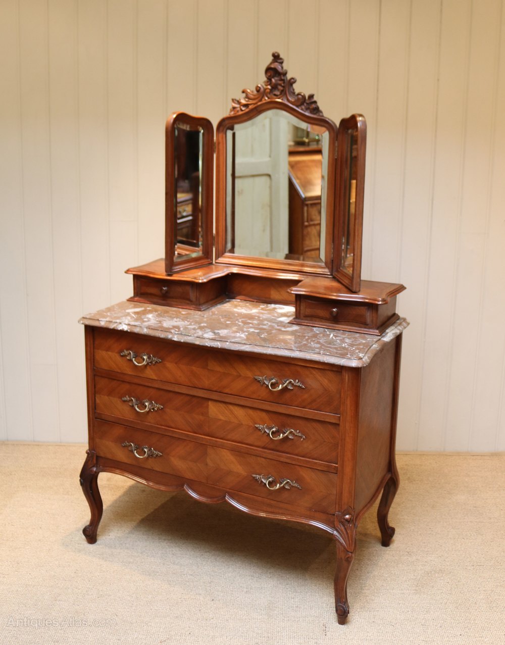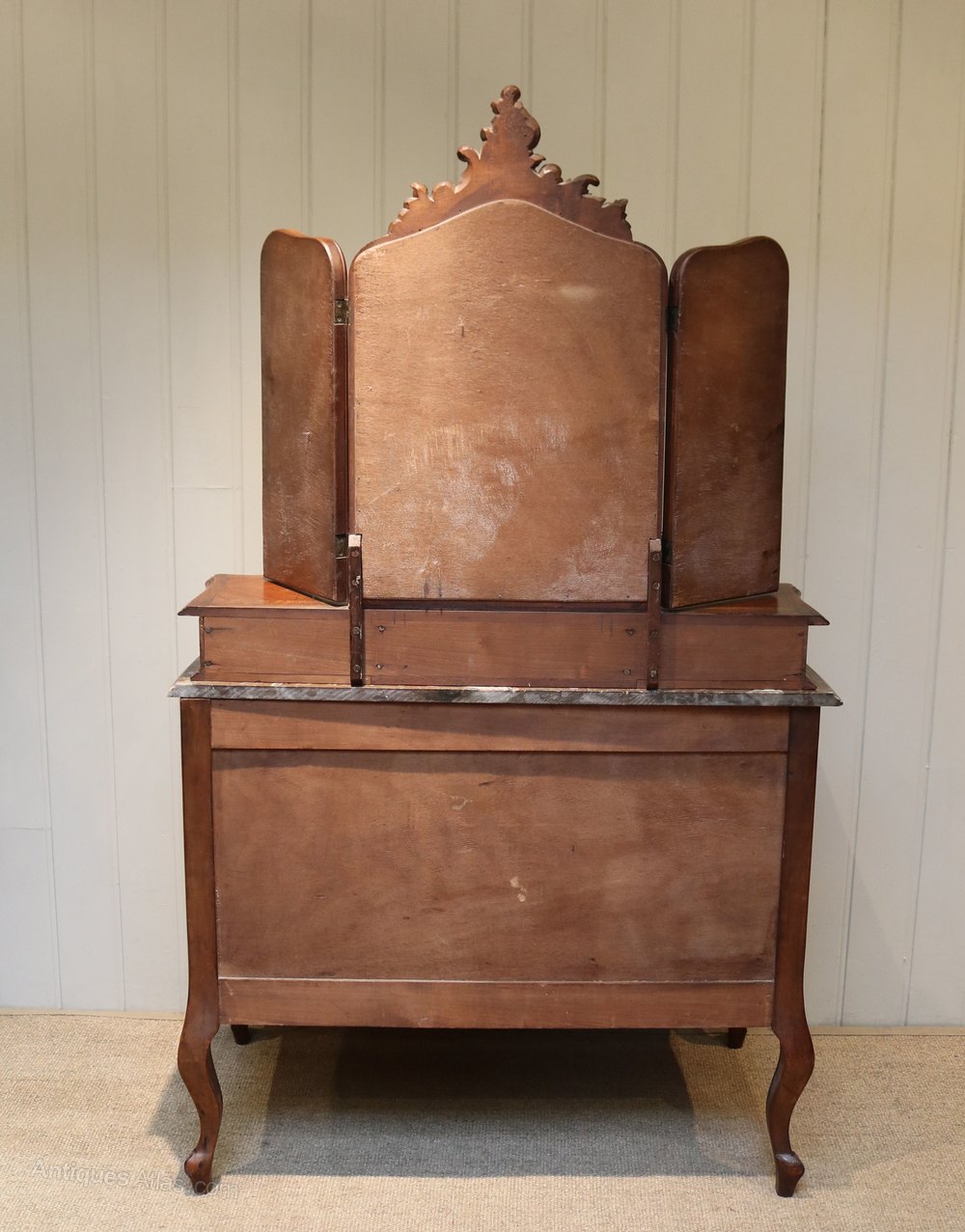 French walnut duchess dressing table having a triple bevel edge mirror with two small drawers to each side, set on a marble top with three base drawers, raised on cabriole legs.