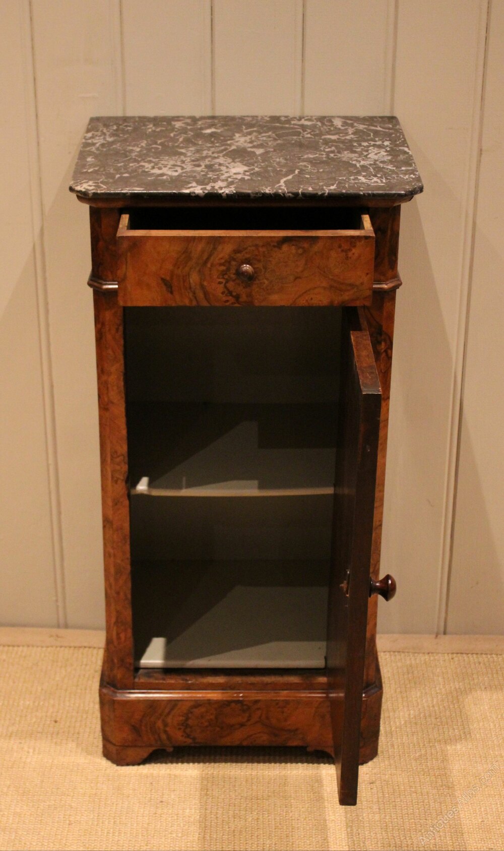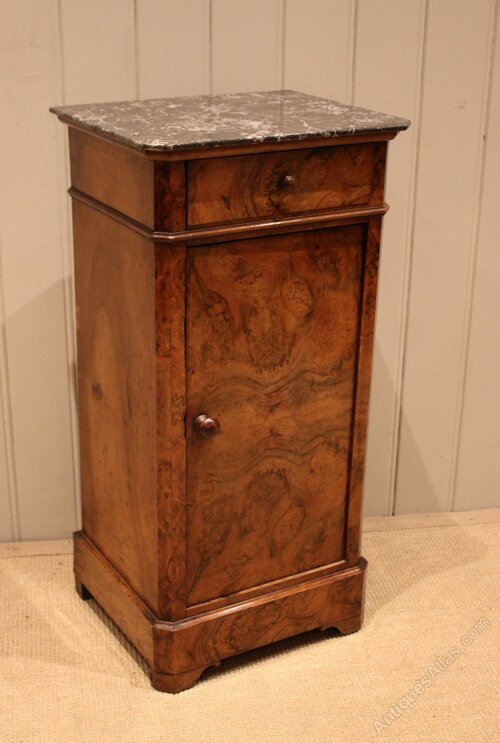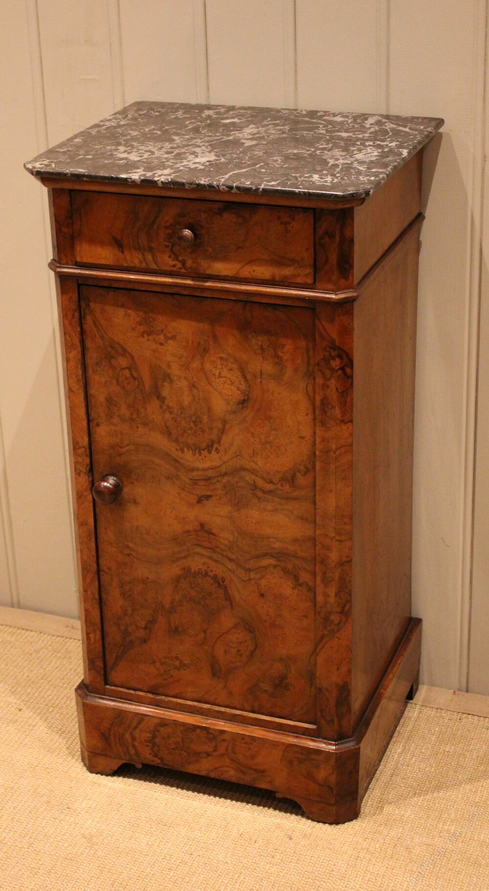 French walnut marble top night stand having a single drawer with a cupboard to the base with a fixed internal shelf , raised on a plinth base.