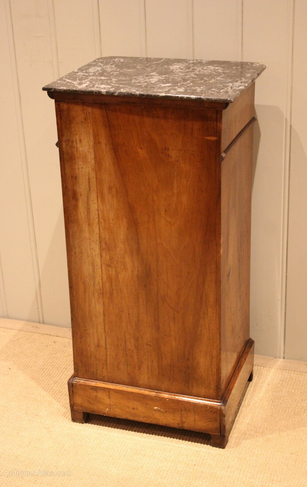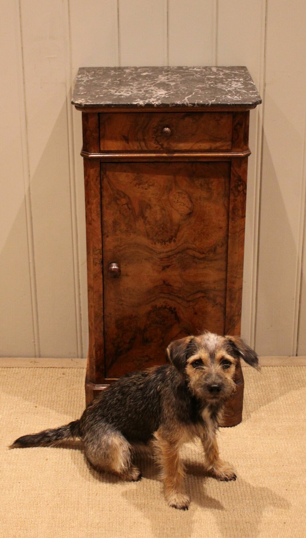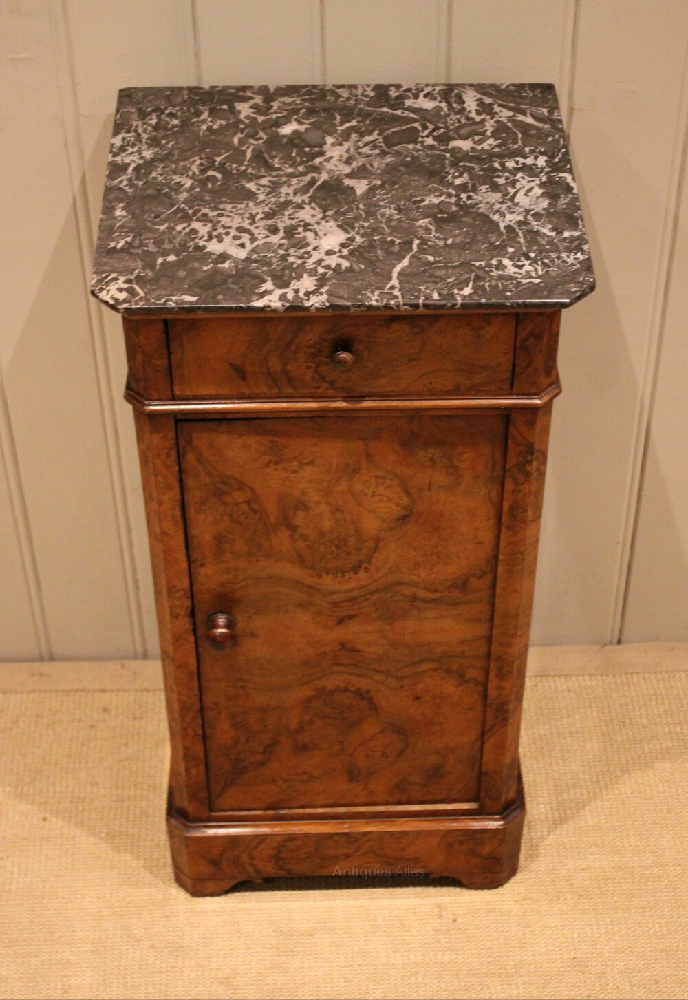 French walnut marble top night stand having a single drawer with a cupboard to the base with a fixed internal shelf , raised on a plinth base.