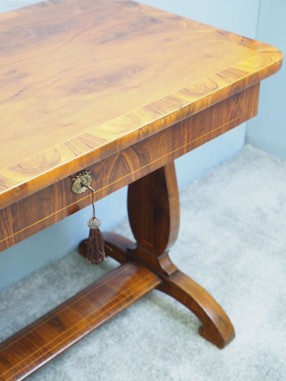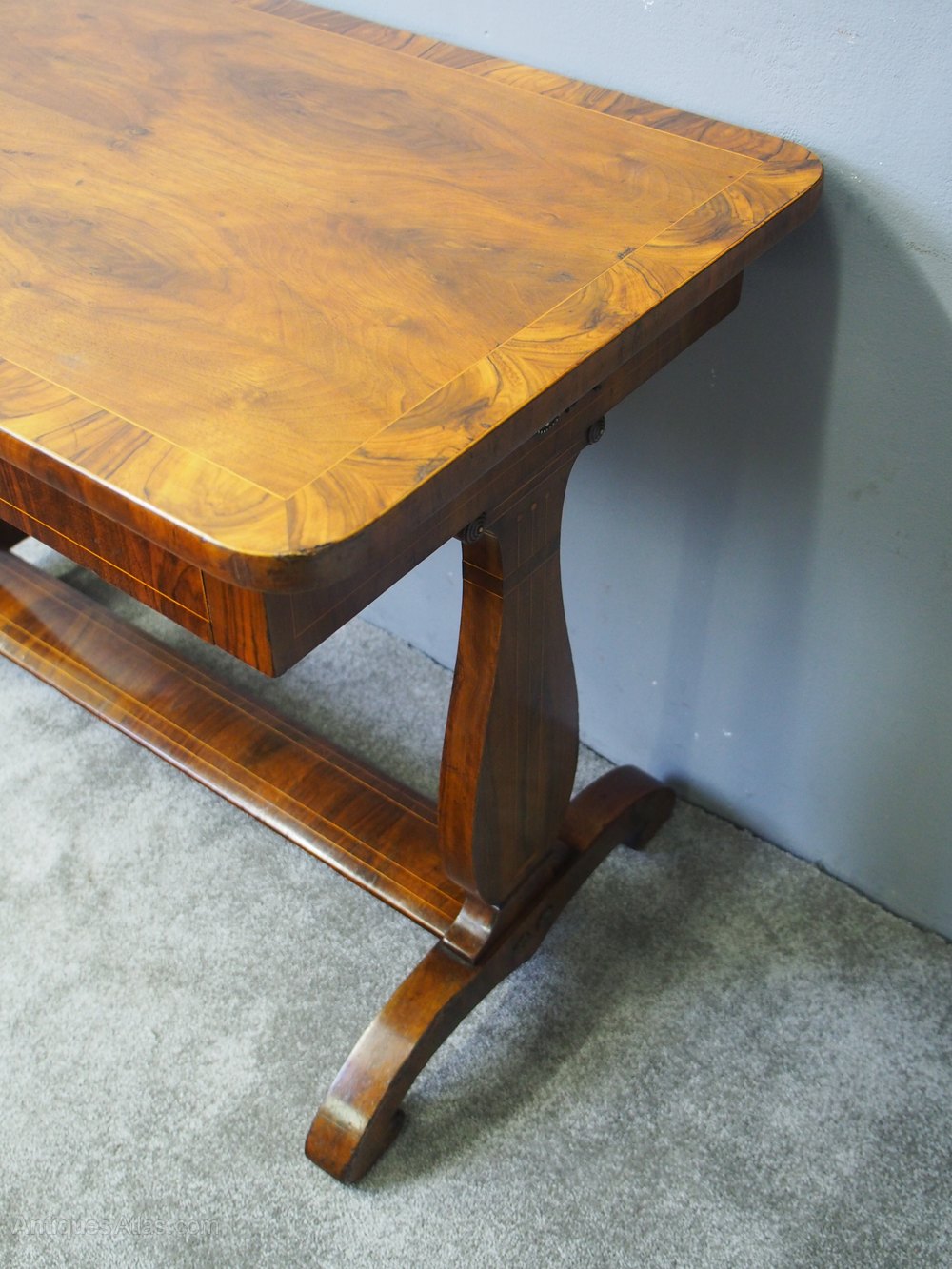 Circa 1850, French figured walnut hall or side table. The rectangular top with rounded corners in mirror matched figured walnut has boxwood stringing and walnut cross banding. The full-length frieze inlaid drawer has a foliate brass escutcheon, and the side friezes have Neoclassical ormolu mounts. This is all above shaped inlaid trestle supports on shaped bases, connected by an inlaid curved stretcher.