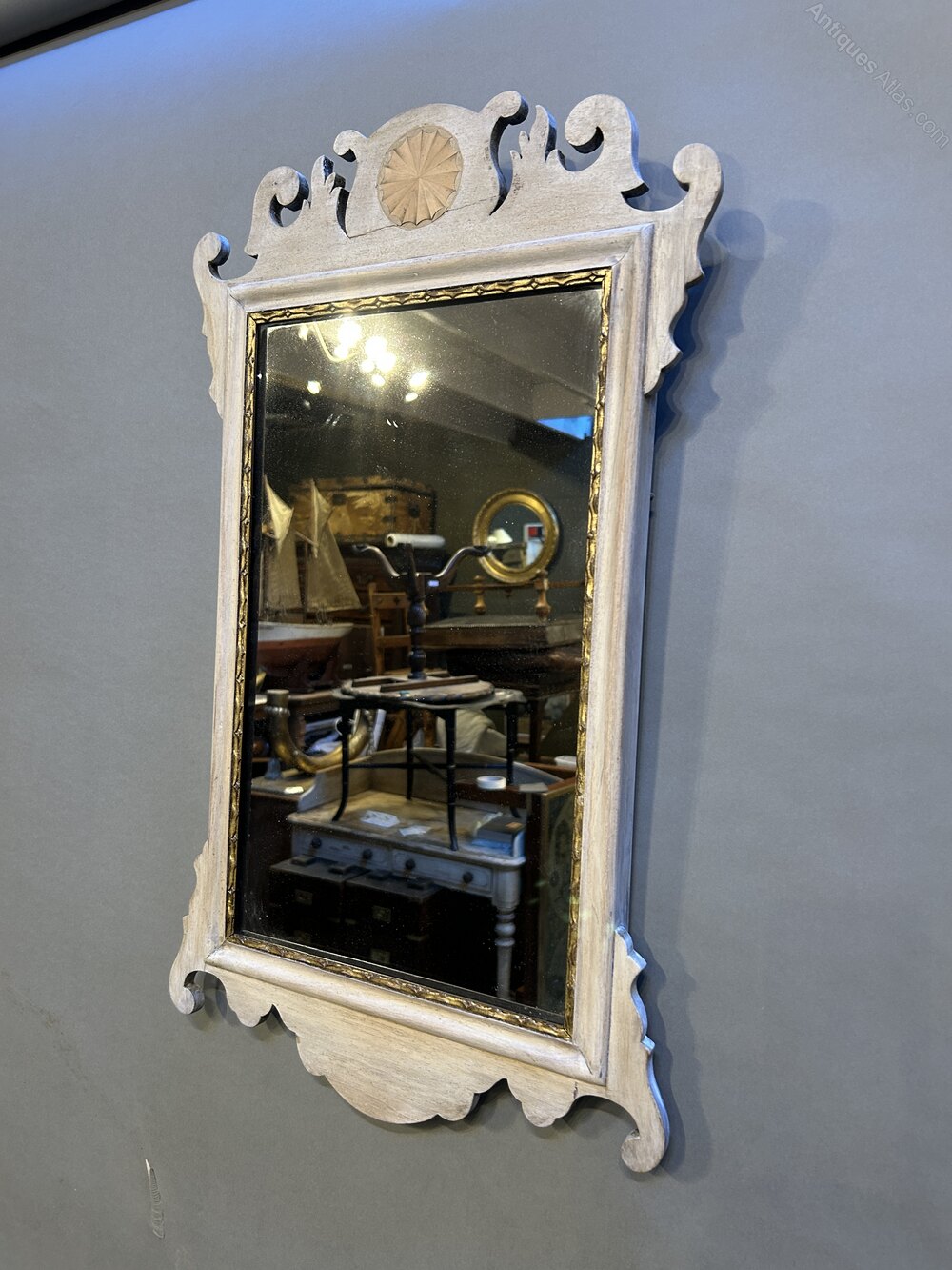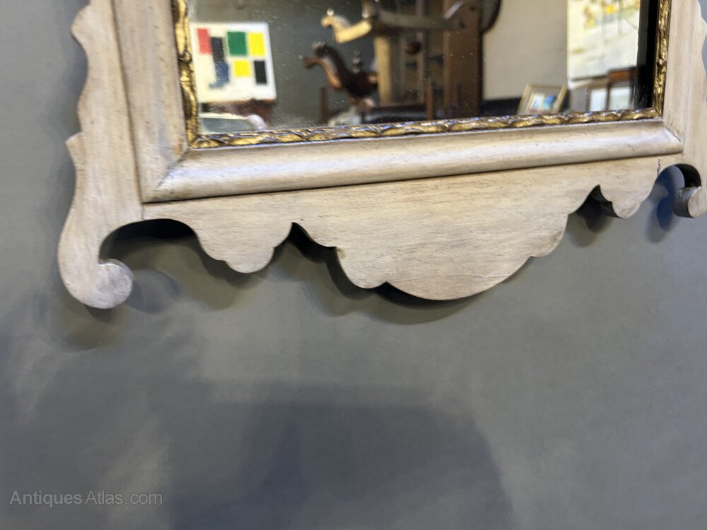 Edwardian in the Georgian manner , the fret-cut bleached mahogany frame with fan inlay enclosing parcel gilt slip and original plate.