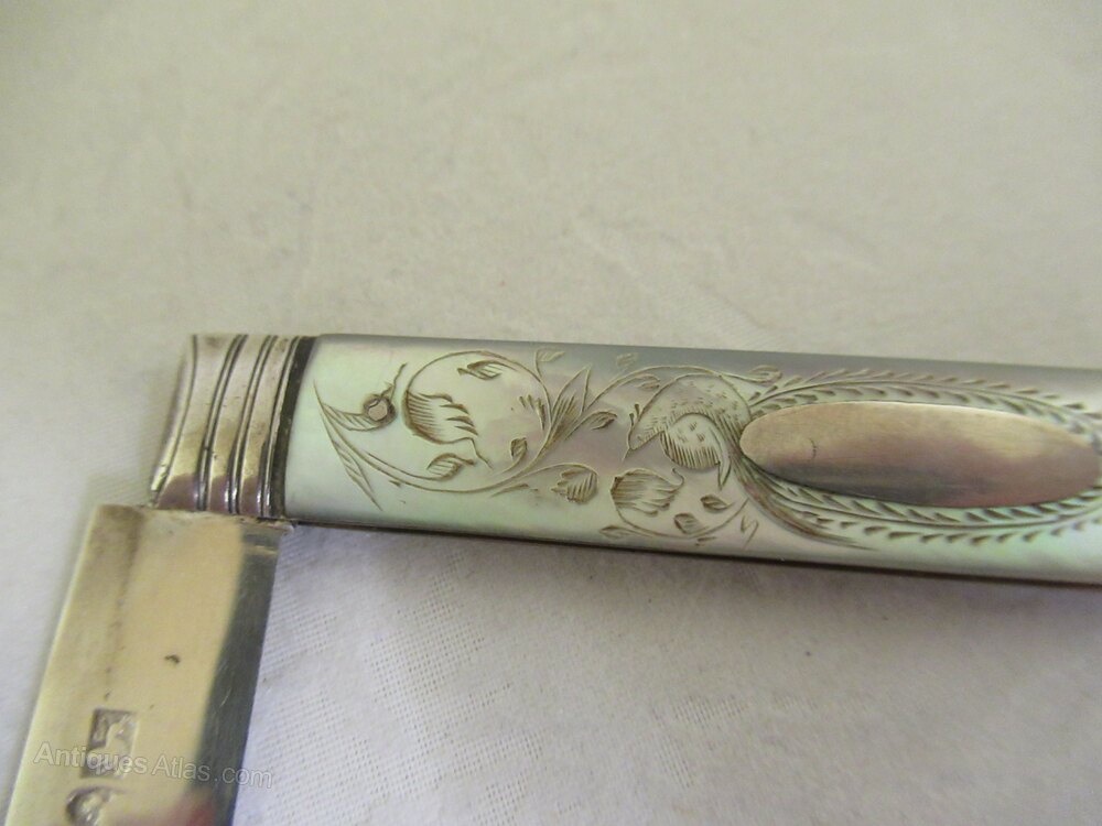 Attractive shaped Mother of Pearl scales to both sides, with pretty engraving. On the face side foliage and a stylised bird, next to the hinge. A sort of starburst to the other end and with an oval, vacant cartouche, between. Engine turned silver hinge facings.
