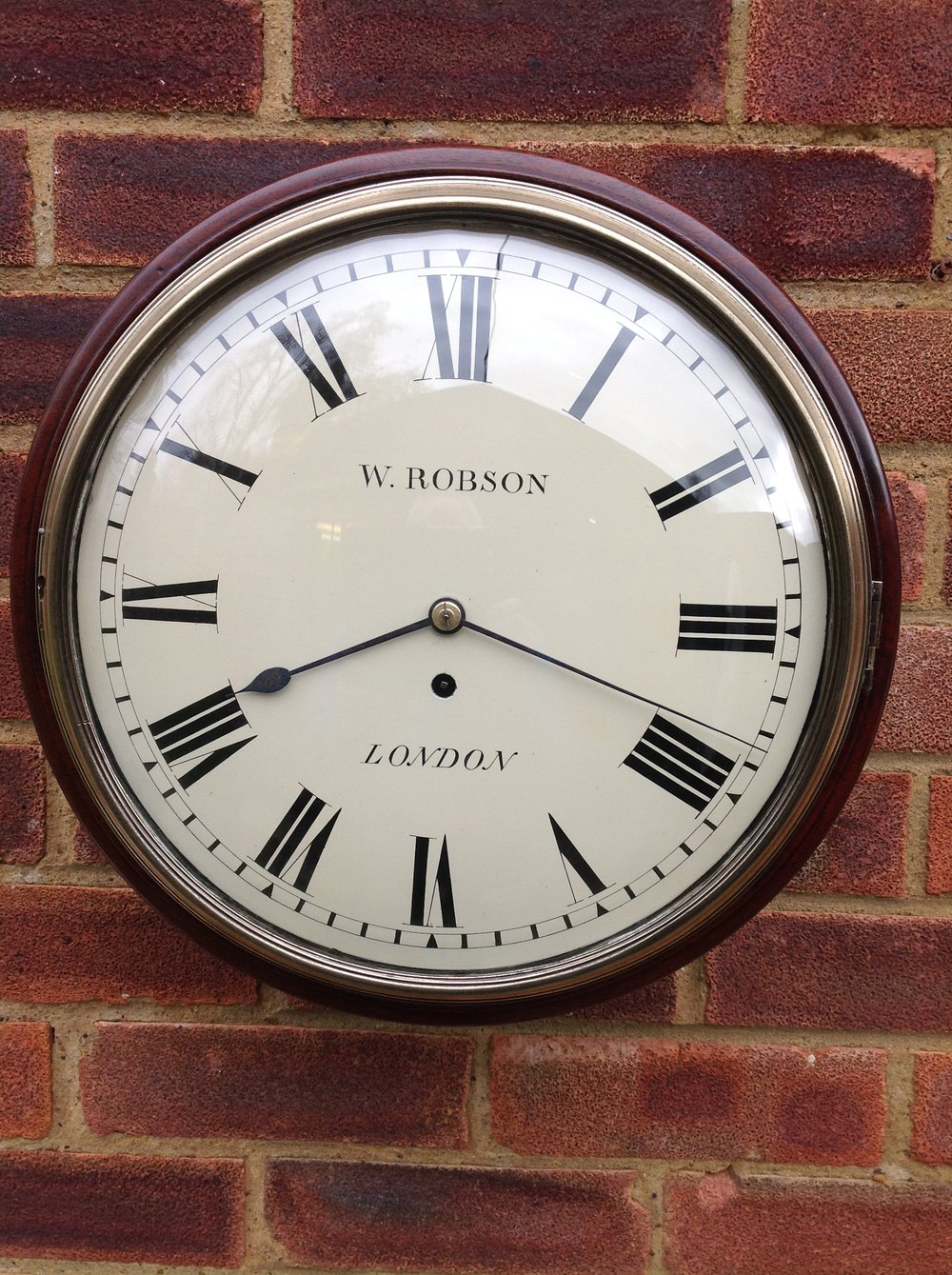 12" original painted convex dial, protected by a glazed concave bezel. With early method of dial fixing, with pins passing through the wood surround. Fine blued steel hands.