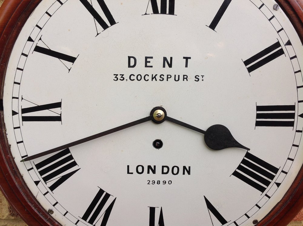 19th century 8 day fusee wall antique clock by Dent, 33, Cockspur street, London, and numbered 23890.