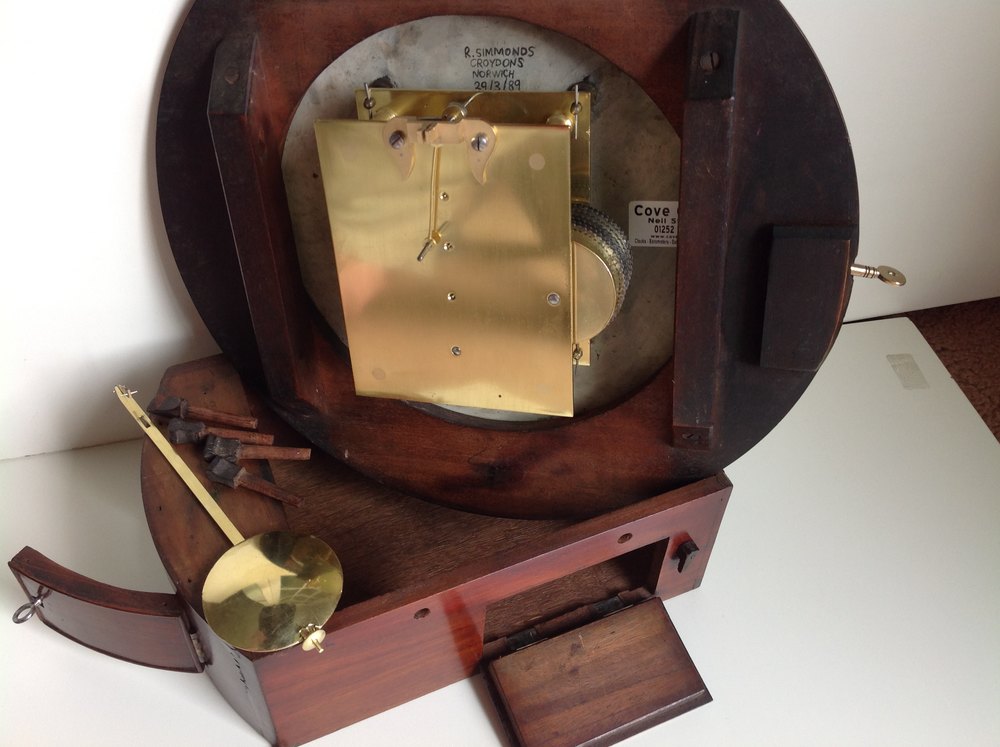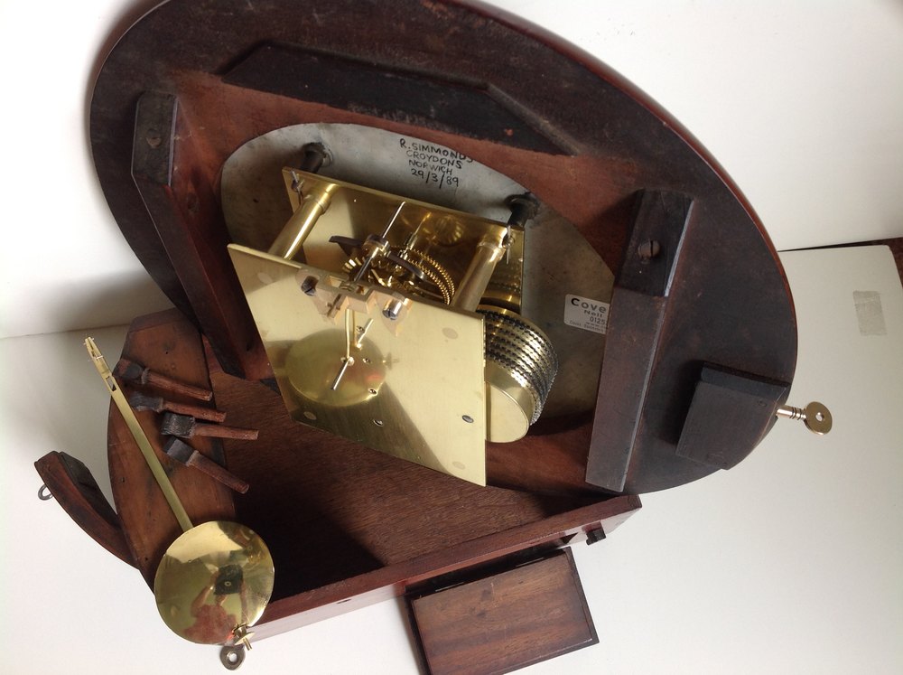 Mahogany 2 piece case, back box and bezel secured by 4 pegs. Back box has locking bottom door and pendulum side access door.