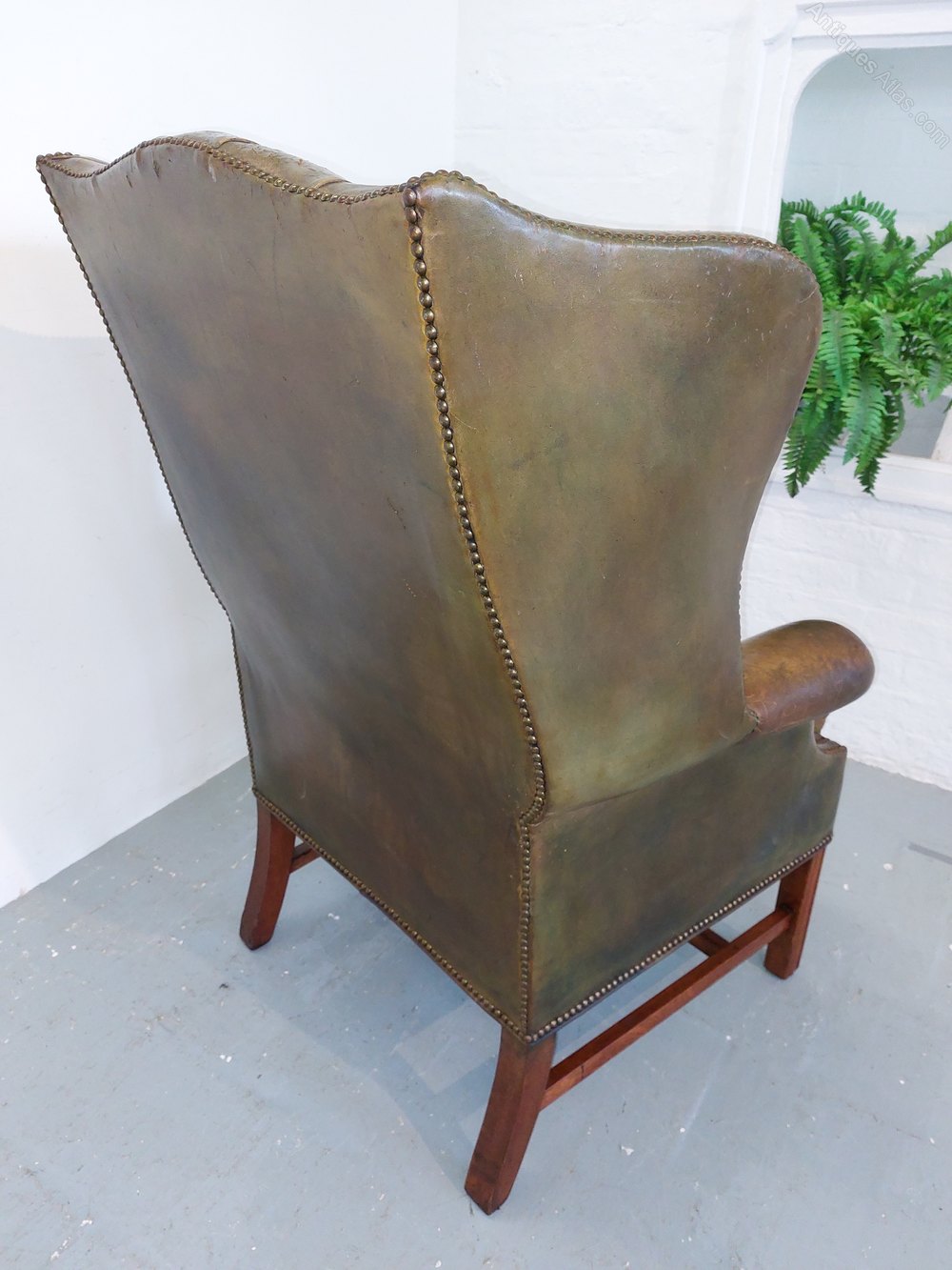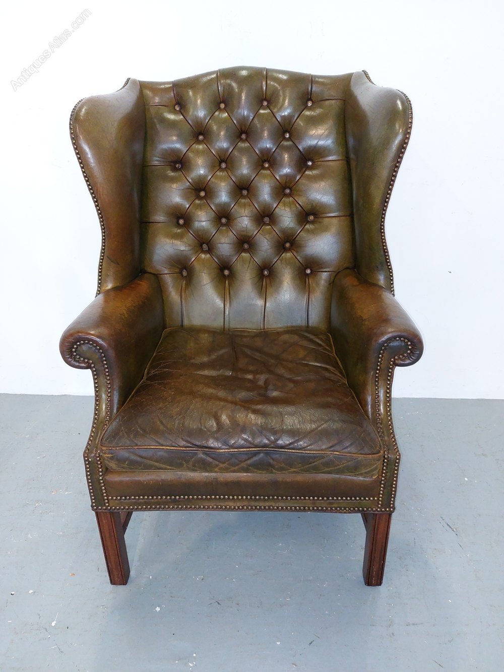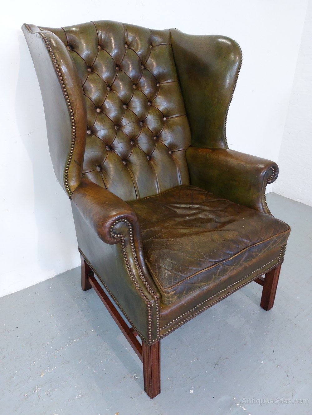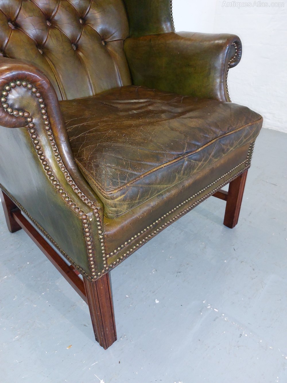 A very substantial olive green hide gentlemens library chair. Dating from the early 1900s with colour and wear to die for. No rips just lovely aged patina. Standing on square moulded polished mahogany supports with a cross stretcher. Deep buttoned back with brass studding throughout. Very deep wings. Chair 32" wide x 31" deep x 47" high. Seat 24" wide x 20" deep.