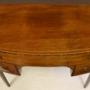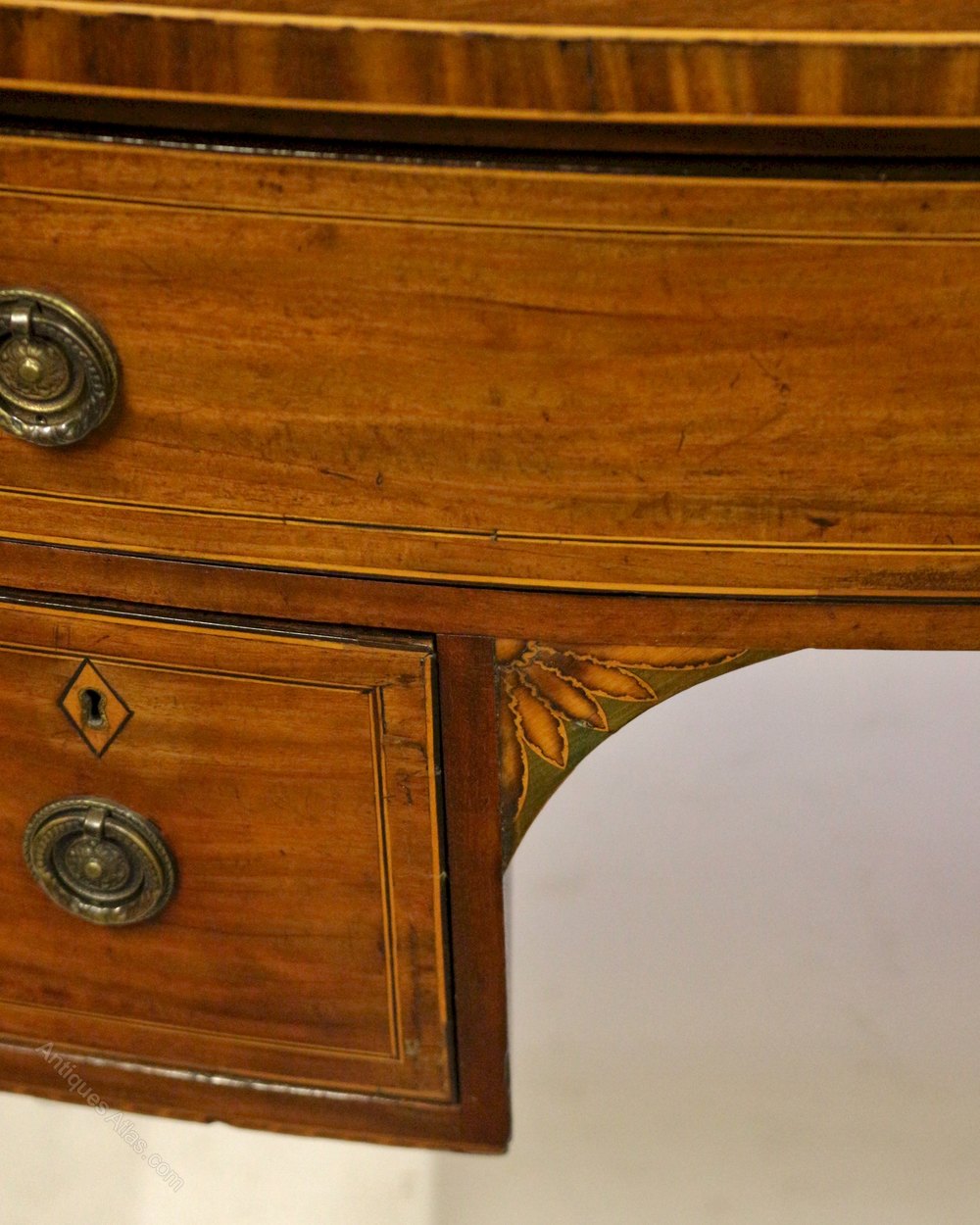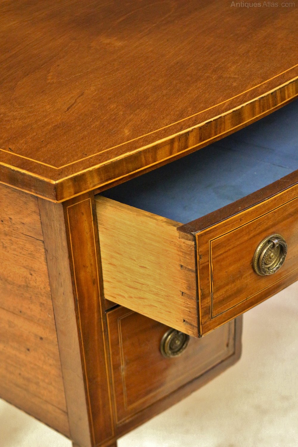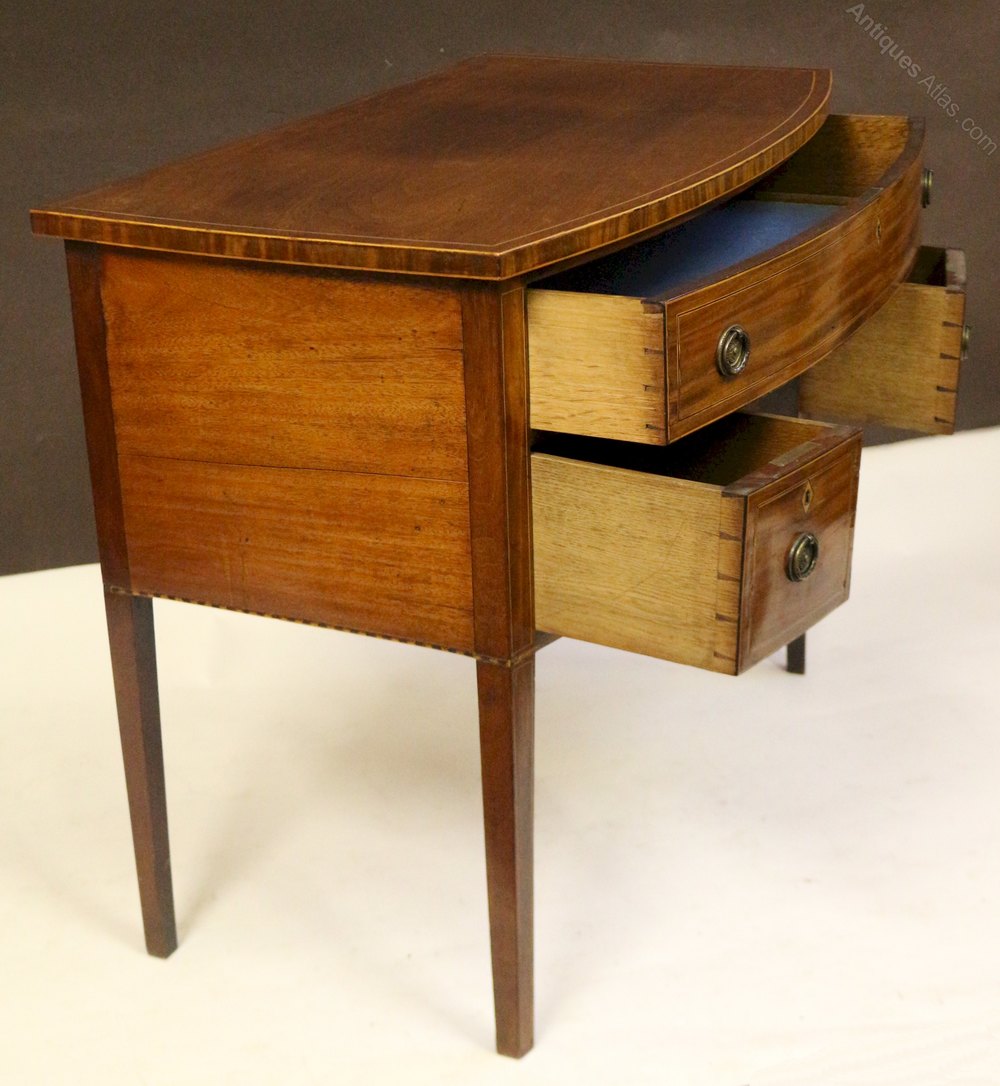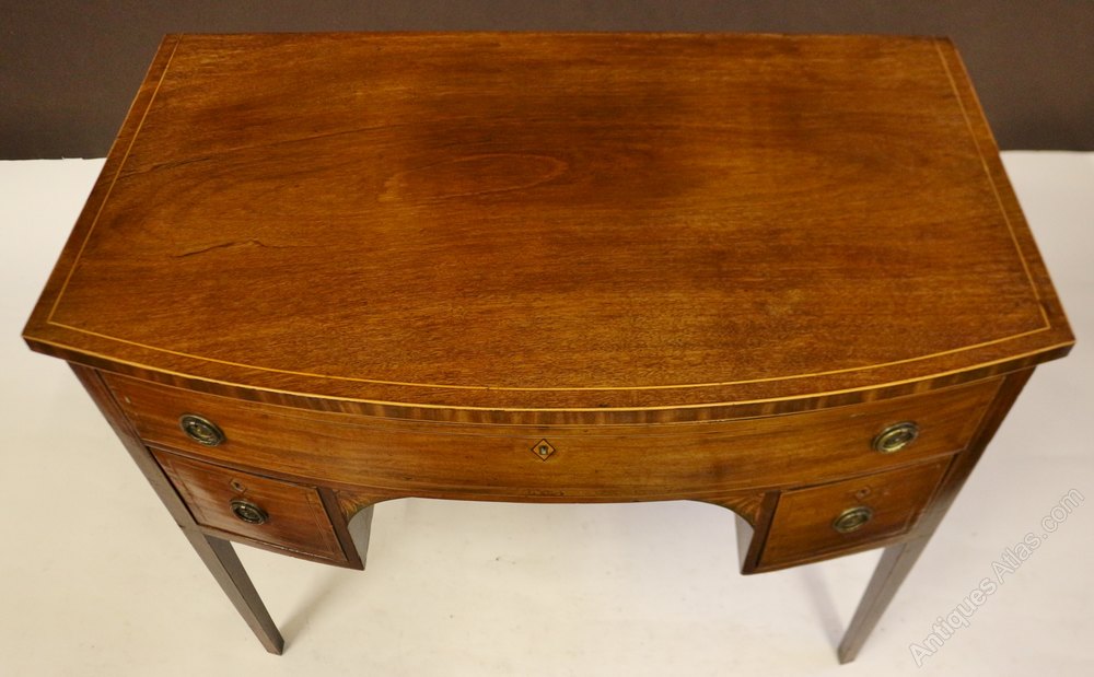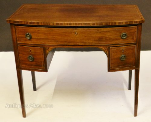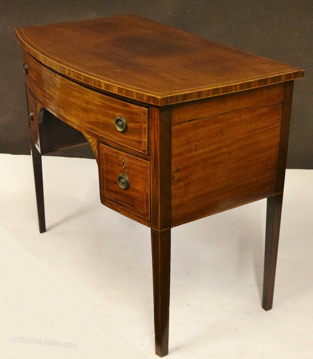 George 111 Mahogany Inlaid Bowfront 3 Drawer Kneehole Side Table. The top having an inner boxwood line inlay and outline edge stringing to top and lower edge. The sides of top are cross veneered. The long oak lined drawer below having boxwood and ebony stringing and outline stringing. Also having diamond shaped boxwood escutcheons and replaced brass ring handles. Two conforming short drawers below flanking the kneehole which has leaf inlays to the corner brackets. The flanking corner stiles having line inlays. A outline chequer stringing running around the lower edge font and sides. All on line inlaid square tapered legs.